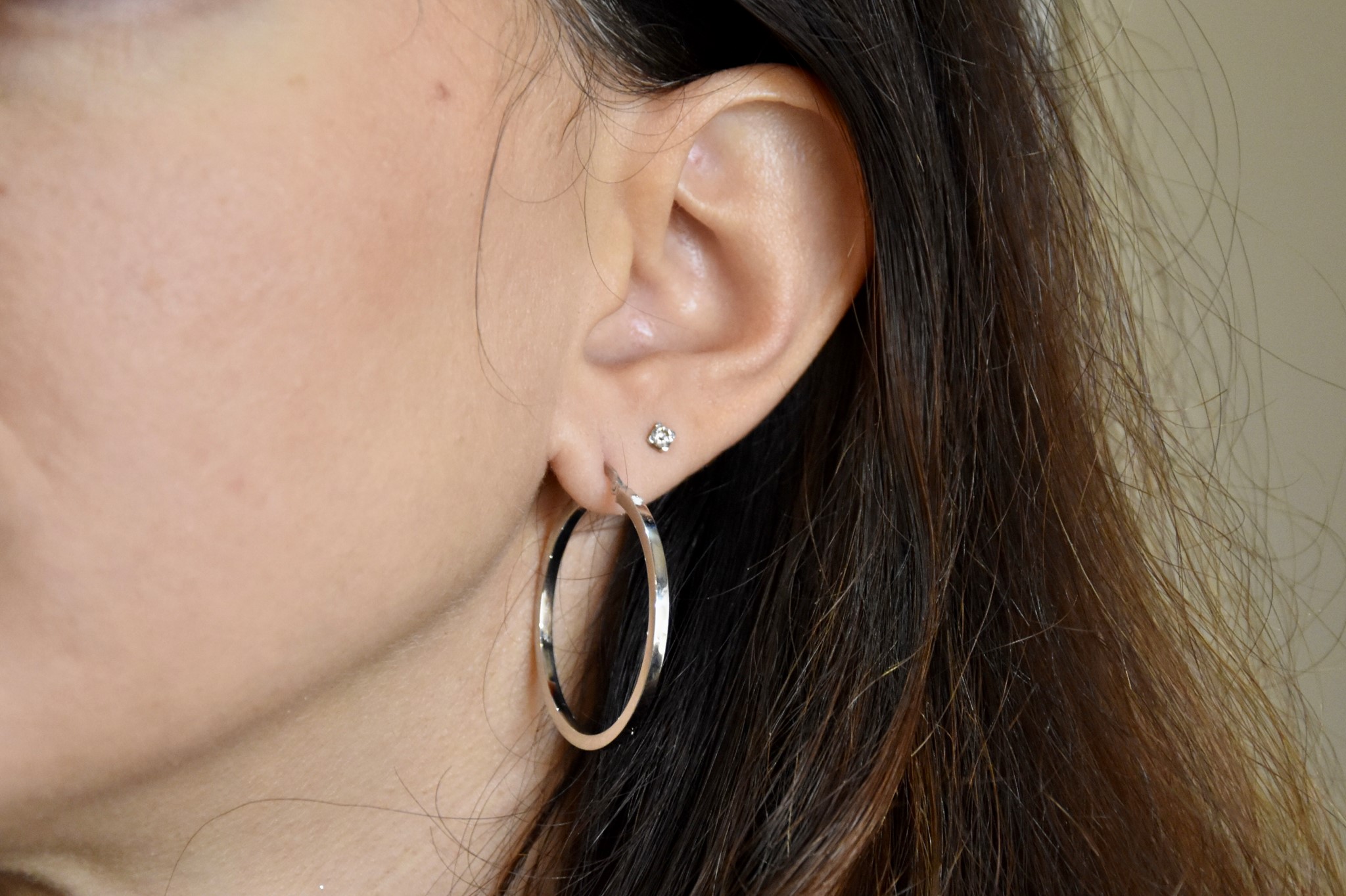 Orecchini a cerchio squadrati in oro bianco 750/00. Diametro 3,40cm. Spessore 0,2cm. Peso 2,60g.