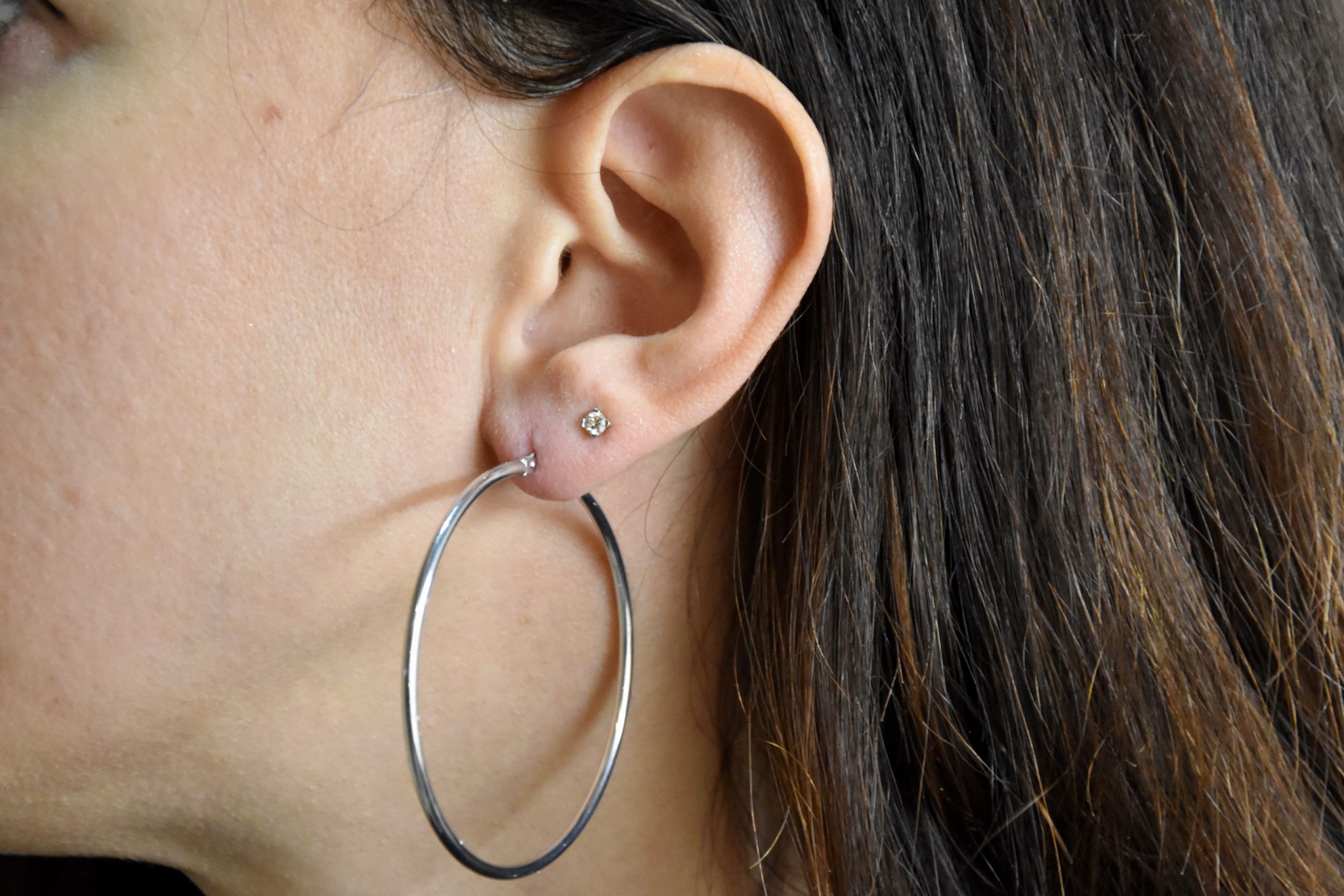 Orecchini a cerchio in oro bianco 750/00. Diametro 5,50cm. Spessore 0,15cm. Peso 3,50g.