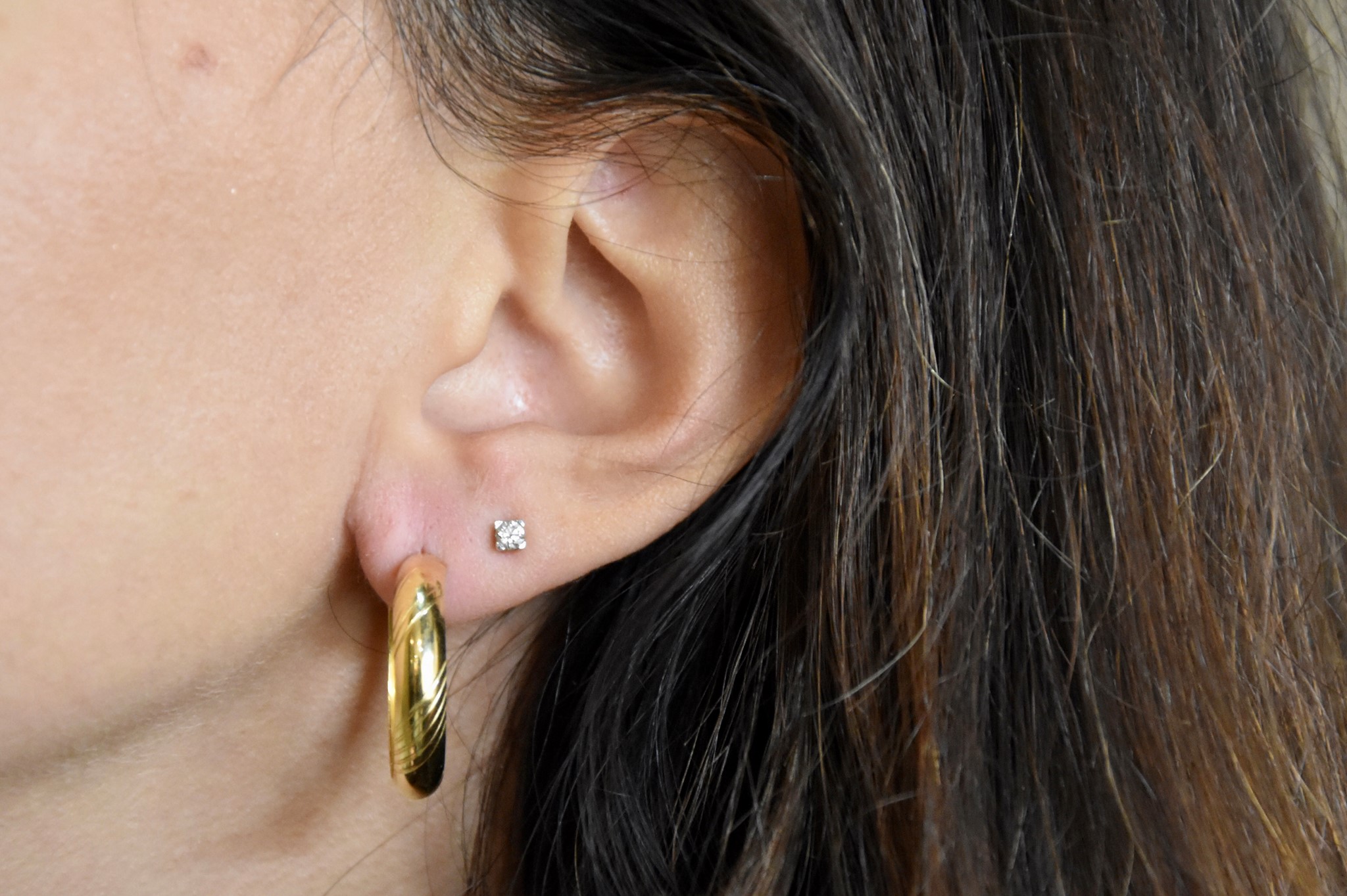 Orecchini a cerchio in oro giallo 750/00. Diametro 2,50cm. Spessore 0,40cm (cavi). Peso 3,90g.