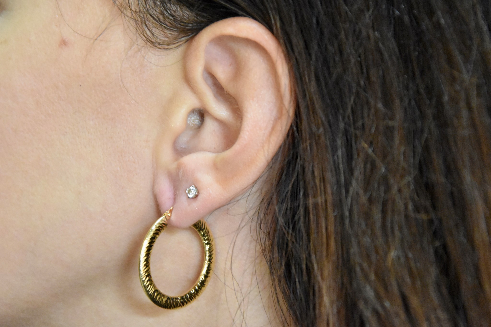 Orecchini a cerchio sfacettati in oro giallo 750/00. Diametro 2,80cm. Spessore 0,35cm. Peso 2,90g.