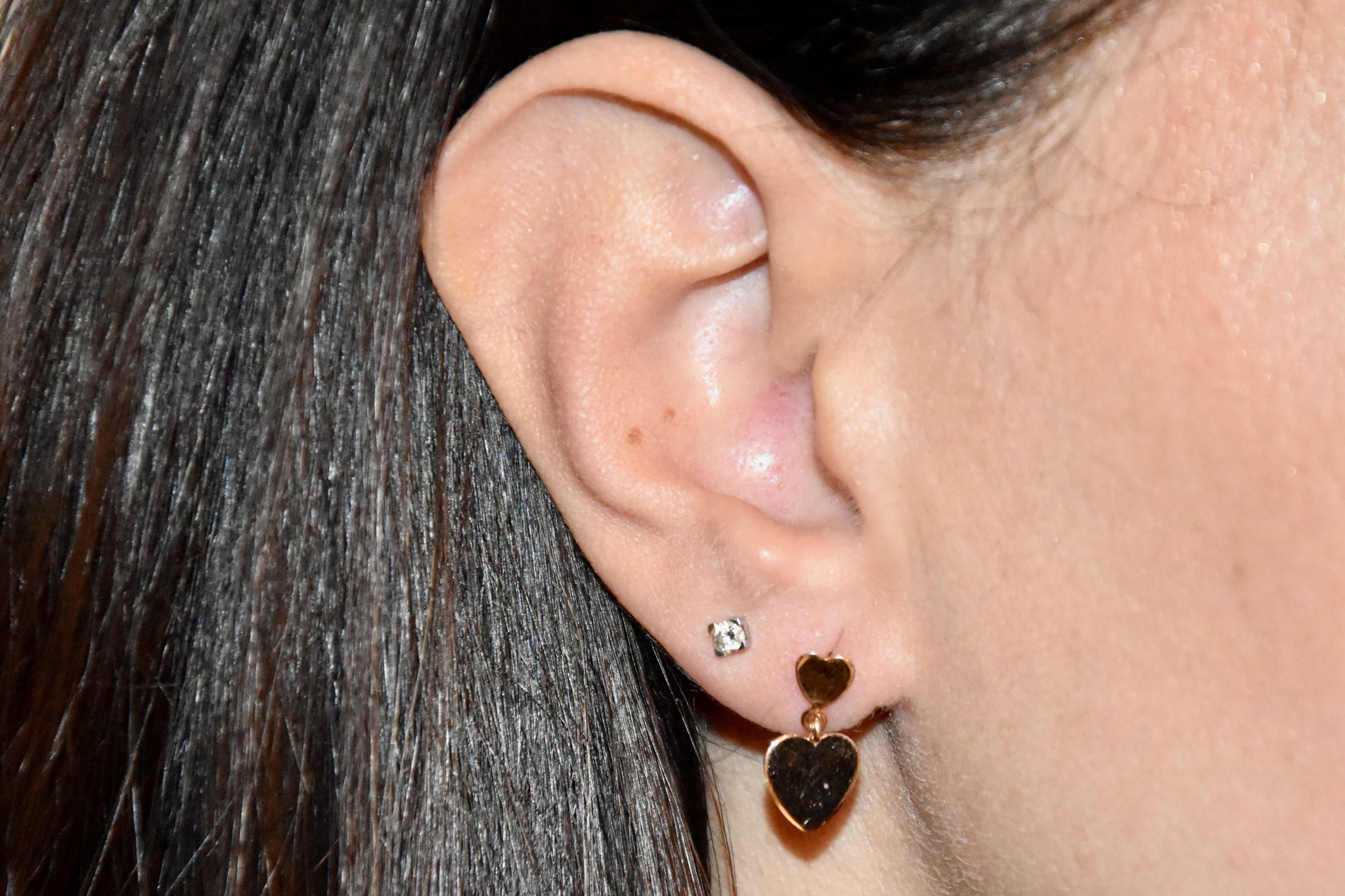 Orecchini cuori pendenti in oro rosa 750/00. Lunghezza 1,60cm. Peso 1,65g.