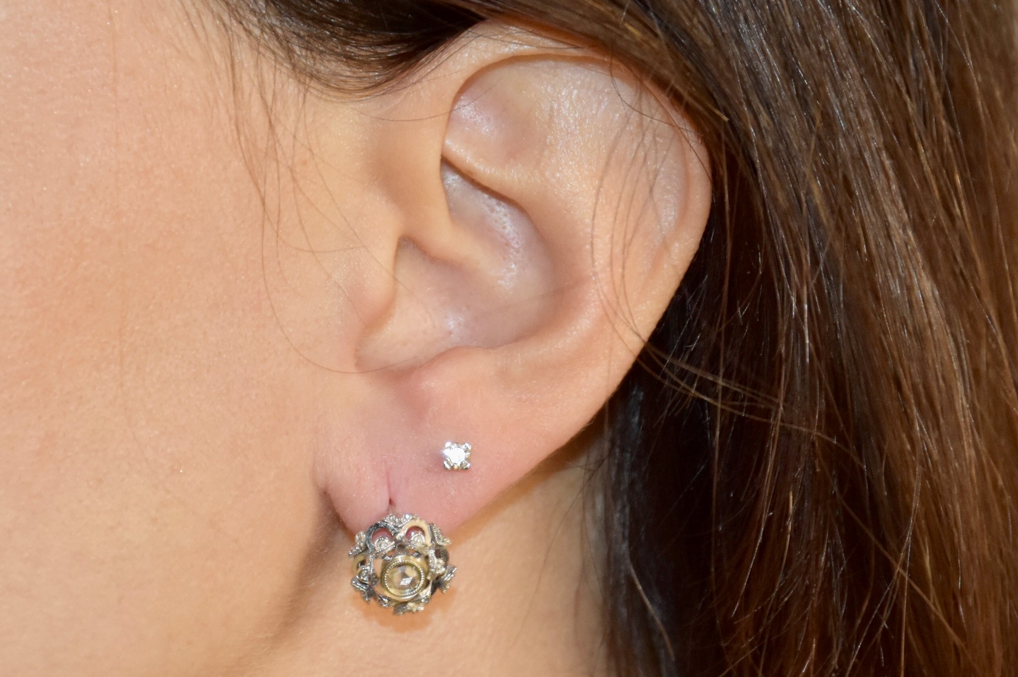 Orecchini a ceretta in oro bianco 750/00 con diamanti taglio rosetta. Peso orecchini 4,85g.