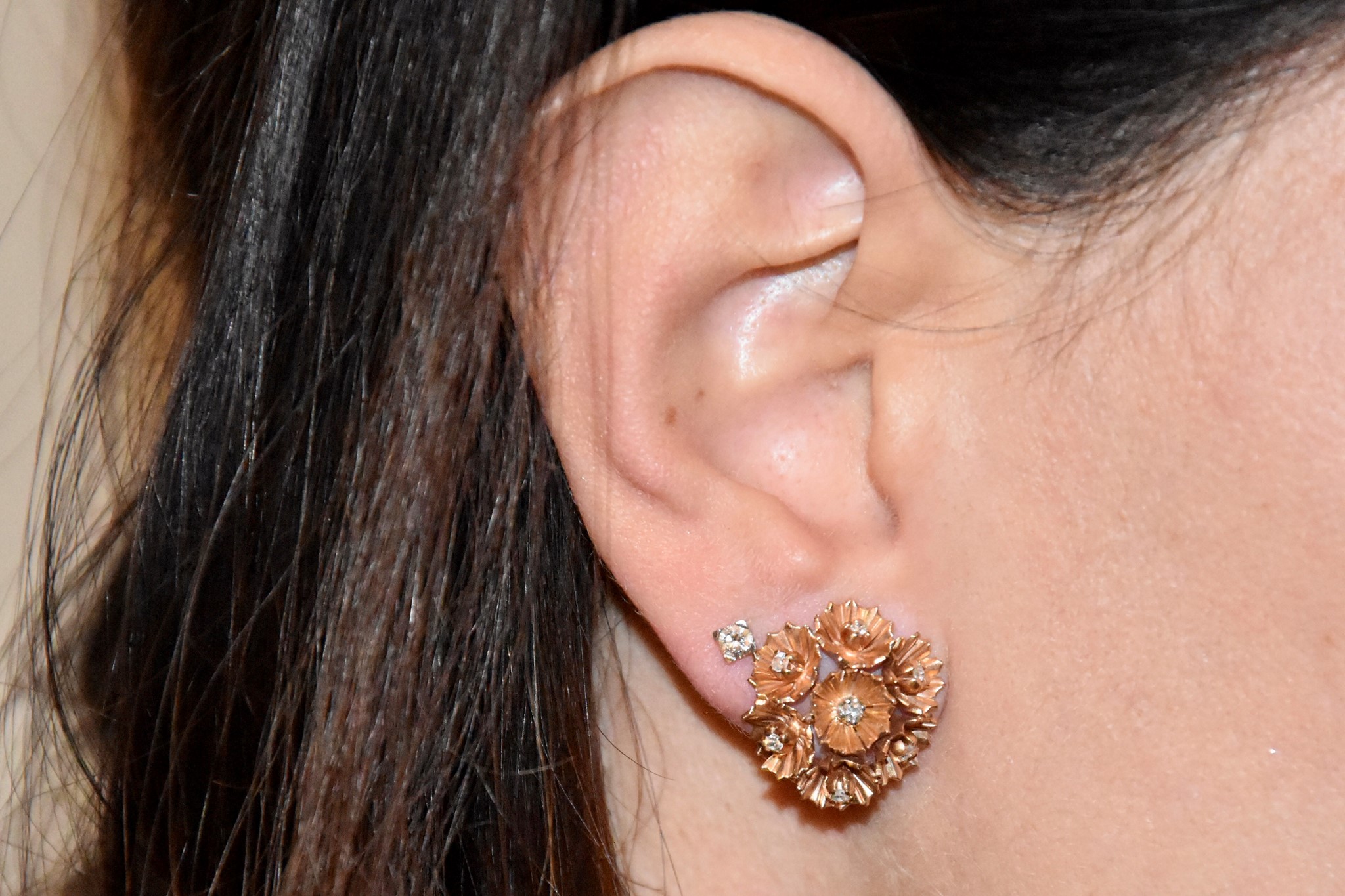 Orecchini fiore in oro giallo 750/00 con diamantini taglio huit-huit tot. 0,14ct con perno e clip. Diametro orecchini 1,80cm. Peso 8,20g.