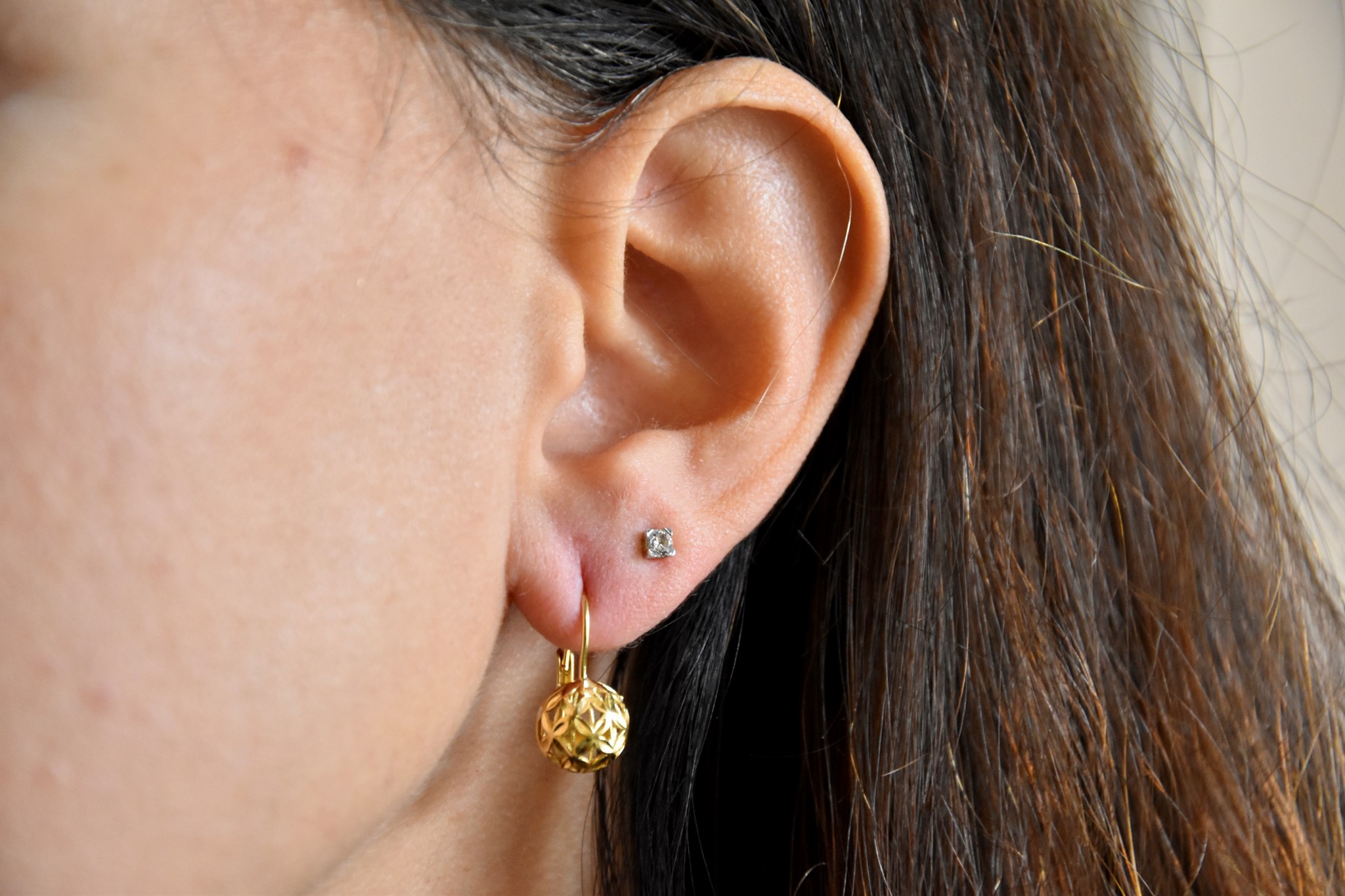 Orecchini a monachella in oro giallo 750/00 con sfaccettature a laser. Peso 2,90g.