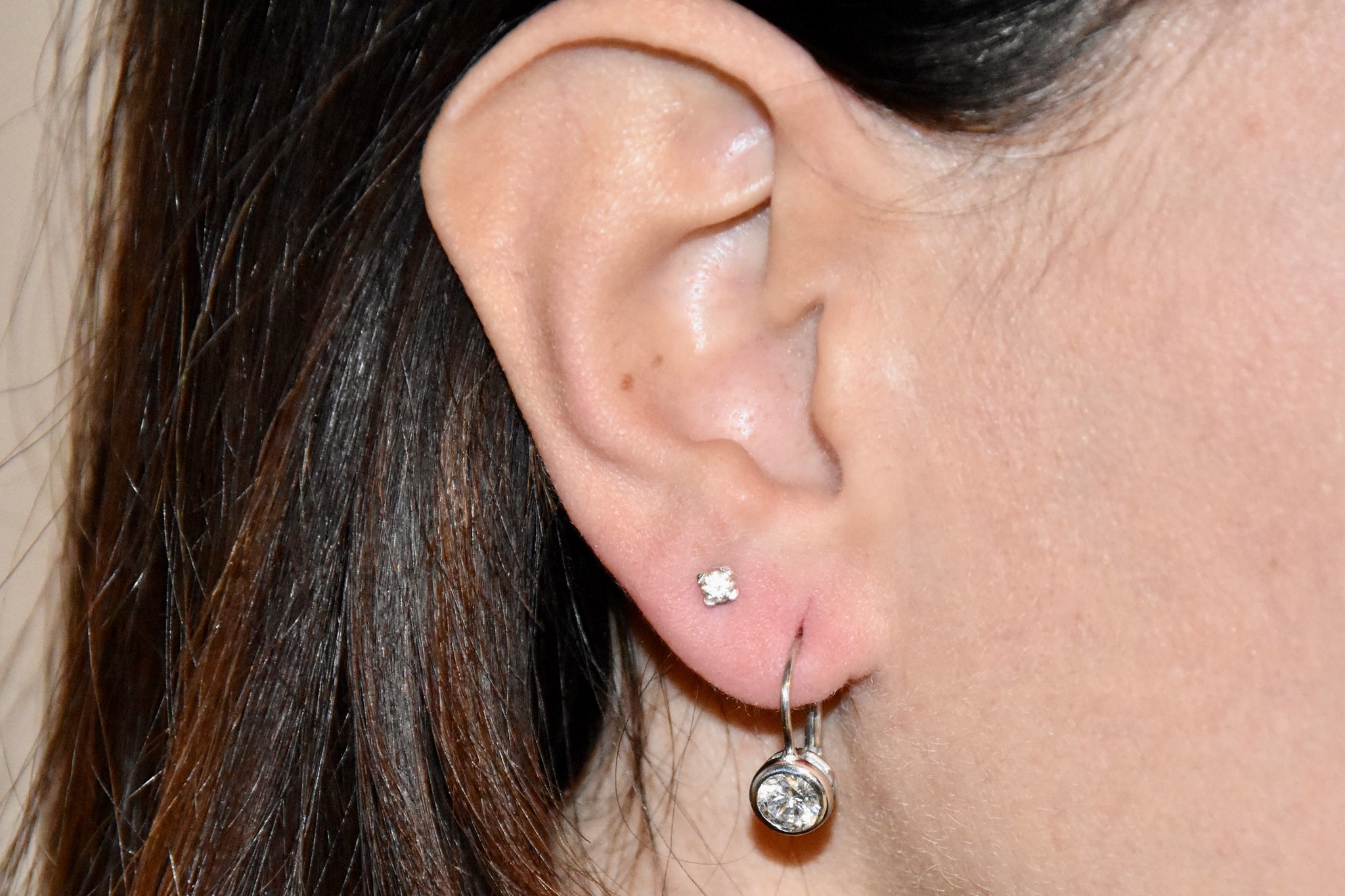 Orecchini a monachella in oro bianco 750/00 con zirconi. Peso orecchini g. 3,70.