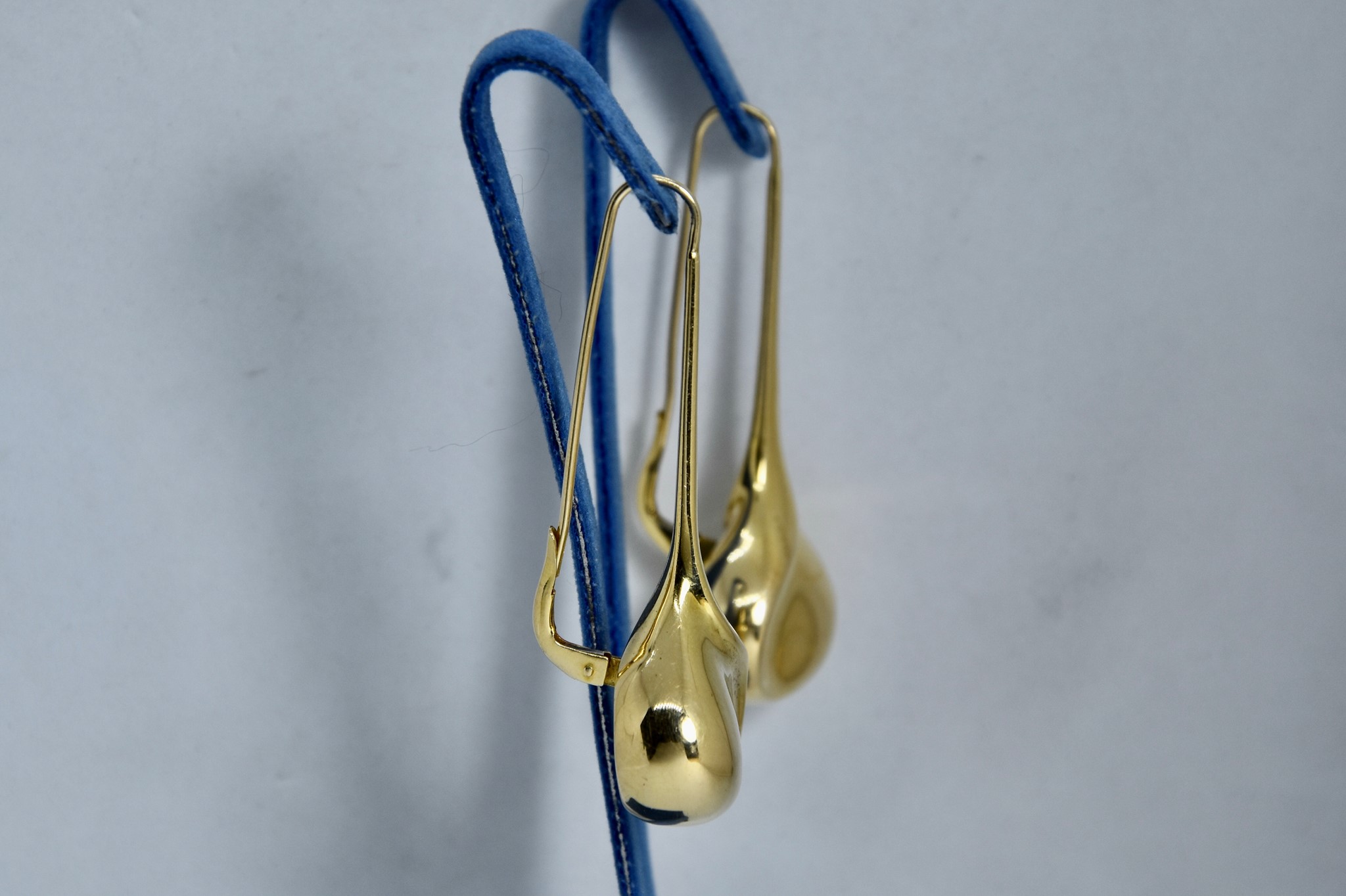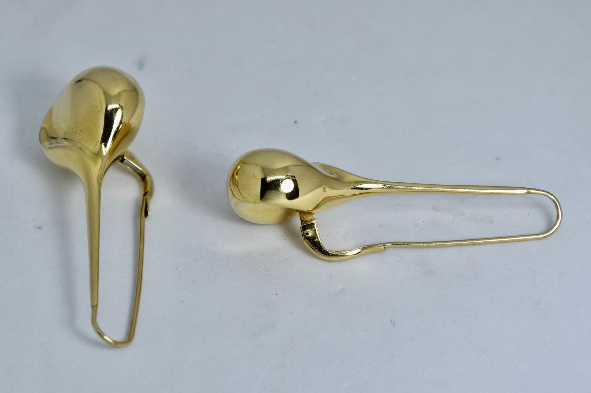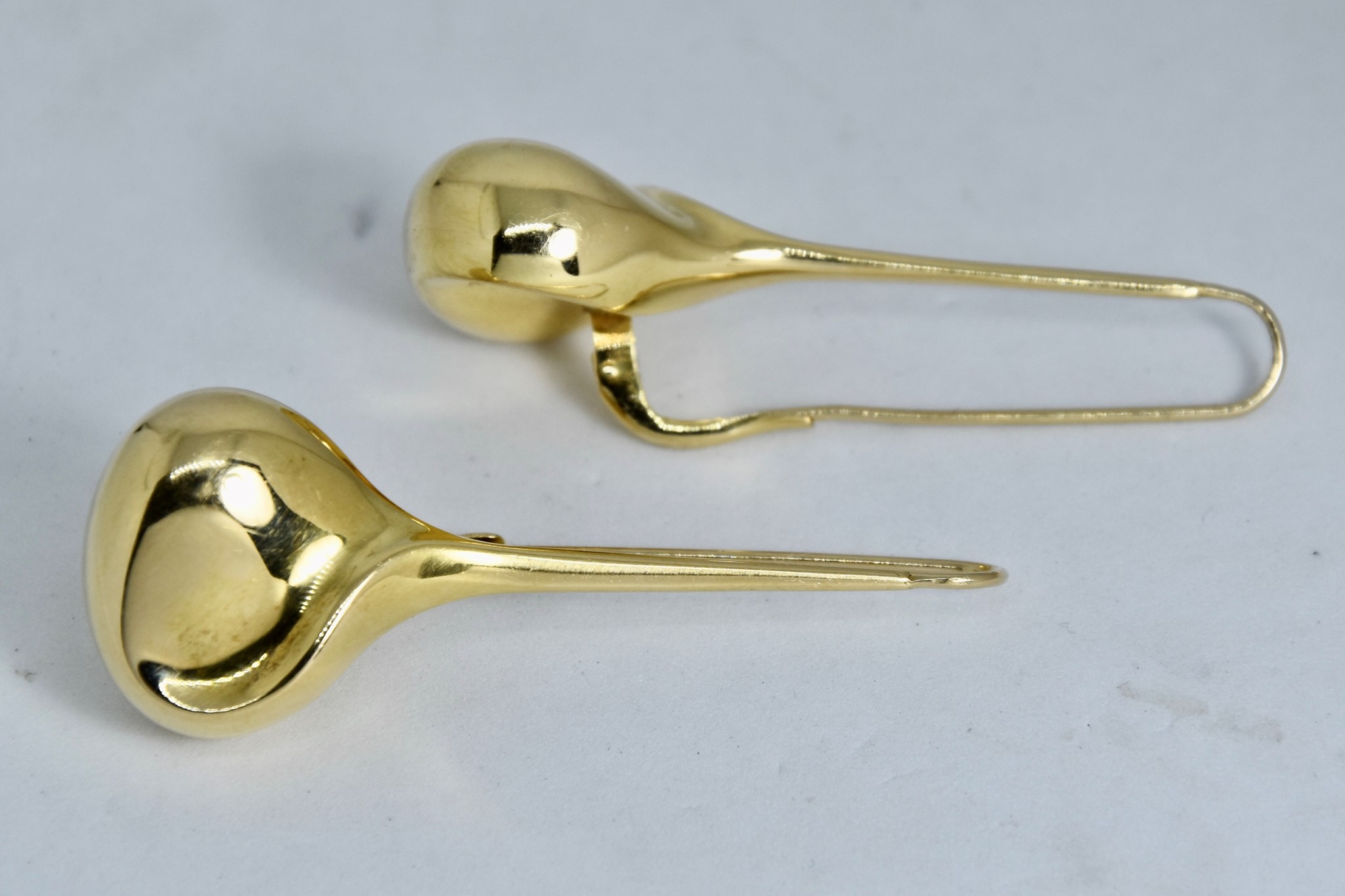 Orecchini pendenti a goccia in oro giallo 750/00 della lunghezza di 5,60cm, diametro goccia 2,10cm. Peso 14,70.