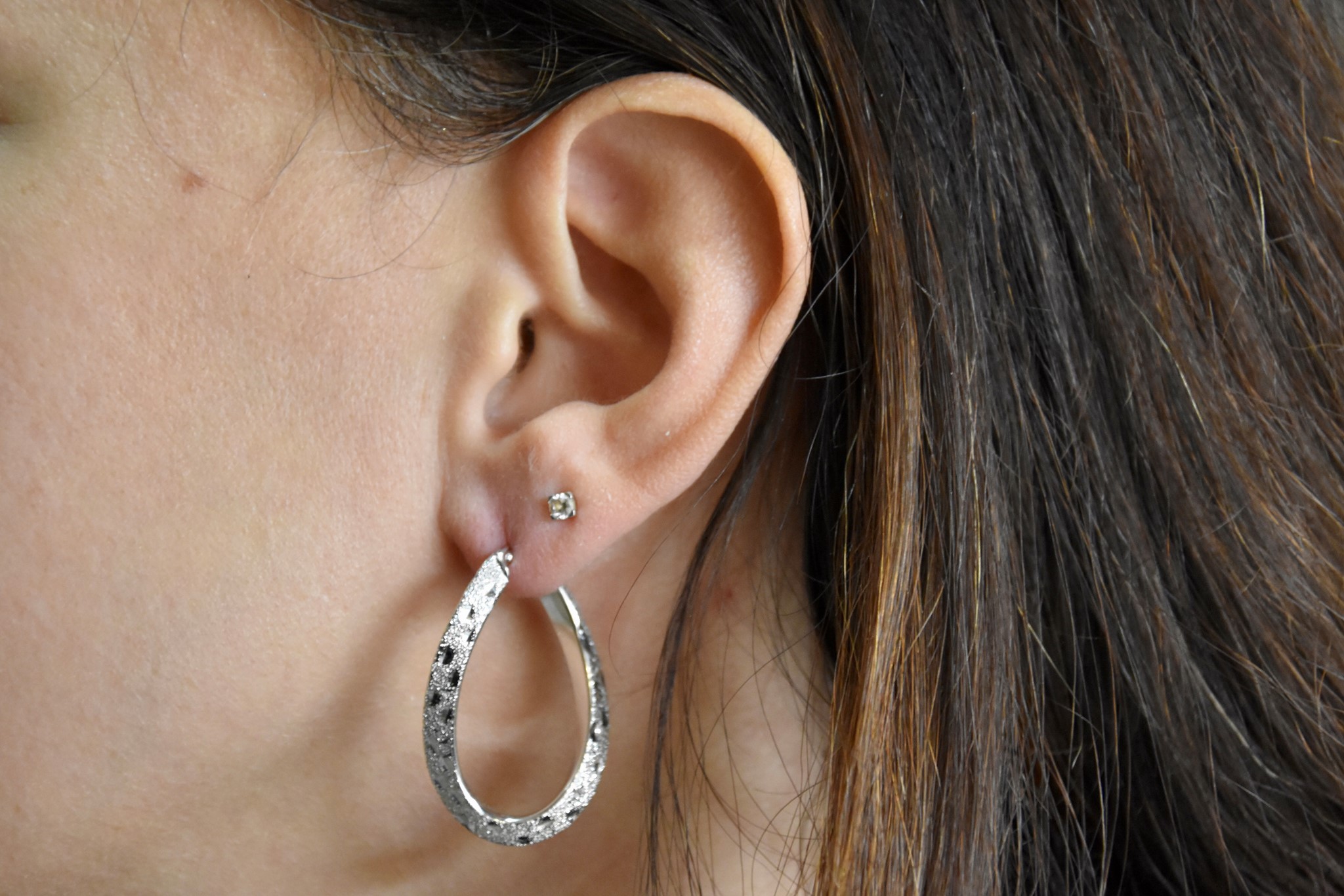 Verette a schiava ovali in oro bianco 750/00 lucido e satinato, canna vuota lunghi cm. 3,65; larghi 2,40, canna a base triangolare mm. 2,50. Peso g. 4,60.