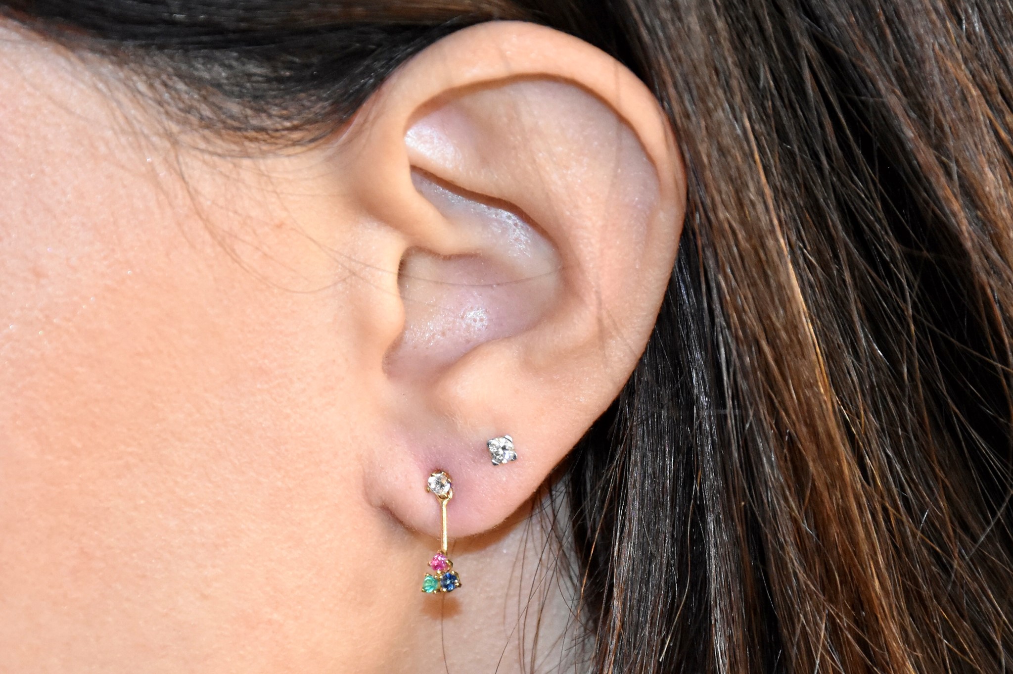 Orecchini in oro giallo 750/00 con pietre colorate sintetiche. Peso orecchini 0,70g.