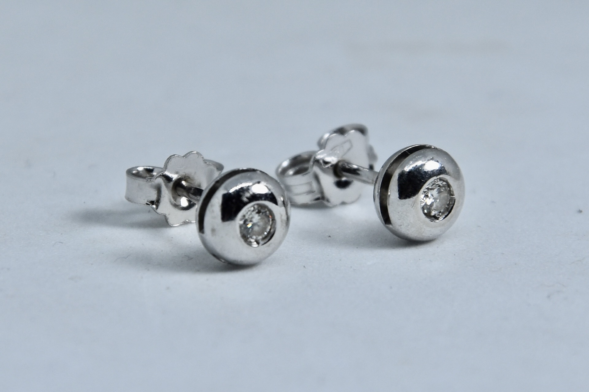 Orecchini puntoluce in oro bianco 750/00 con circa 0,08ct totali di diamanti taglio brillante; G/H color; VS2. Peso 1,85g.