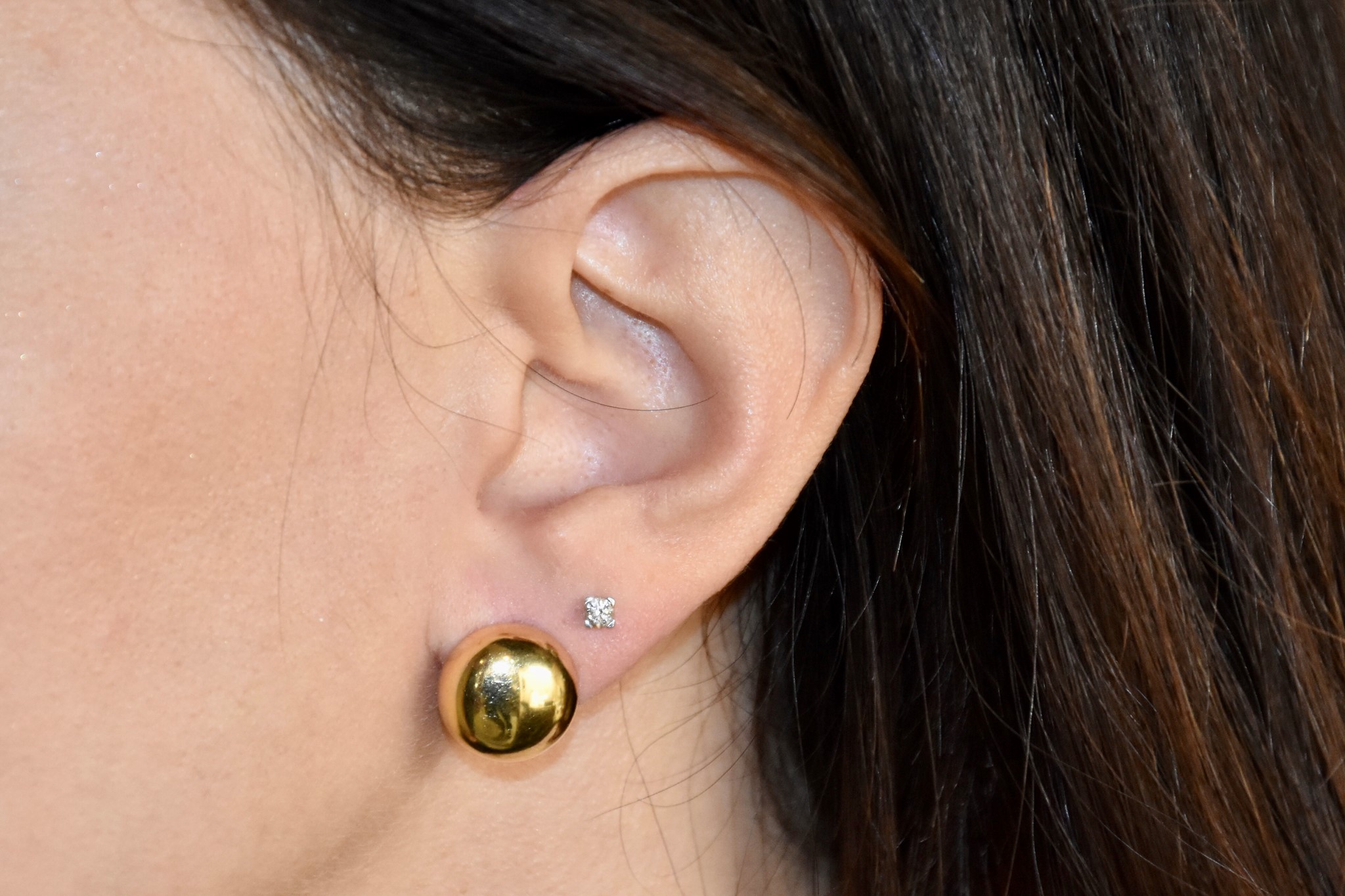Orecchini sfera in oro giallo 750/00 con perno e clip. Diametro orecchini 1,35cm (un'orecchino ha un piccolo colpo). Peso 5,05g.
