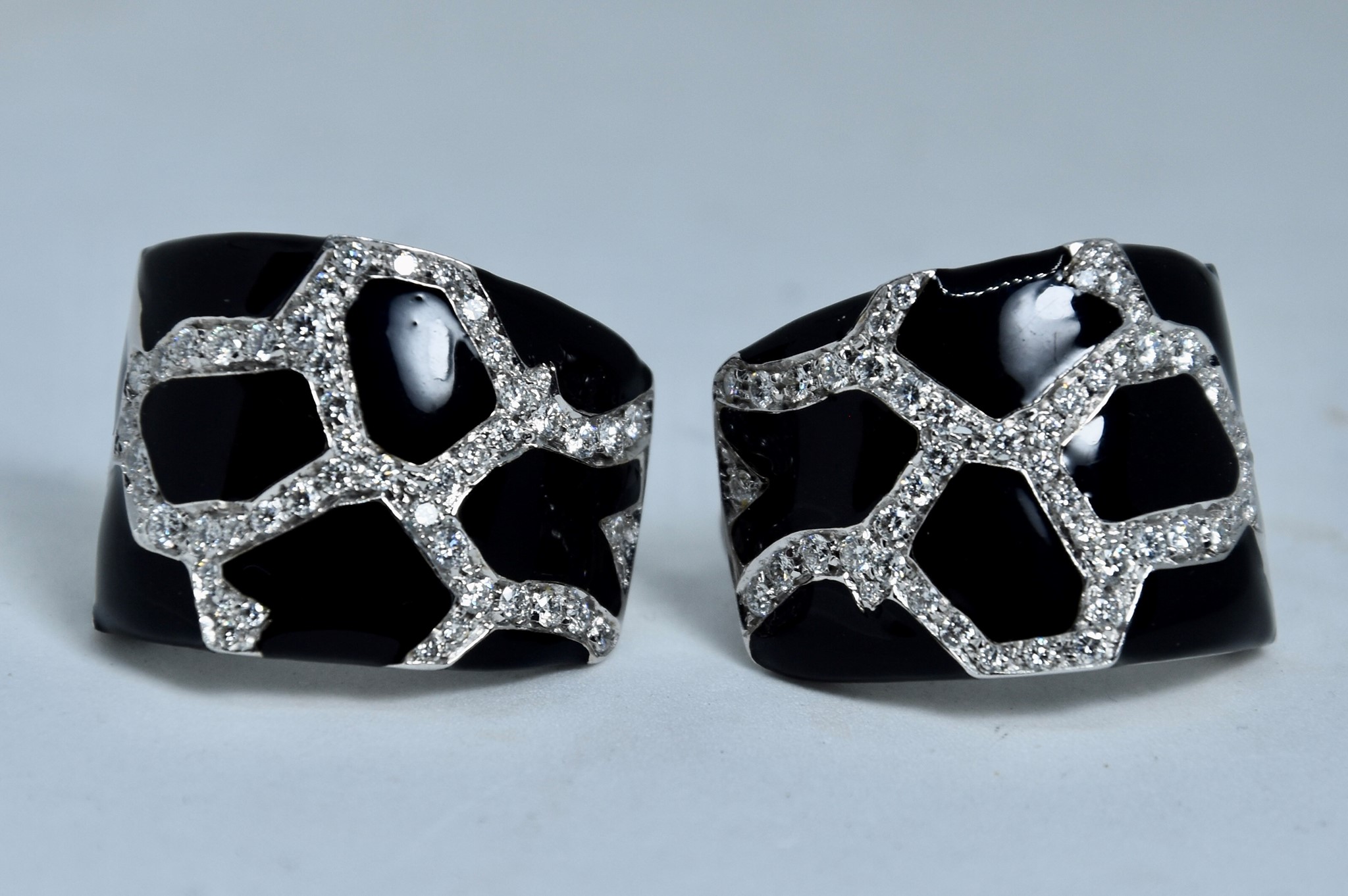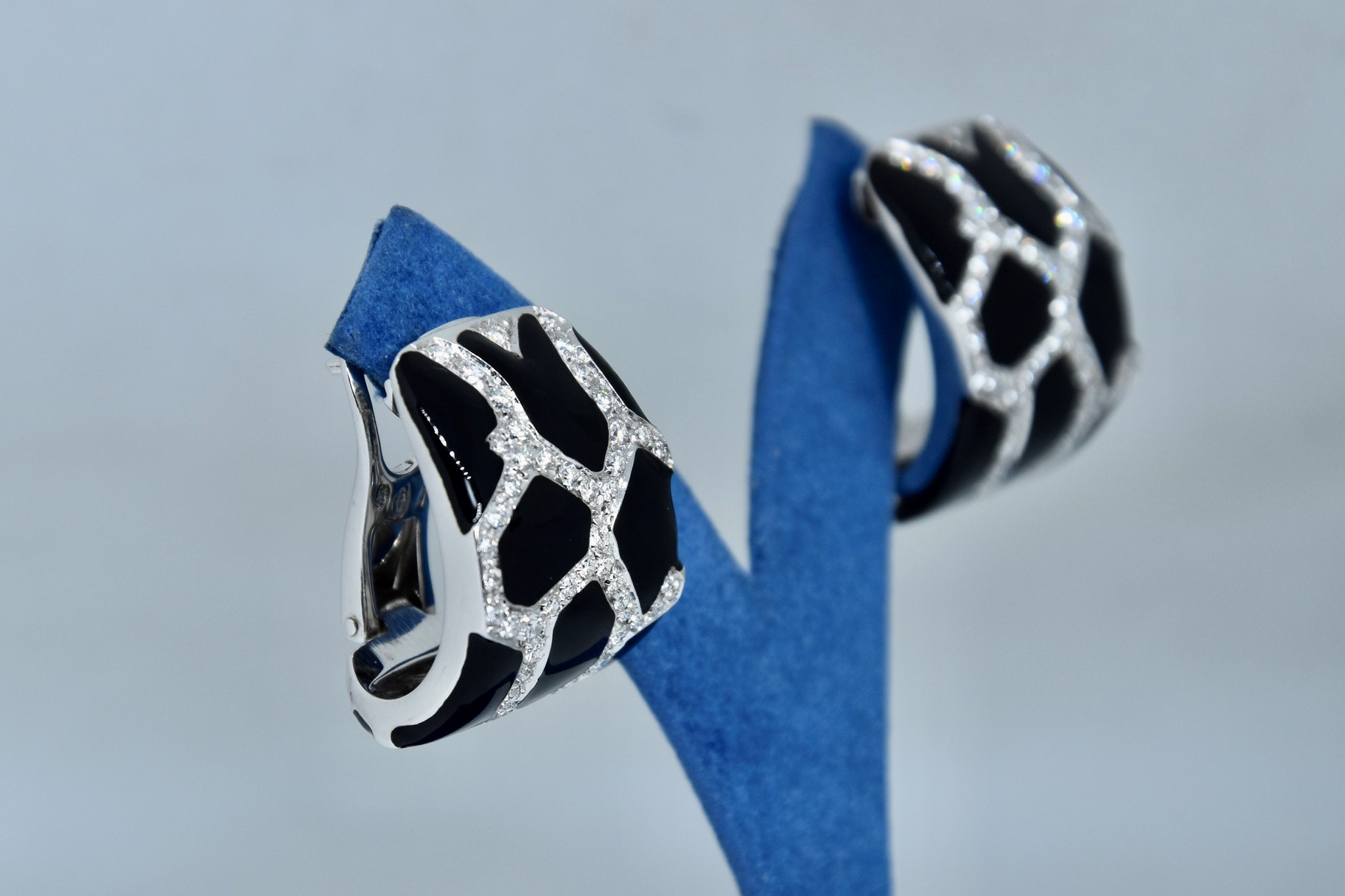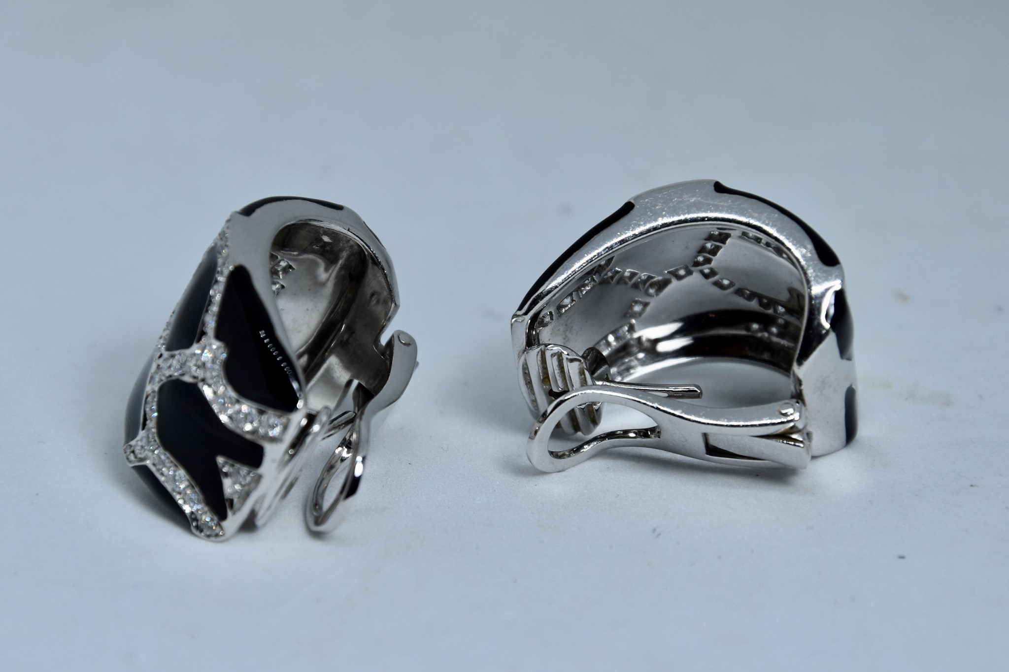 Orecchini Roberto Legnazzi in oro bianco 750/00. Lavorazione strepitosa che gioca con il contrasto dello smalto nero e dei diamanti taglio brillante (circa 1ct totale). Gli orecchini sono a clip hanno un perno che si può muovere e quindi adatti anche per una persona che non ha i buchi. Dimensione orecchini 1,80x2,30cm. Peso 21,40g.