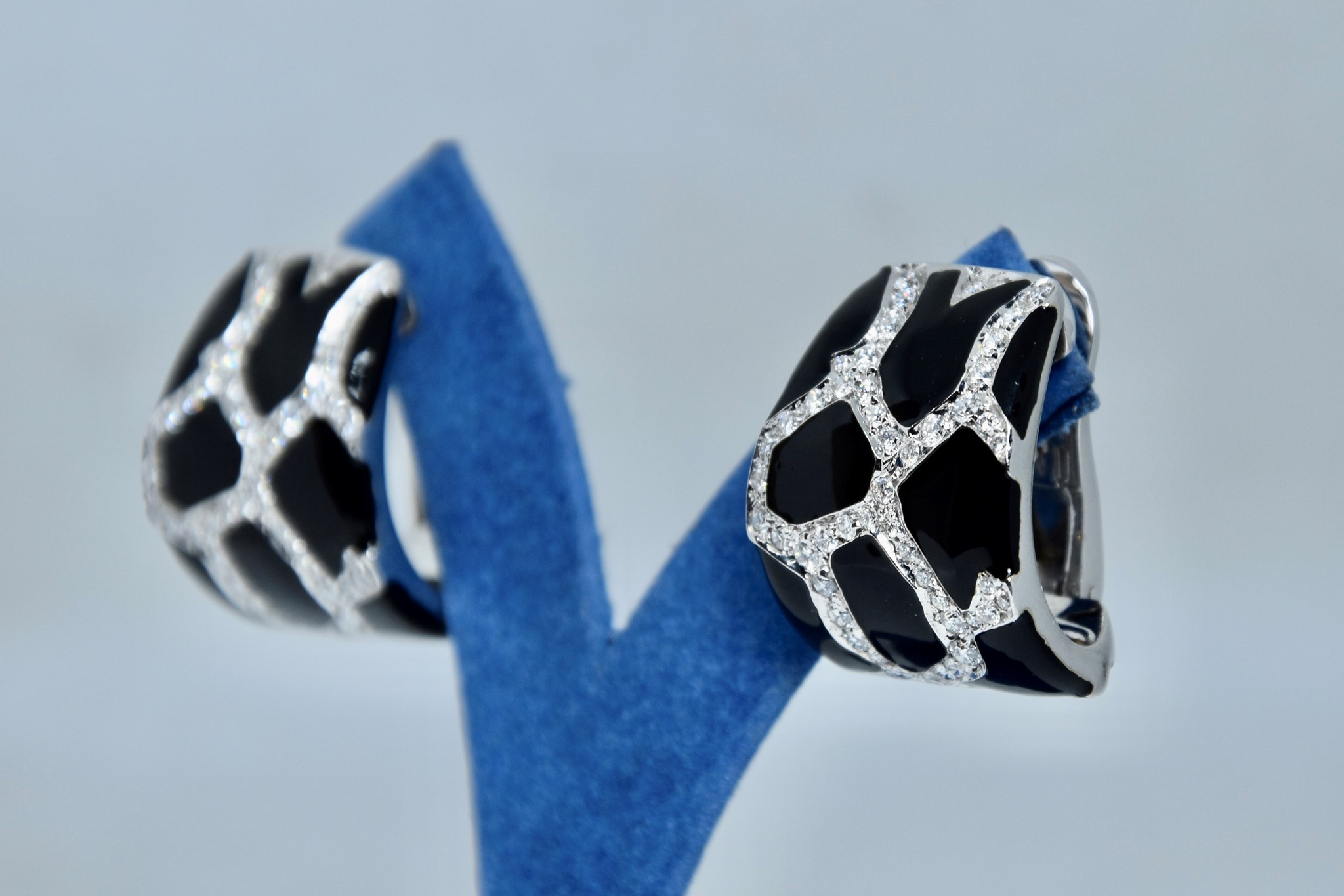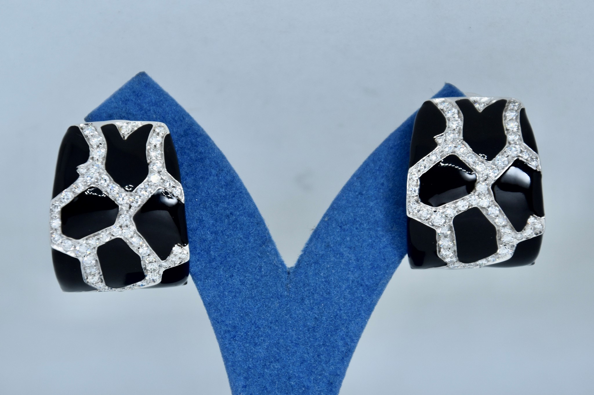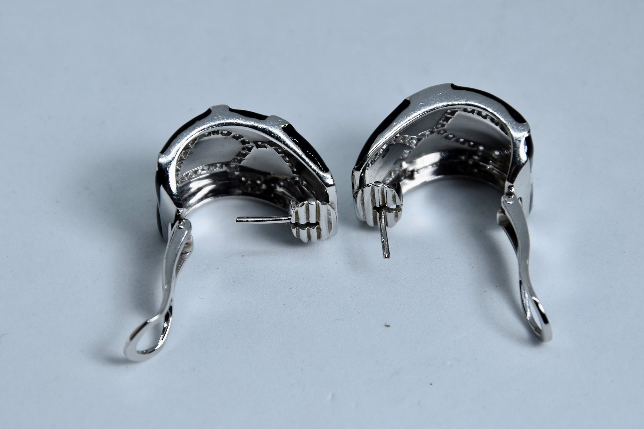 Orecchini Roberto Legnazzi in oro bianco 750/00. Lavorazione strepitosa che gioca con il contrasto dello smalto nero e dei diamanti taglio brillante (circa 1ct totale). Gli orecchini sono a clip hanno un perno che si può muovere e quindi adatti anche per una persona che non ha i buchi. Dimensione orecchini 1,80x2,30cm. Peso 21,40g.