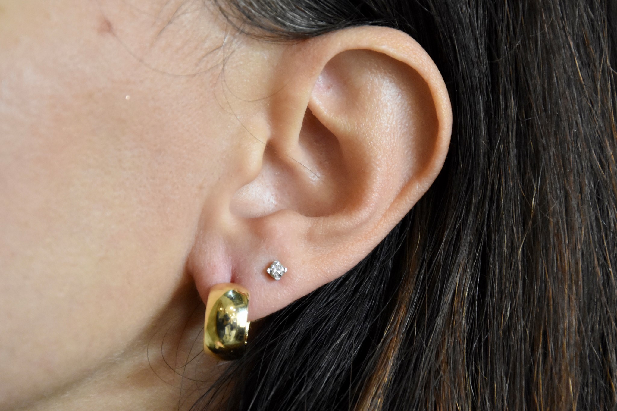 Orecchini vere in oro giallo 750/00 dal diametro interno di 1,00cm e spessore 0,70cm. Peso 4,40g.