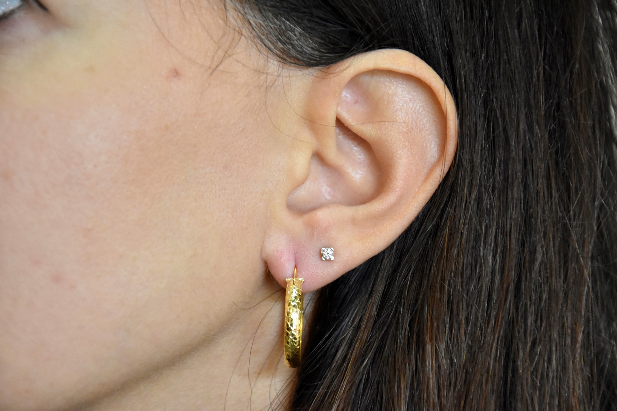 Orecchini a cerchio in oro giallo 750/00 lavorati e cavi all'interno. Diametro 2,20cm. Spessore 0,30cm. Peso 3,20g.