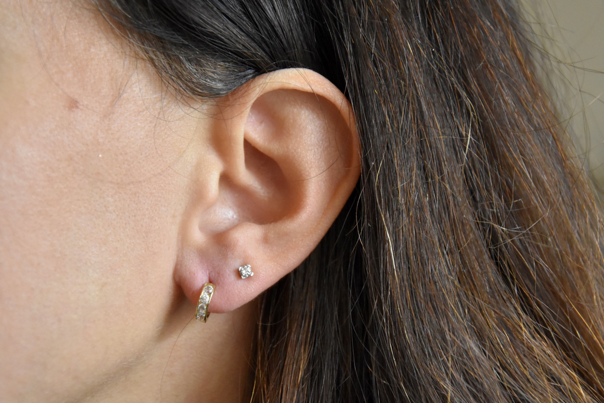 Orecchini erette in oro giallo 750/00 e zirconi. Diametro 1,00cm. Peso 1,20g.