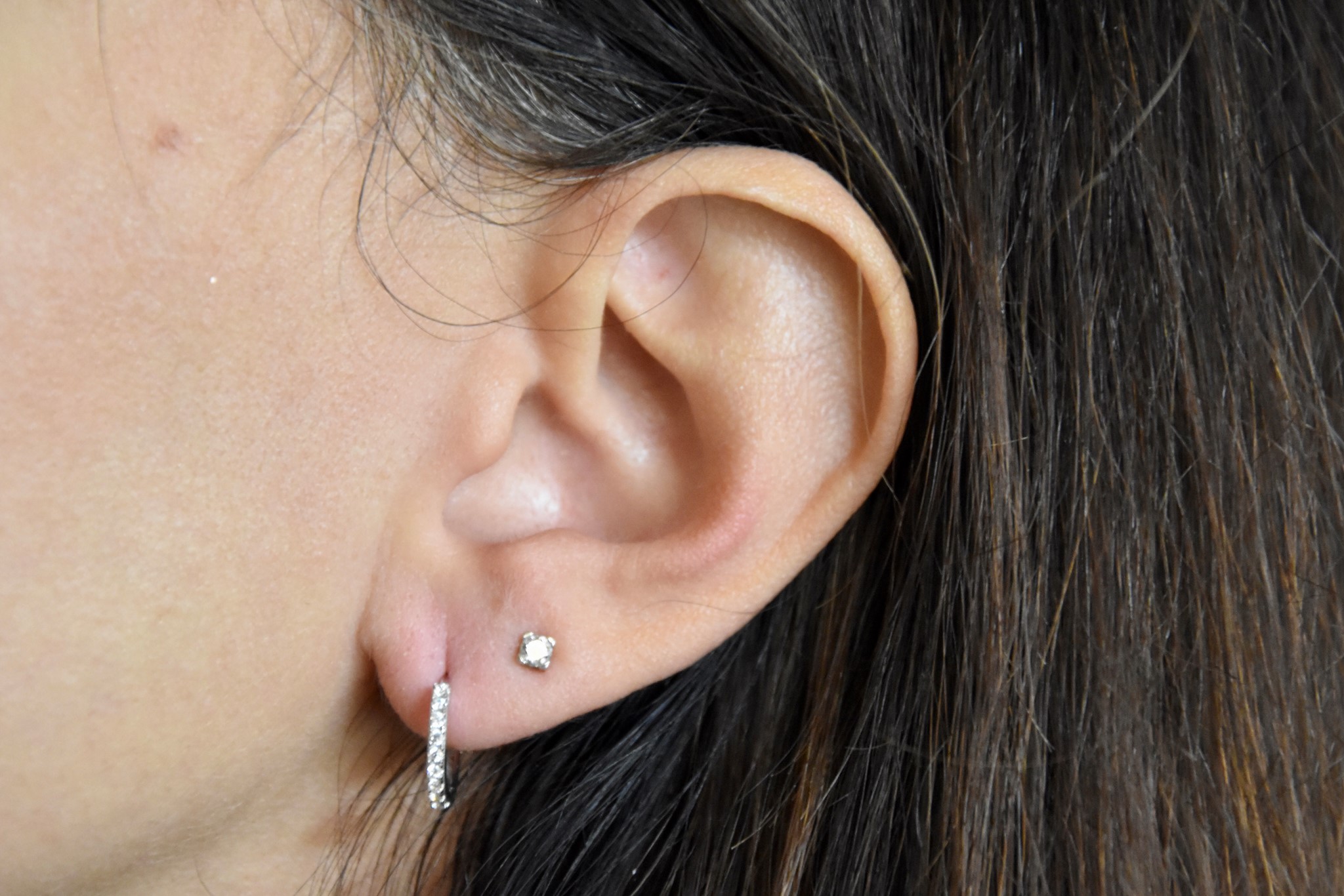 Orecchini verette in oro bianco 750/00 e zirconi. Diametro 1,20cm. Peso 1,60g.