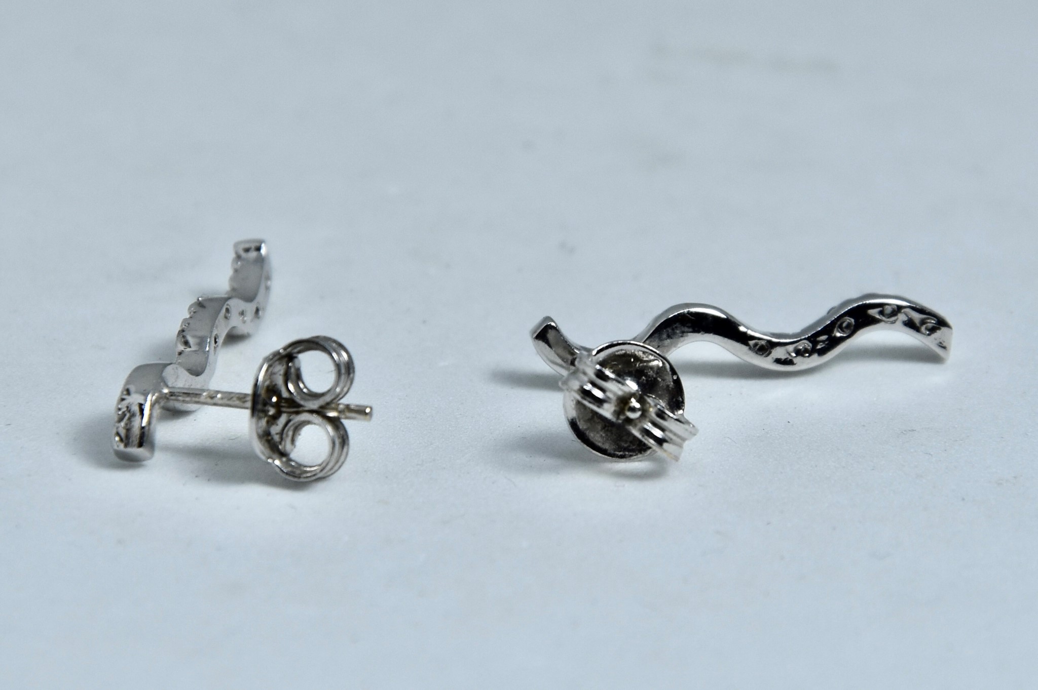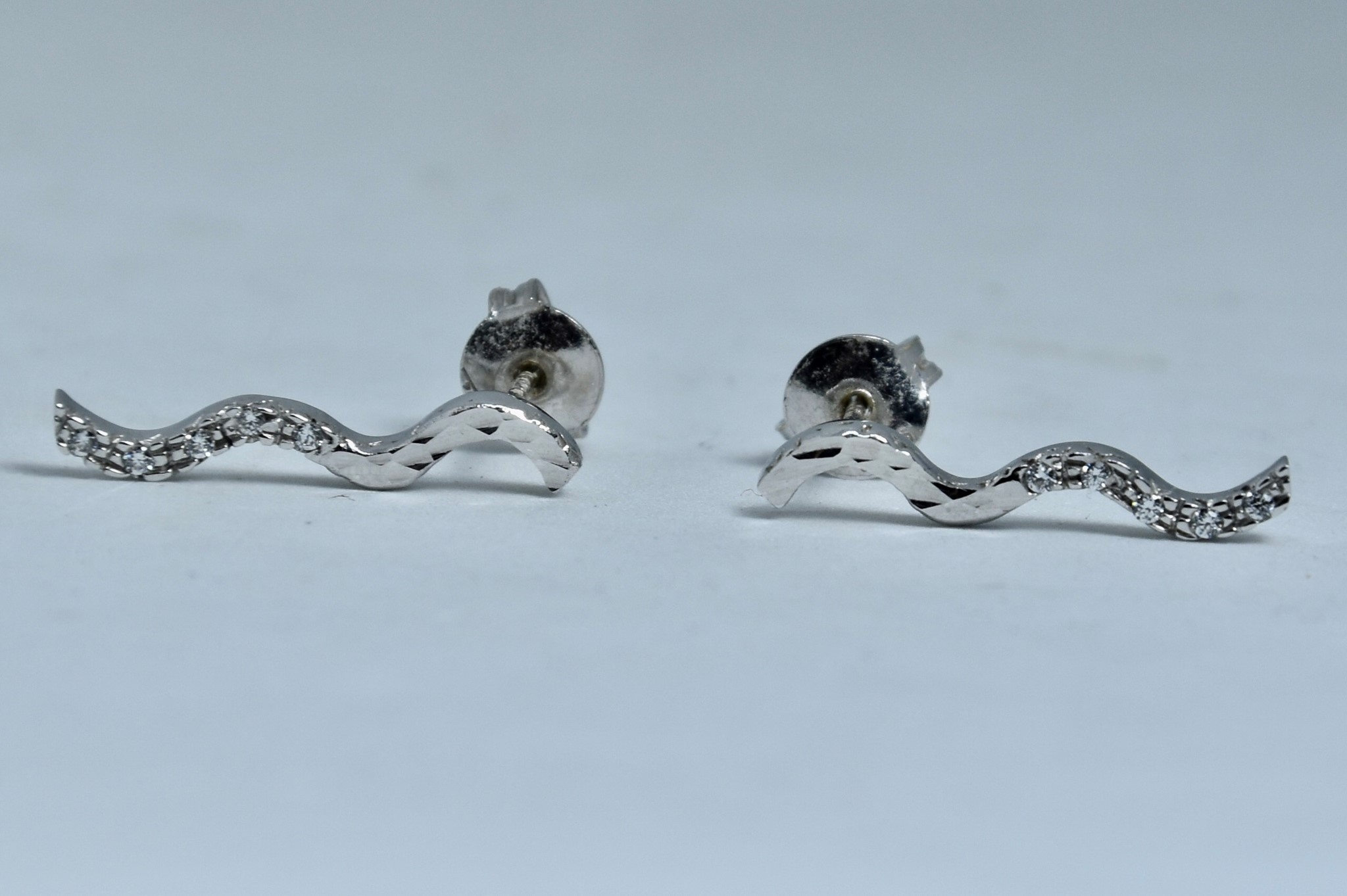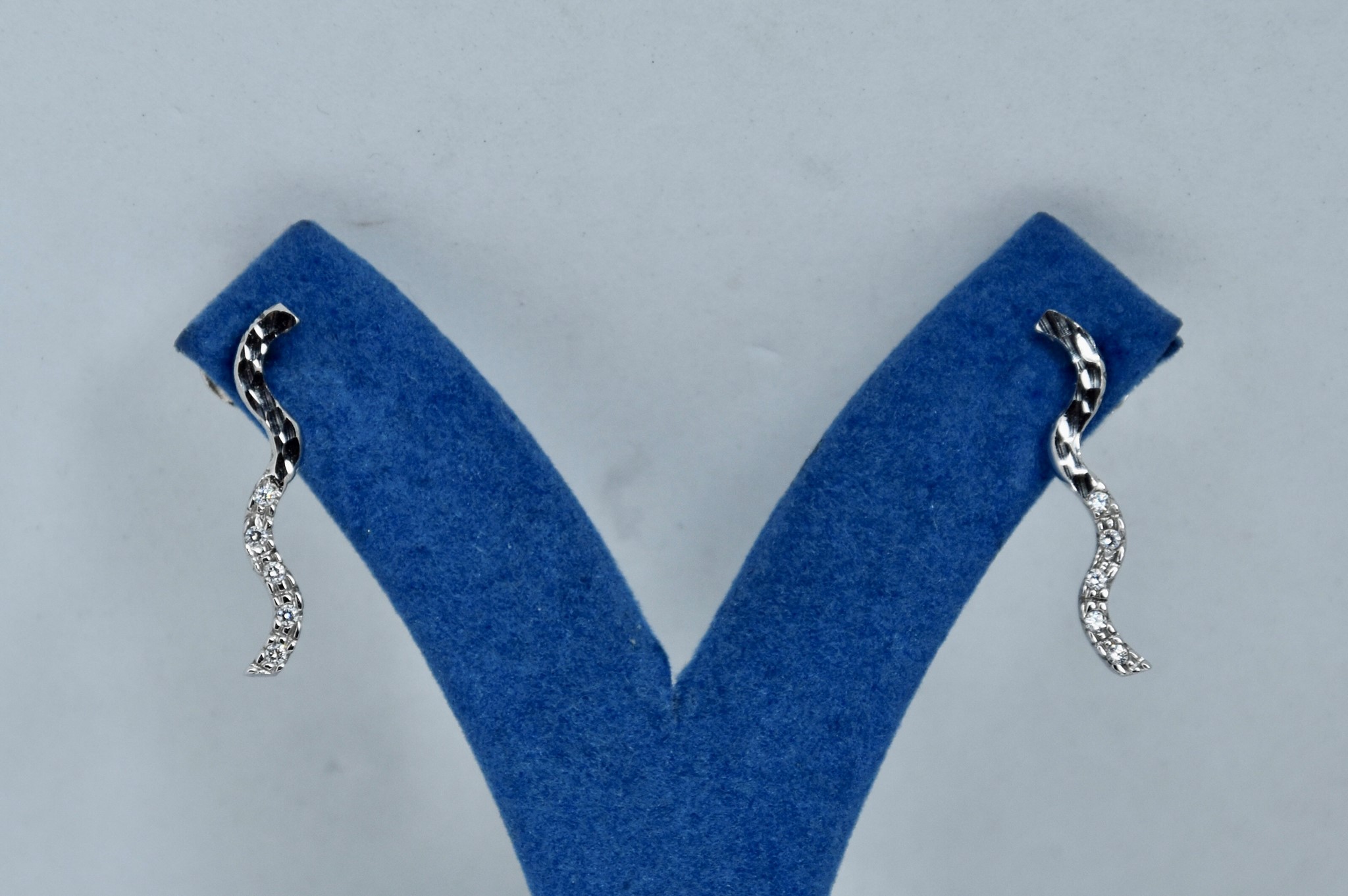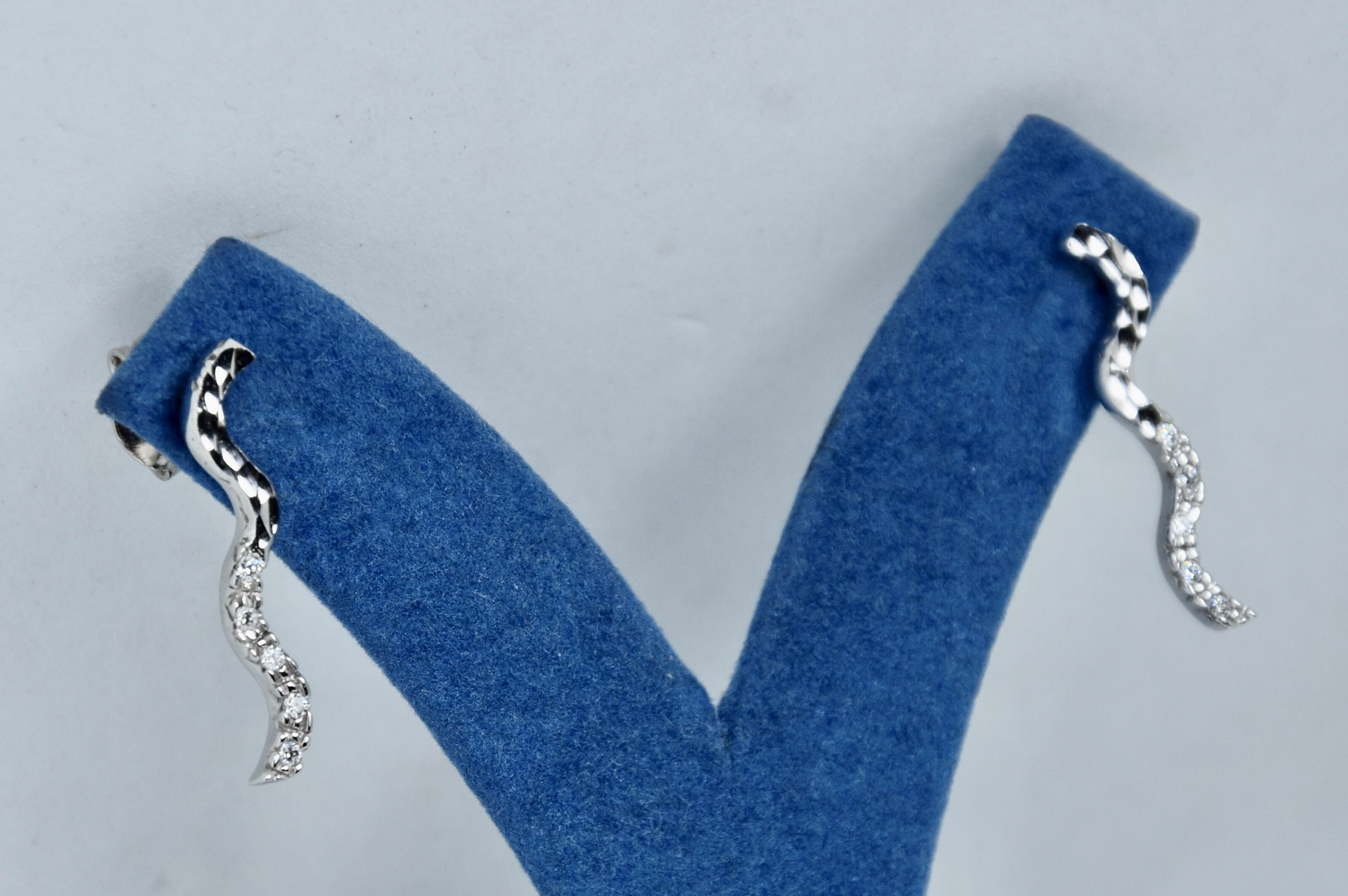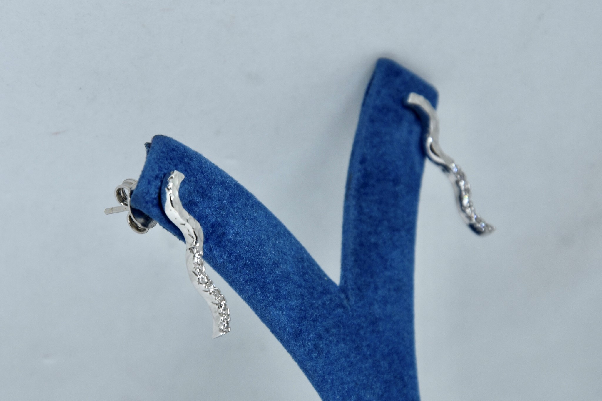 Orecchini pendenti in oro bianco 750/00 con lavorazione a laser e zirconi. Lunghezza 2,10cm. Peso 2,75g.