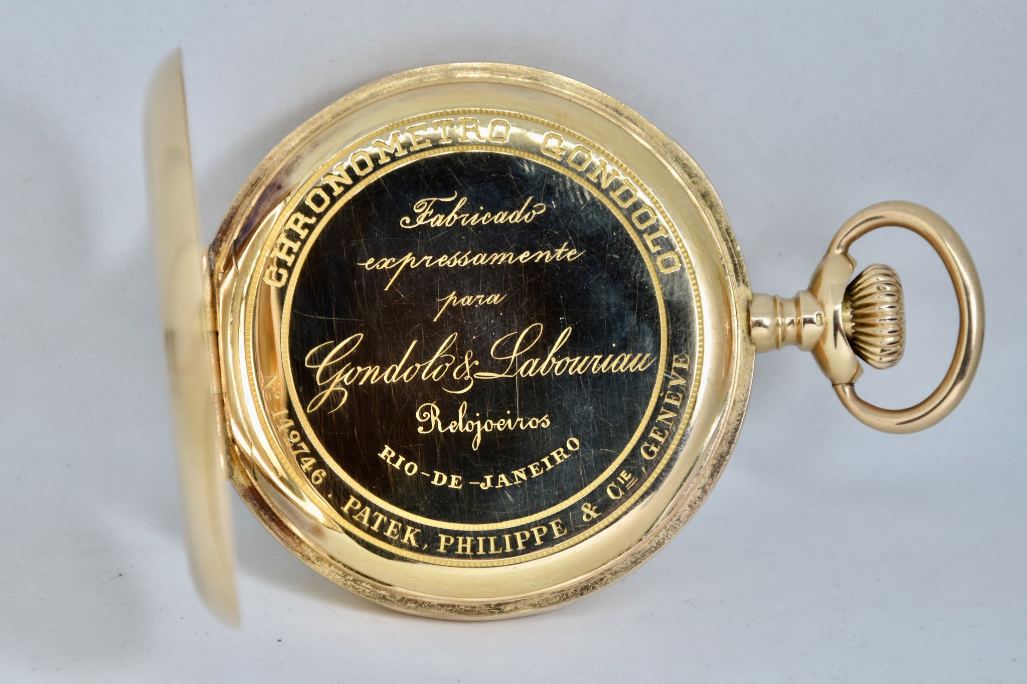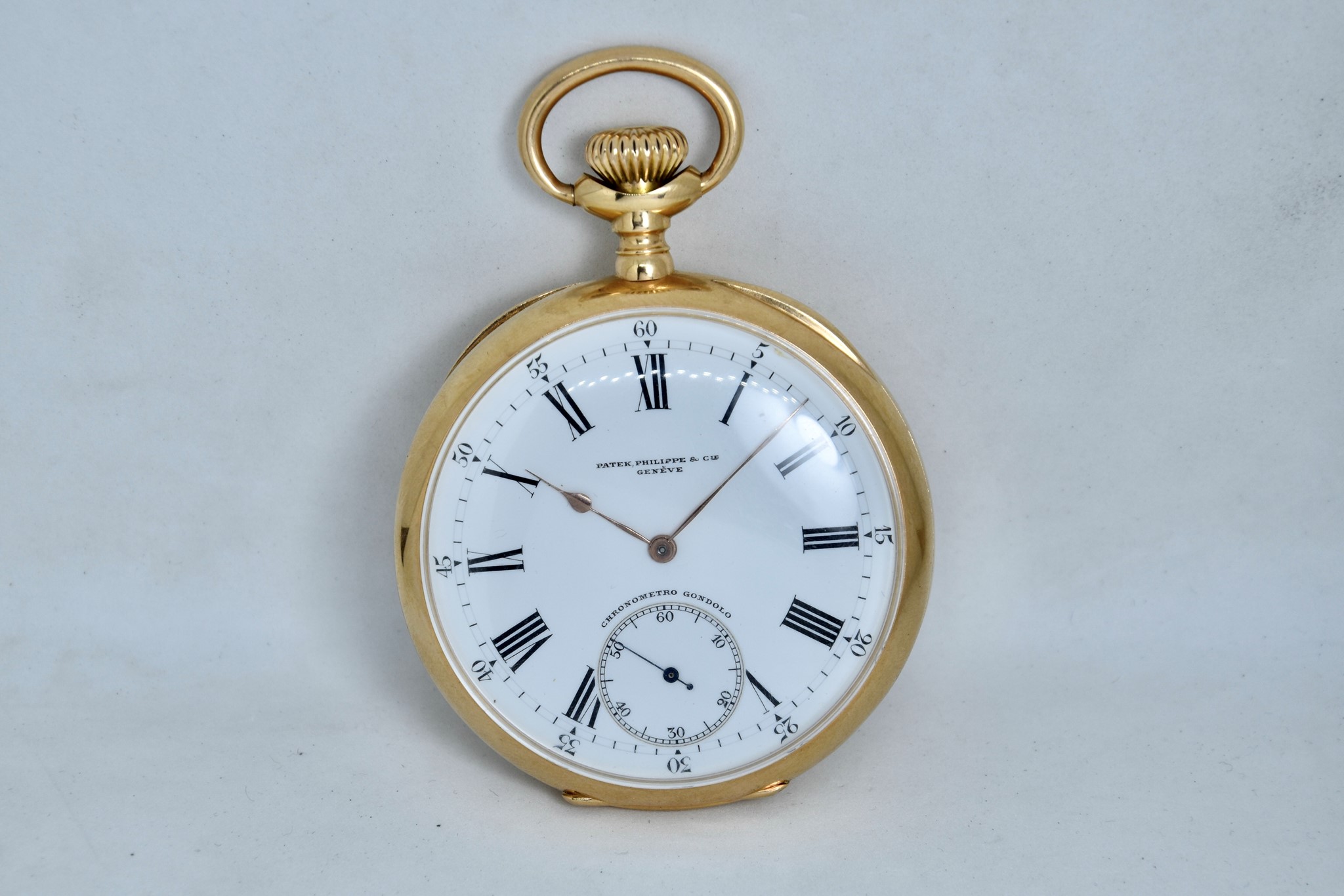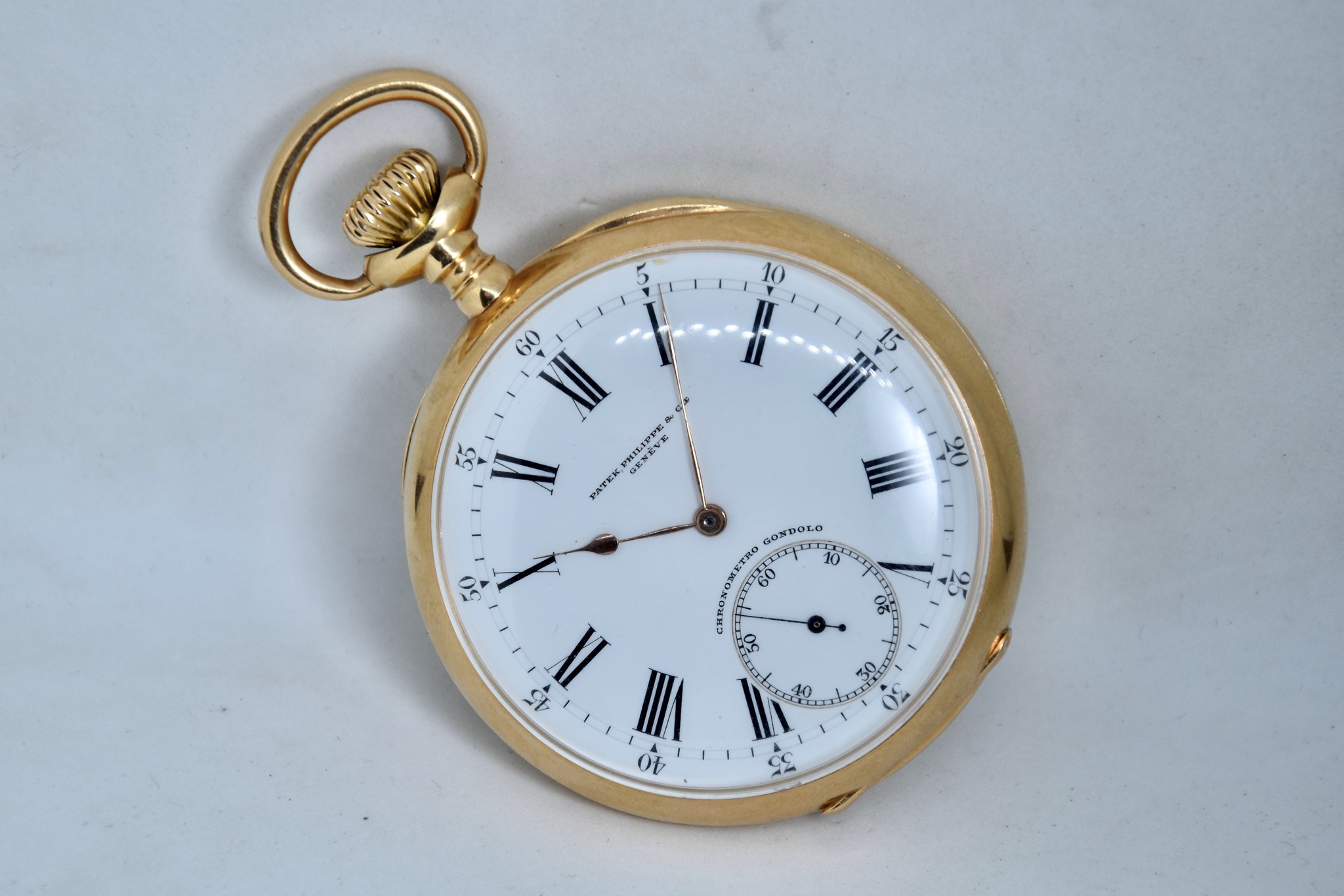Patek Philippe Gondolo del 1910 approssimativamente. Orologio da tasca in oro giallo 750/00 in buone condizioni. Quadrante bianco in smalto con indici numeri romani. Presenti dei segni sul quadrante ad ore 1, visibili solo a vetro “aperto”. Secondi piccoli a ore 6. Movimento a carica manuale di manifattura Patek Philippe cal. 2080. Orologio solo per il mercato Brasiliano venduto per il concessionario di Rio de Janeiro “Gondolo”. Diametro cassa 54mm. Vetro plexiglas. Corona originale. Con nostra scatola.