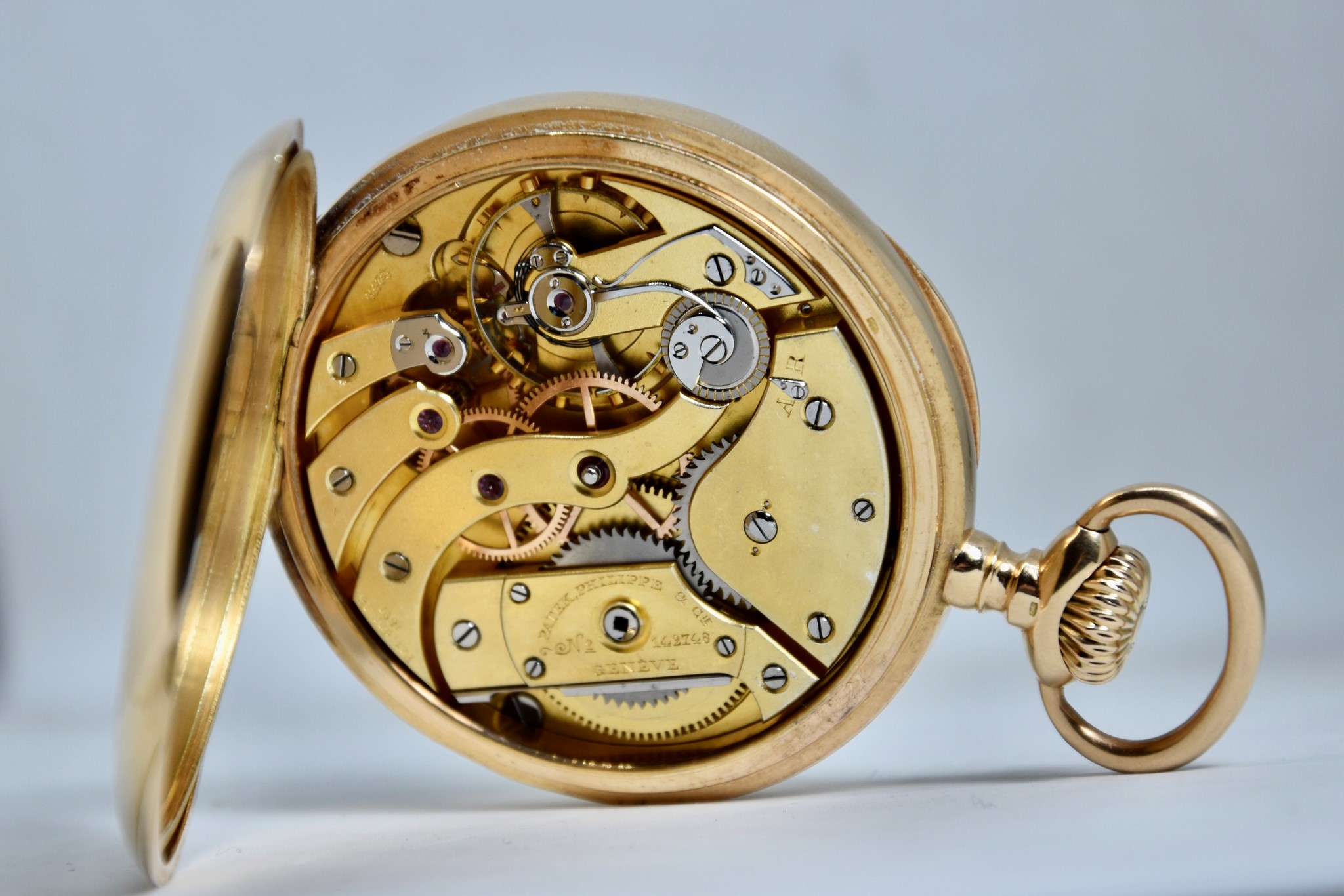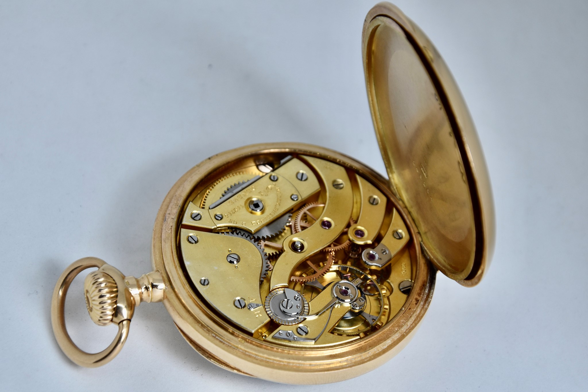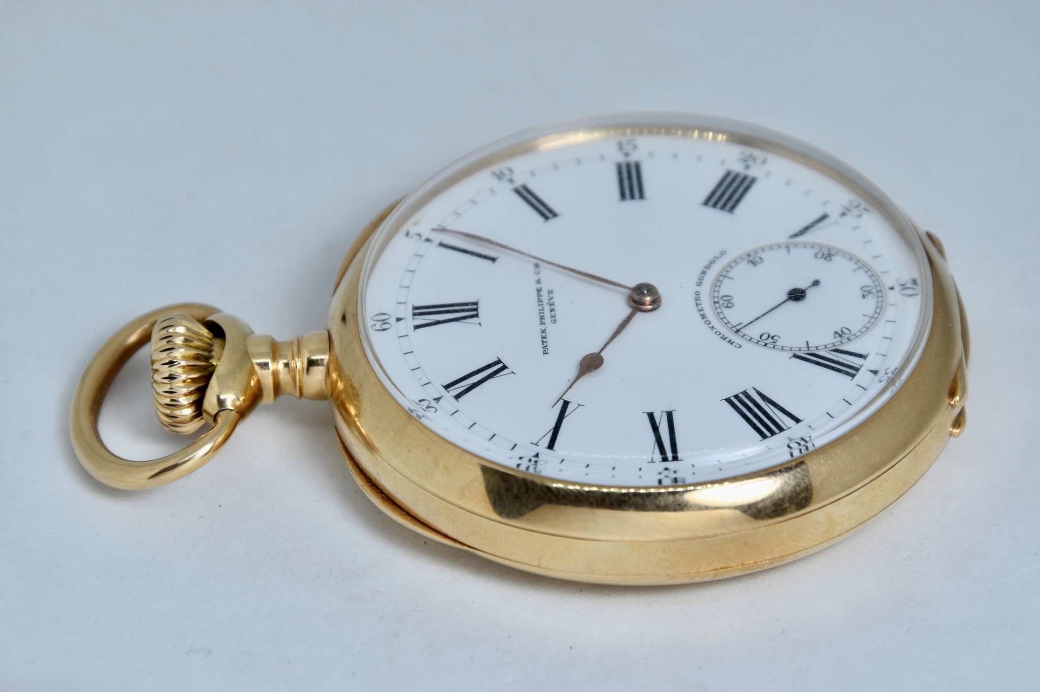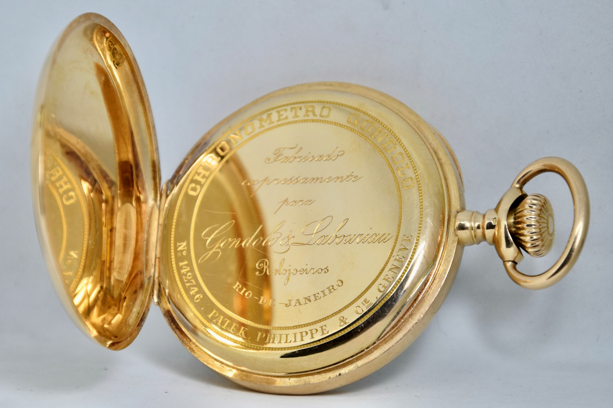 Patek Philippe Gondolo del 1910 approssimativamente. Orologio da tasca in oro giallo 750/00 in buone condizioni. Quadrante bianco in smalto con indici numeri romani. Presenti dei segni sul quadrante ad ore 1, visibili solo a vetro “aperto”. Secondi piccoli a ore 6. Movimento a carica manuale di manifattura Patek Philippe cal. 2080. Orologio solo per il mercato Brasiliano venduto per il concessionario di Rio de Janeiro “Gondolo”. Diametro cassa 54mm. Vetro plexiglas. Corona originale. Con nostra scatola.