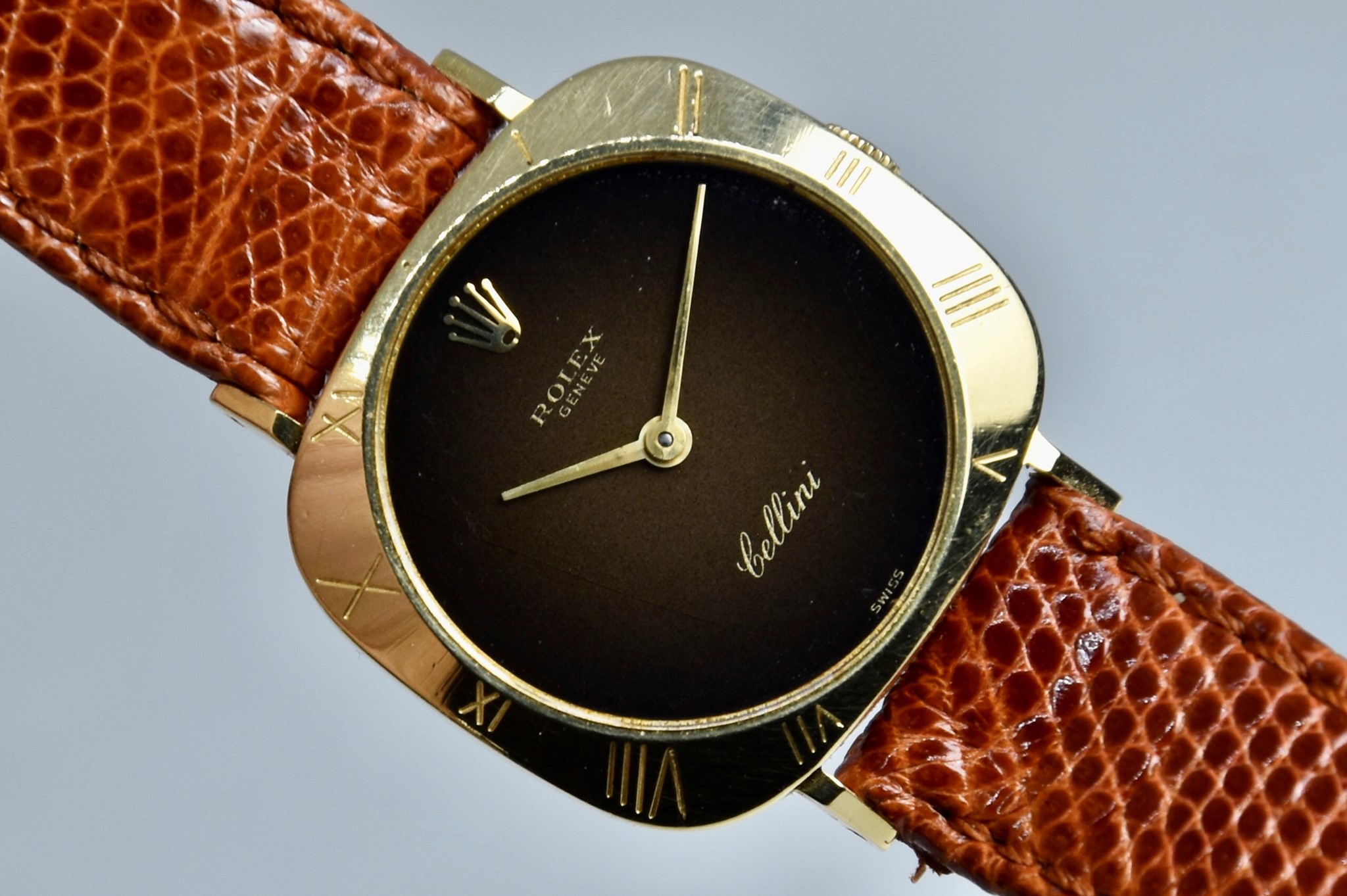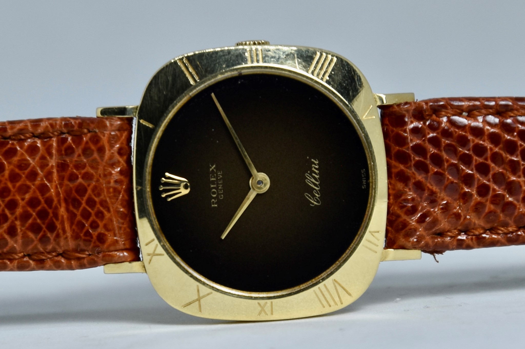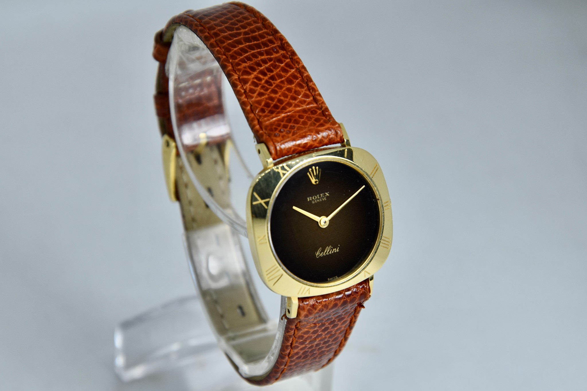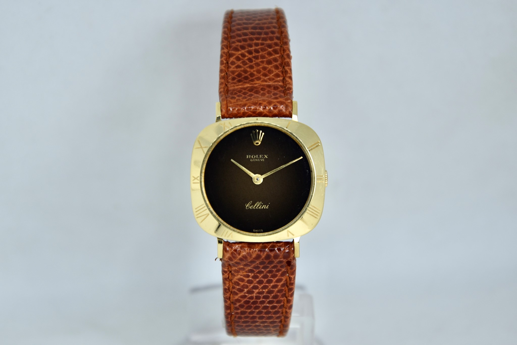 Rolex Cellini Lacqué Degradé Dial ref. 3808 del 1968. Orologio in oro giallo 750/00 in buone condizioni. Quadrante color marrone laccato Degradé. Quadrante crepato, ma assolutamente normale per un quadrante laccato dell'epoca. Movimento a carica manuale. Diametro cassa 26mm. Vetro minerale. Fibbia ad ardiglione originale in oro giallo 750/00. Possibile scegliere diverso cinturino tra vari tipi di pelle e di colori. Con scatola più moderna originale.