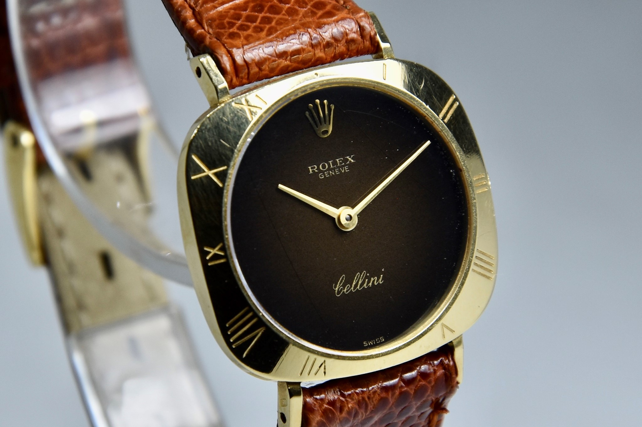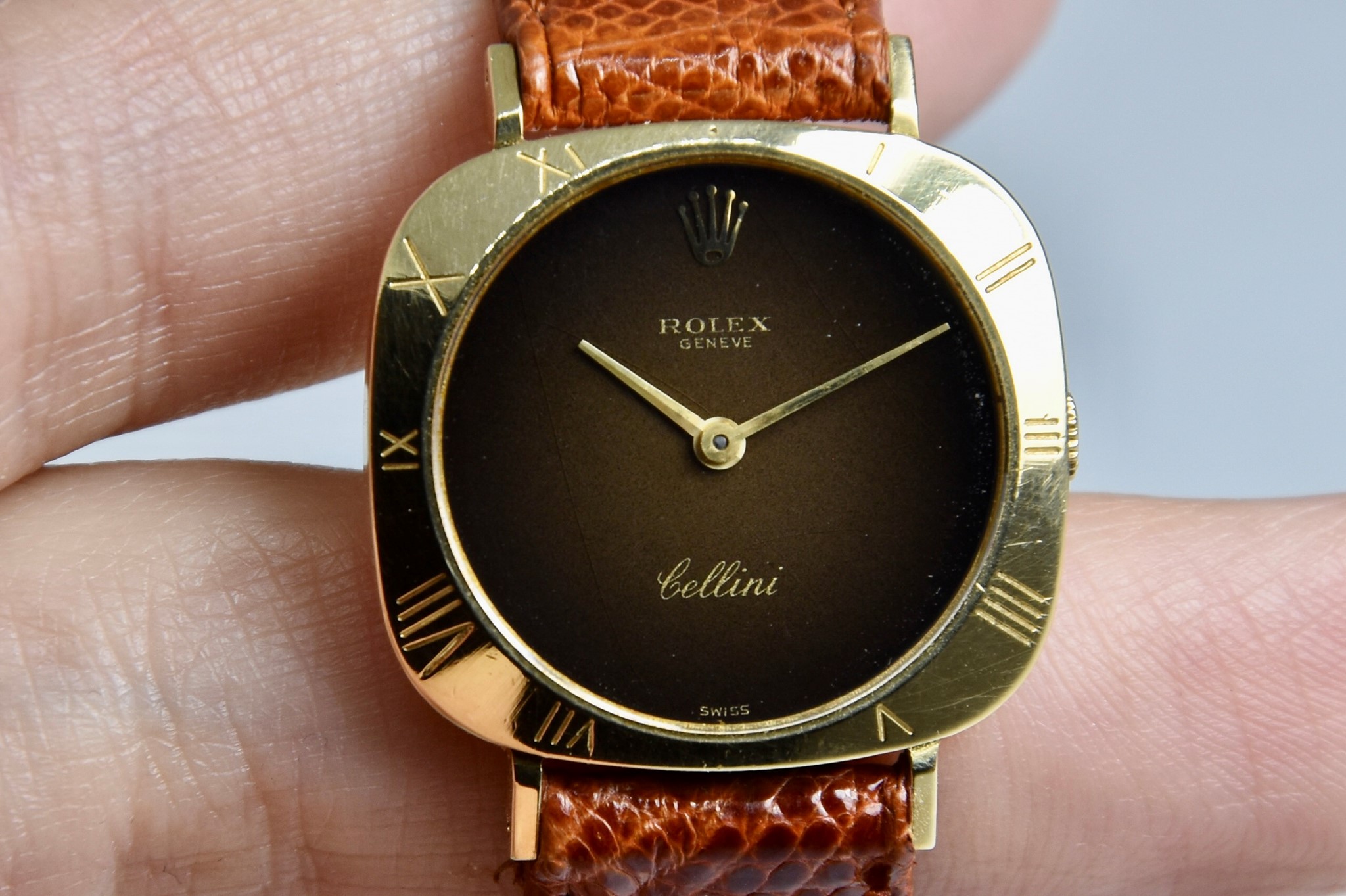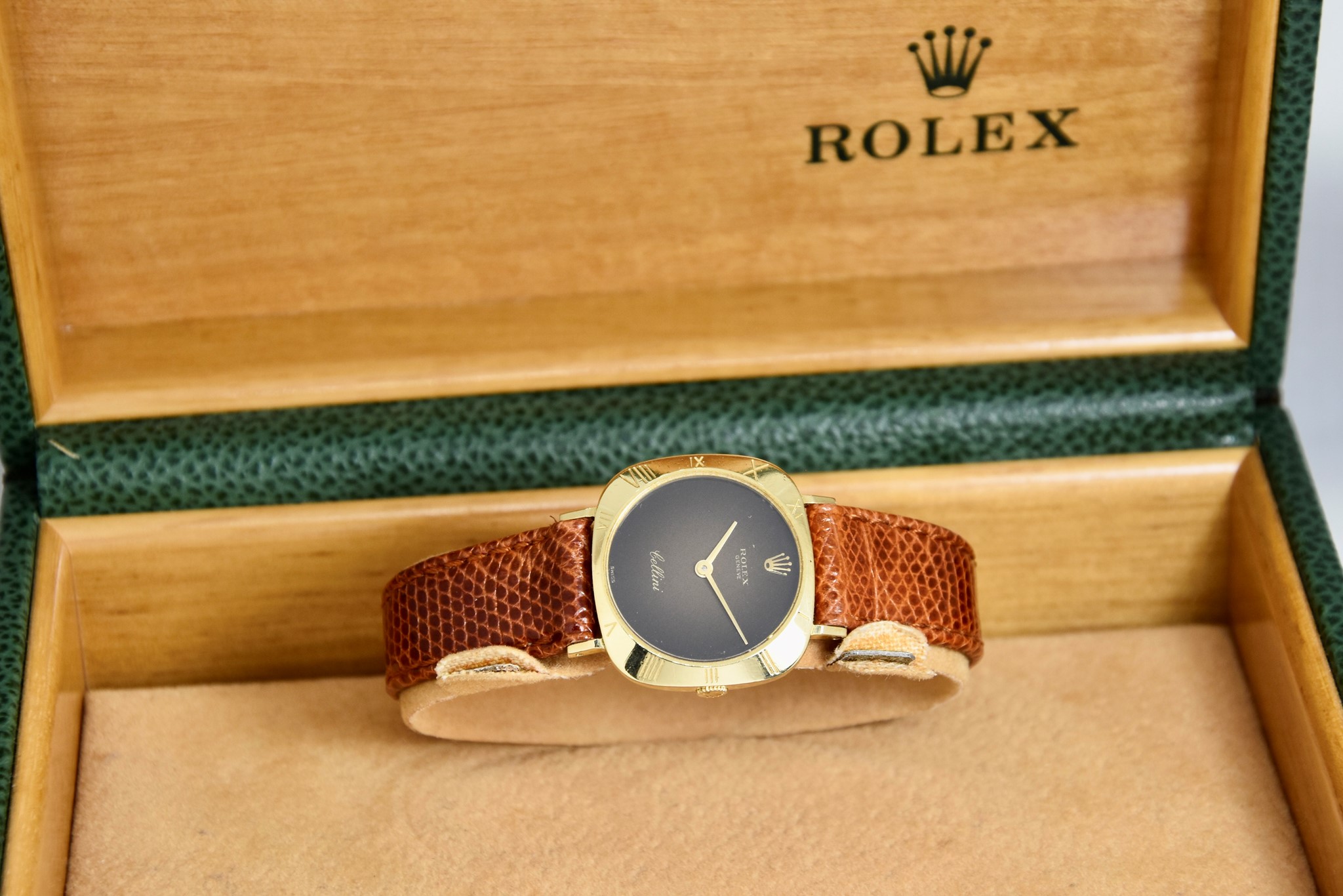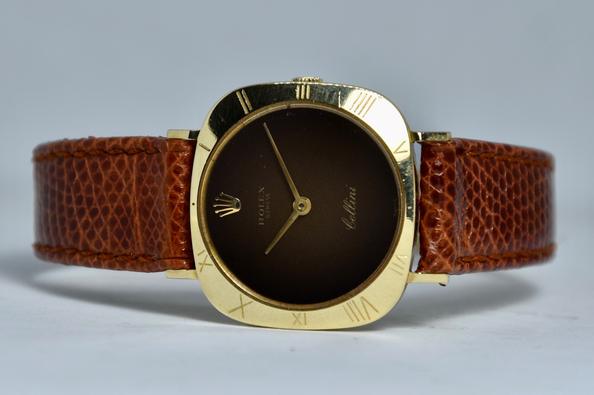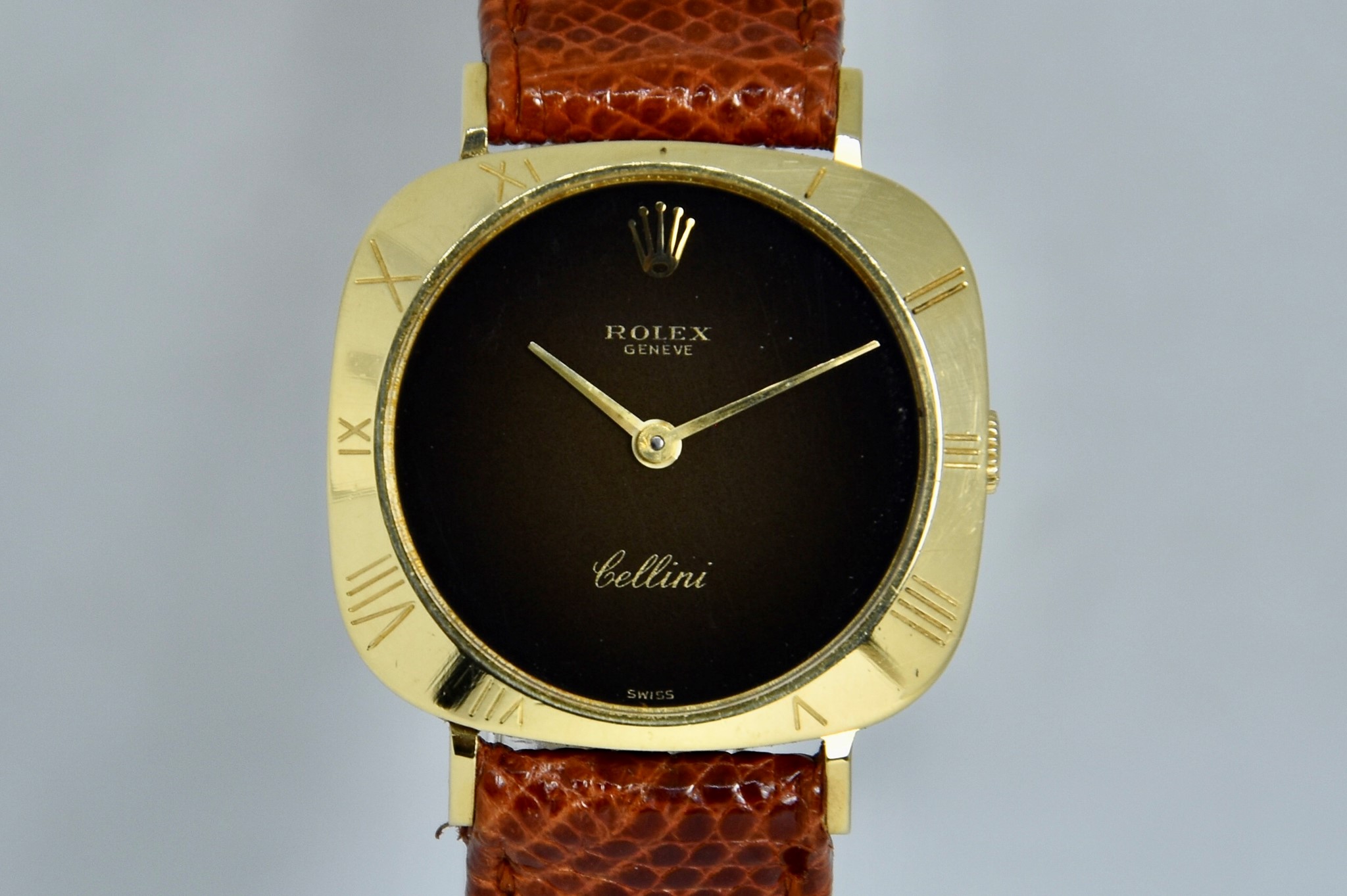 Rolex Cellini Lacqué Degradé Dial ref. 3808 del 1968. Orologio in oro giallo 750/00 in buone condizioni. Quadrante color marrone laccato Degradé. Quadrante crepato, ma assolutamente normale per un quadrante laccato dell'epoca. Movimento a carica manuale. Diametro cassa 26mm. Vetro minerale. Fibbia ad ardiglione originale in oro giallo 750/00. Possibile scegliere diverso cinturino tra vari tipi di pelle e di colori. Con scatola più moderna originale.