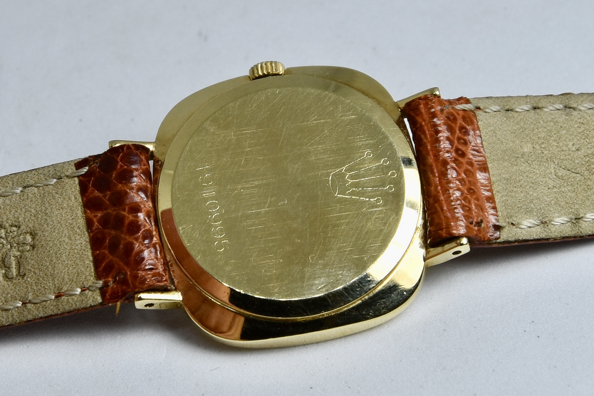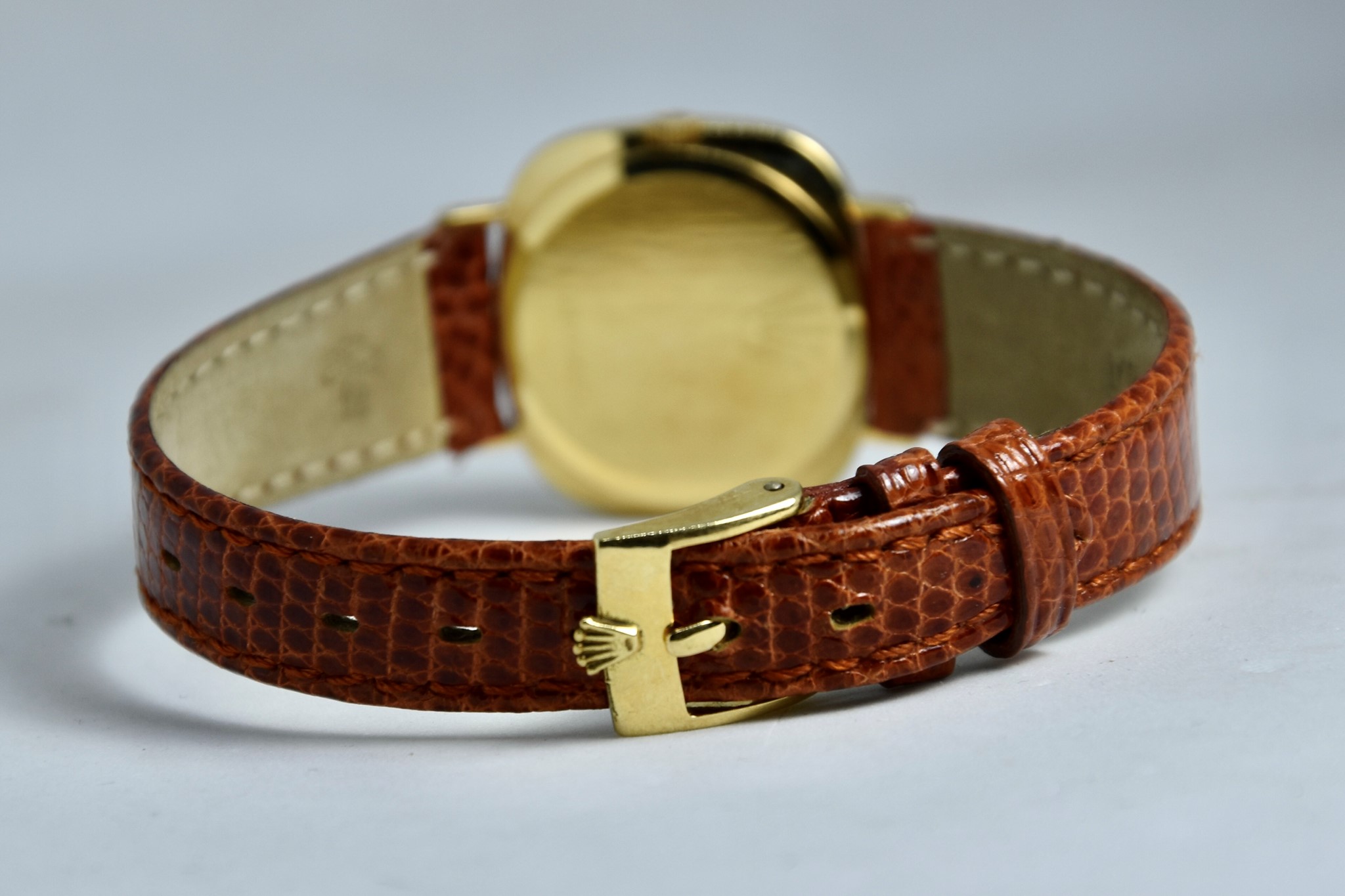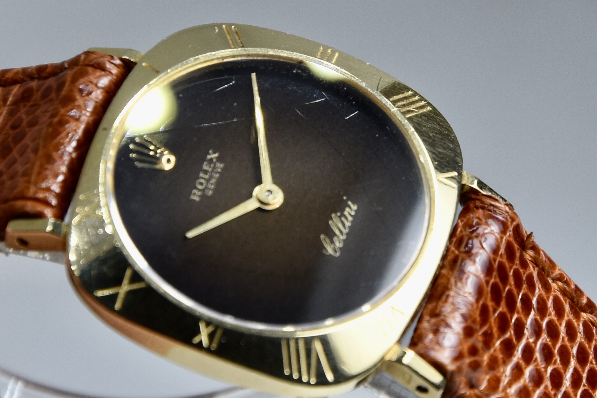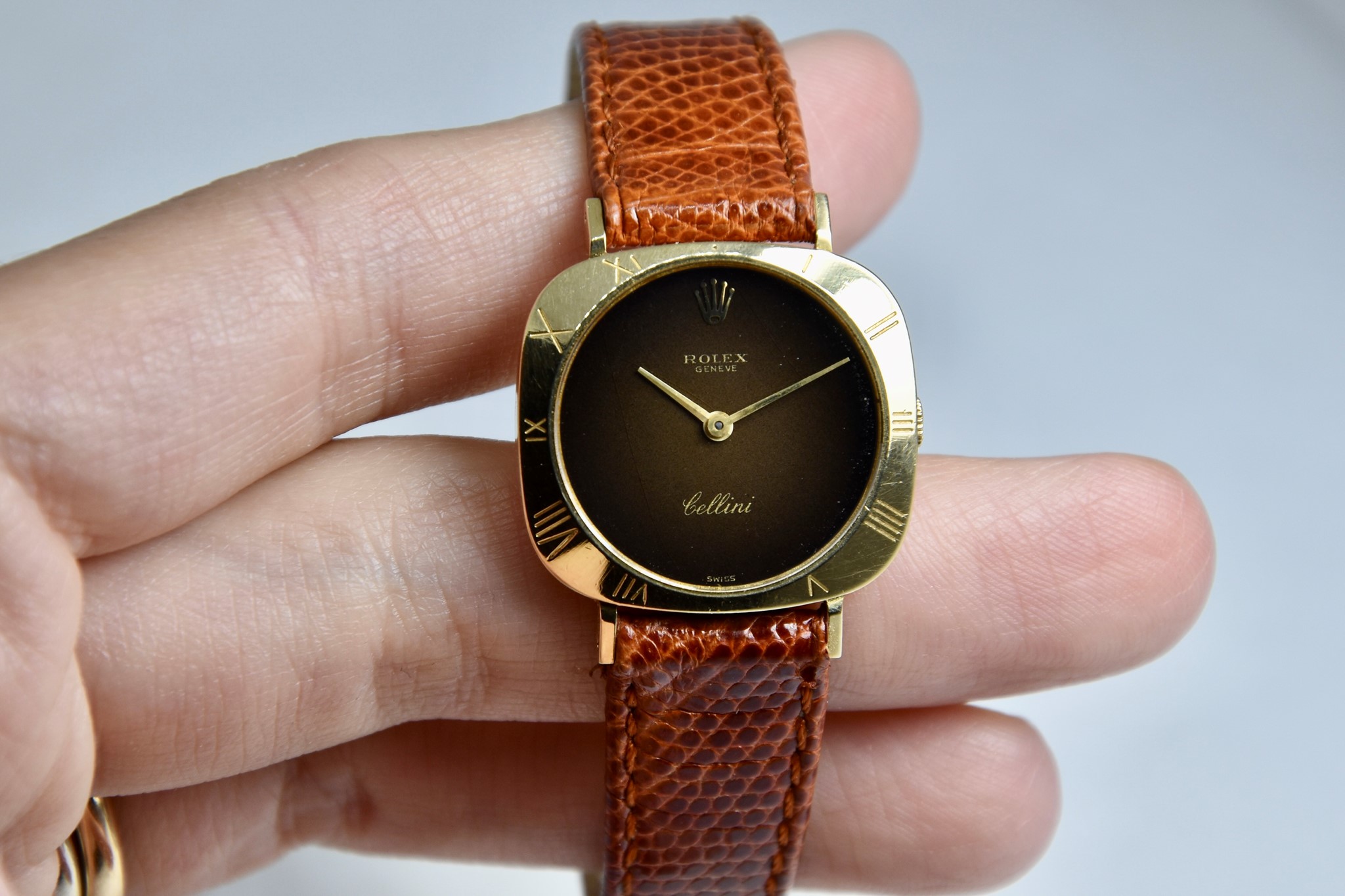 Rolex Cellini Lacqué Degradé Dial ref. 3808 del 1968. Orologio in oro giallo 750/00 in buone condizioni. Quadrante color marrone laccato Degradé. Quadrante crepato, ma assolutamente normale per un quadrante laccato dell'epoca. Movimento a carica manuale. Diametro cassa 26mm. Vetro minerale. Fibbia ad ardiglione originale in oro giallo 750/00. Possibile scegliere diverso cinturino tra vari tipi di pelle e di colori. Con scatola più moderna originale.