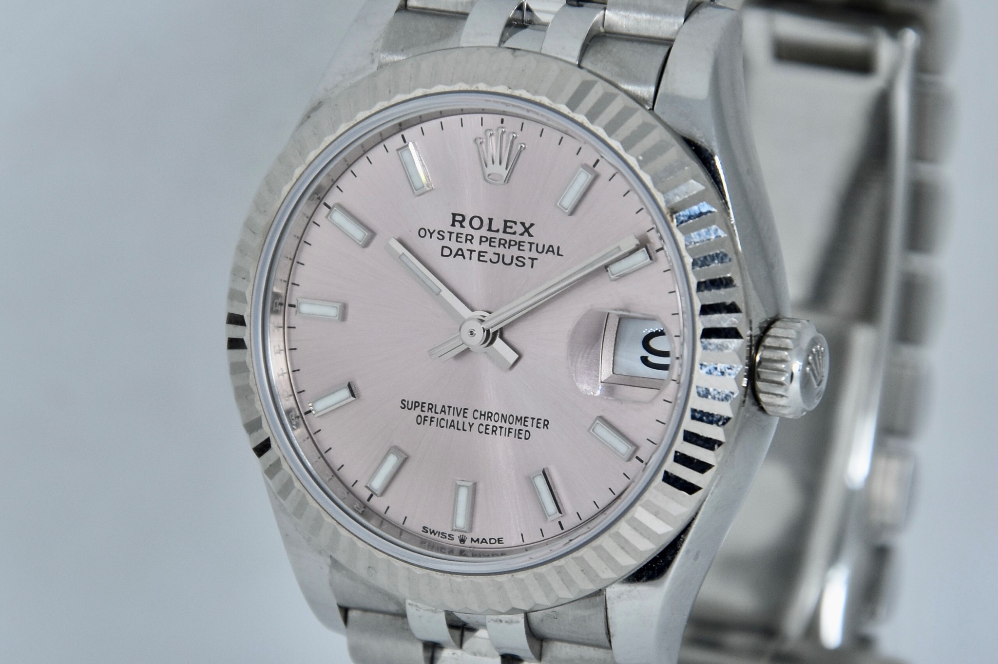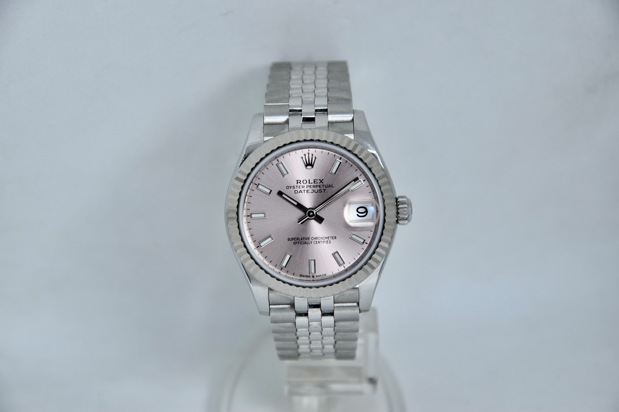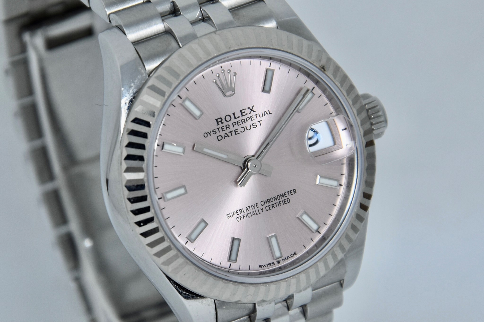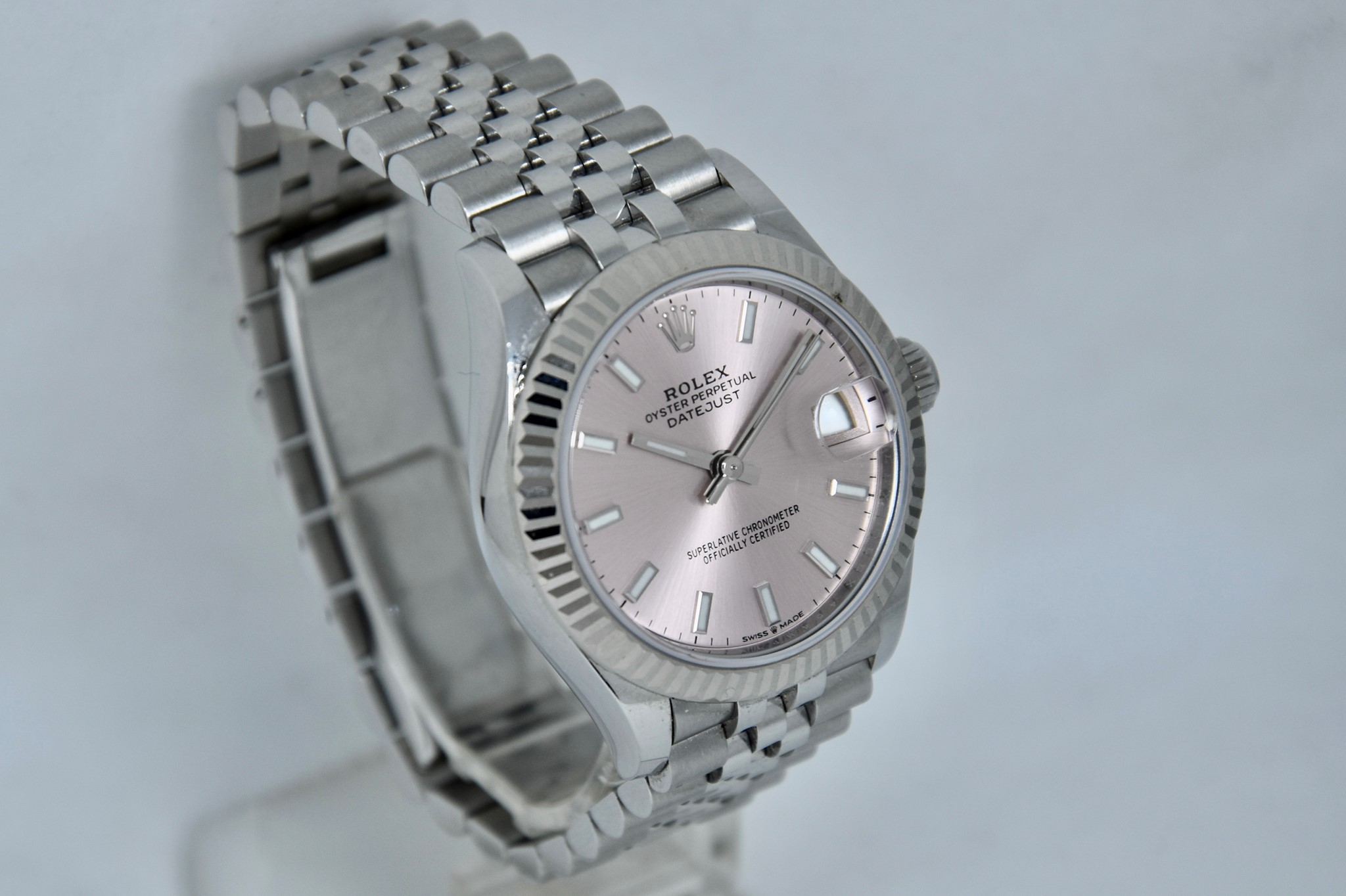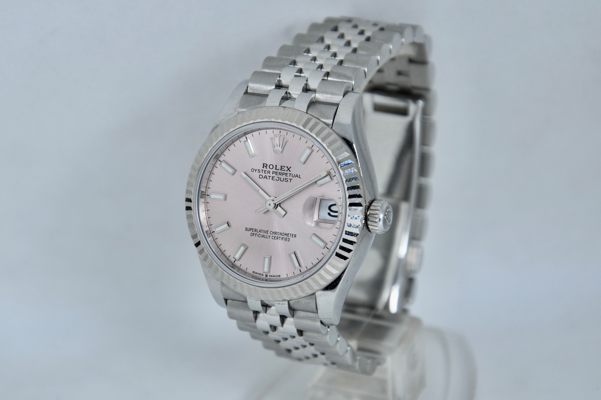 Rolex Datejust ref. 278274 del 2023. Orologio in acciaio in ottime condizioni. Quadrante color rosa. Movimento a carica automatica. Ghiera zigrinata in oro bianco. Diametro cassa 31mm. Indicatore del datario. Vetro zaffiro. Bracciale jubilee in ottime condizioni. Con scatola e garanzia originali. (interno della scatola rovinato).