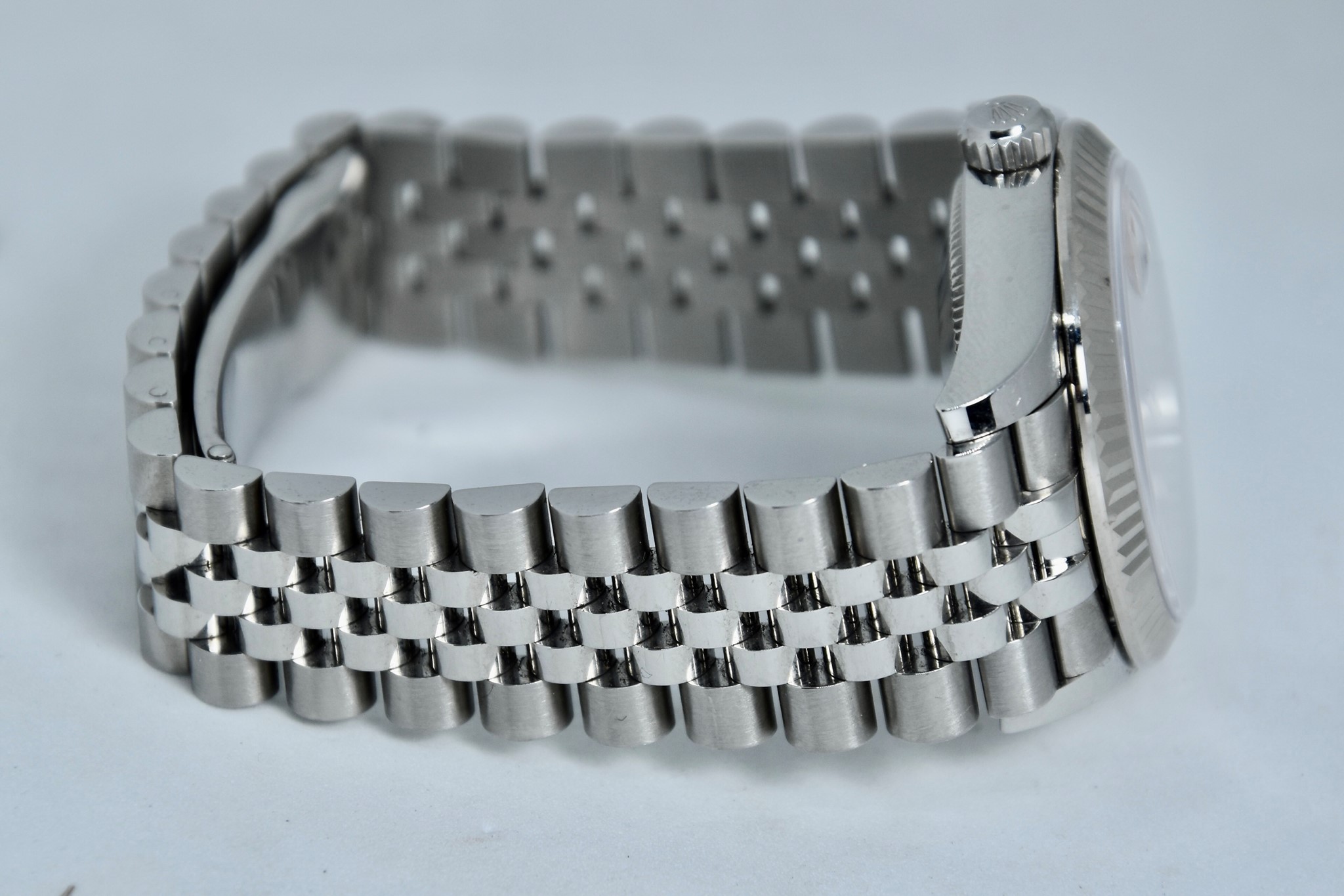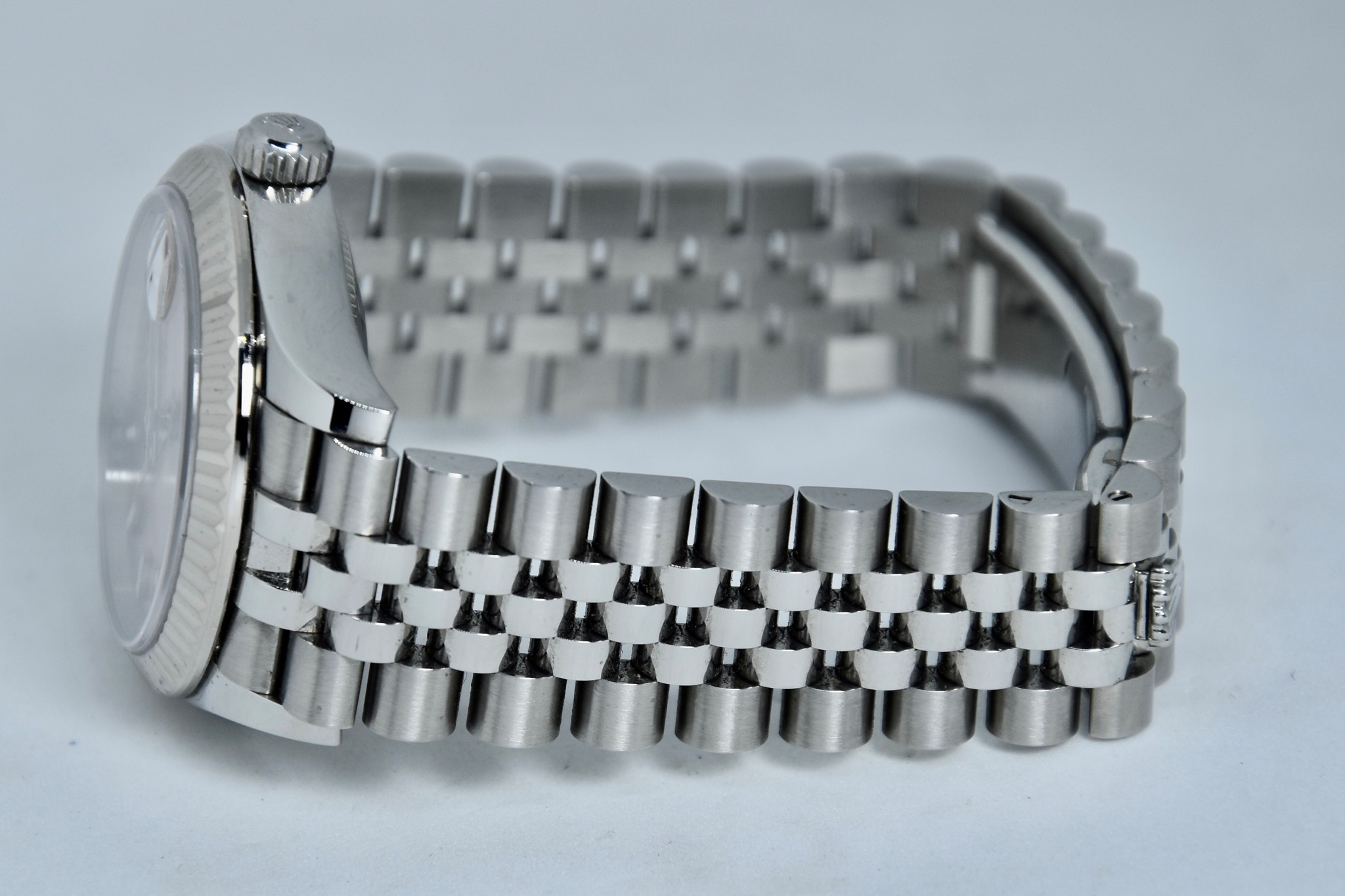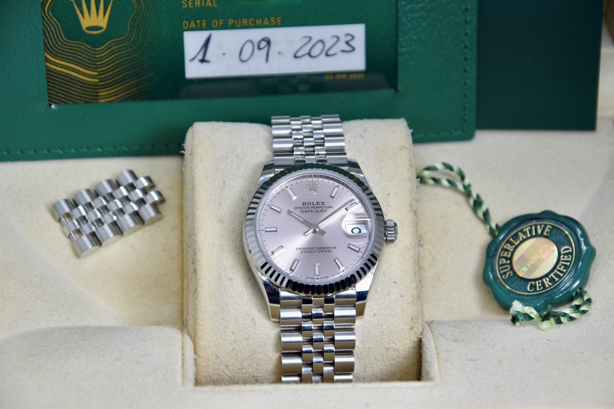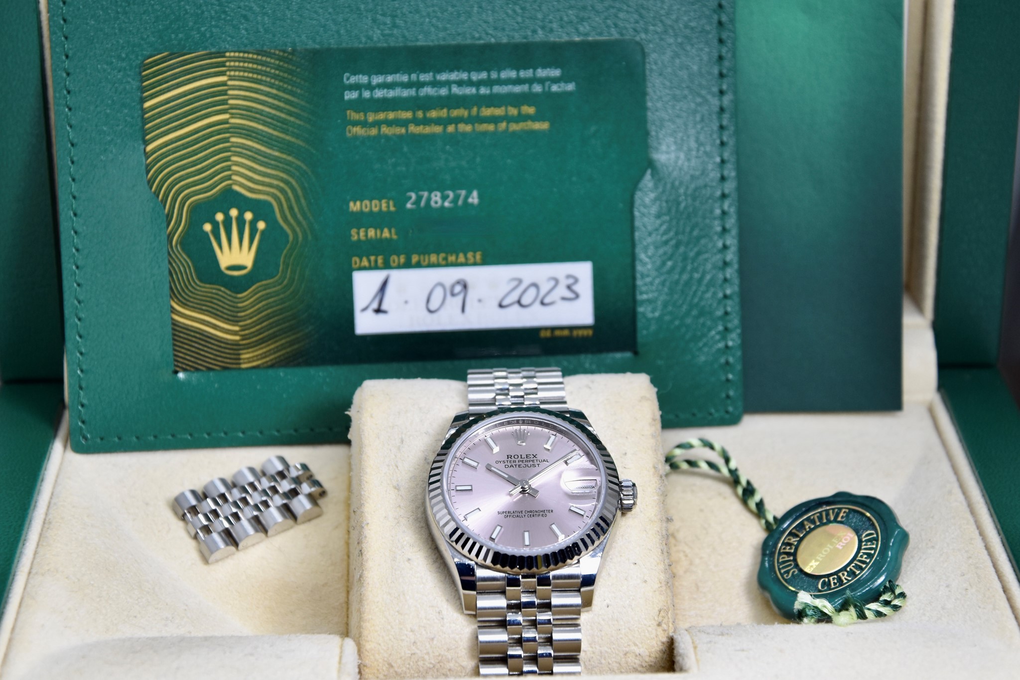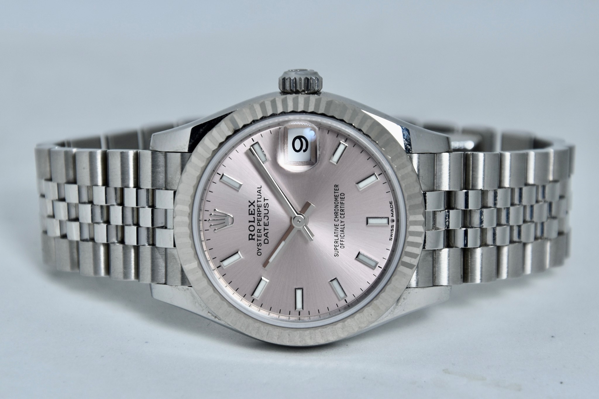 Rolex Datejust ref. 278274 del 2023. Orologio in acciaio in ottime condizioni. Quadrante color rosa. Movimento a carica automatica. Ghiera zigrinata in oro bianco. Diametro cassa 31mm. Indicatore del datario. Vetro zaffiro. Bracciale jubilee in ottime condizioni. Con scatola e garanzia originali. (interno della scatola rovinato).
