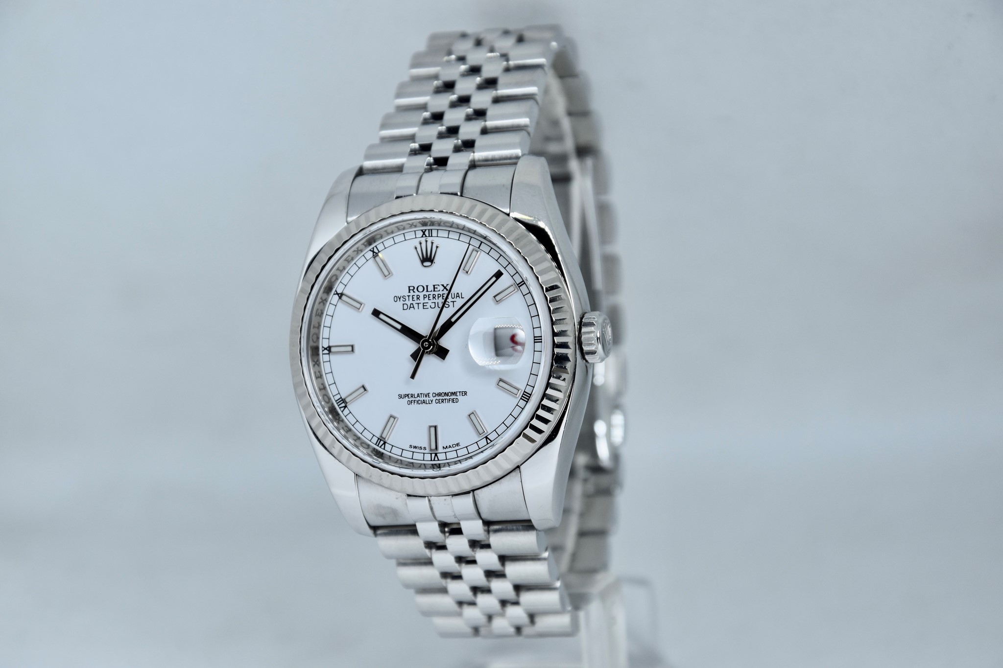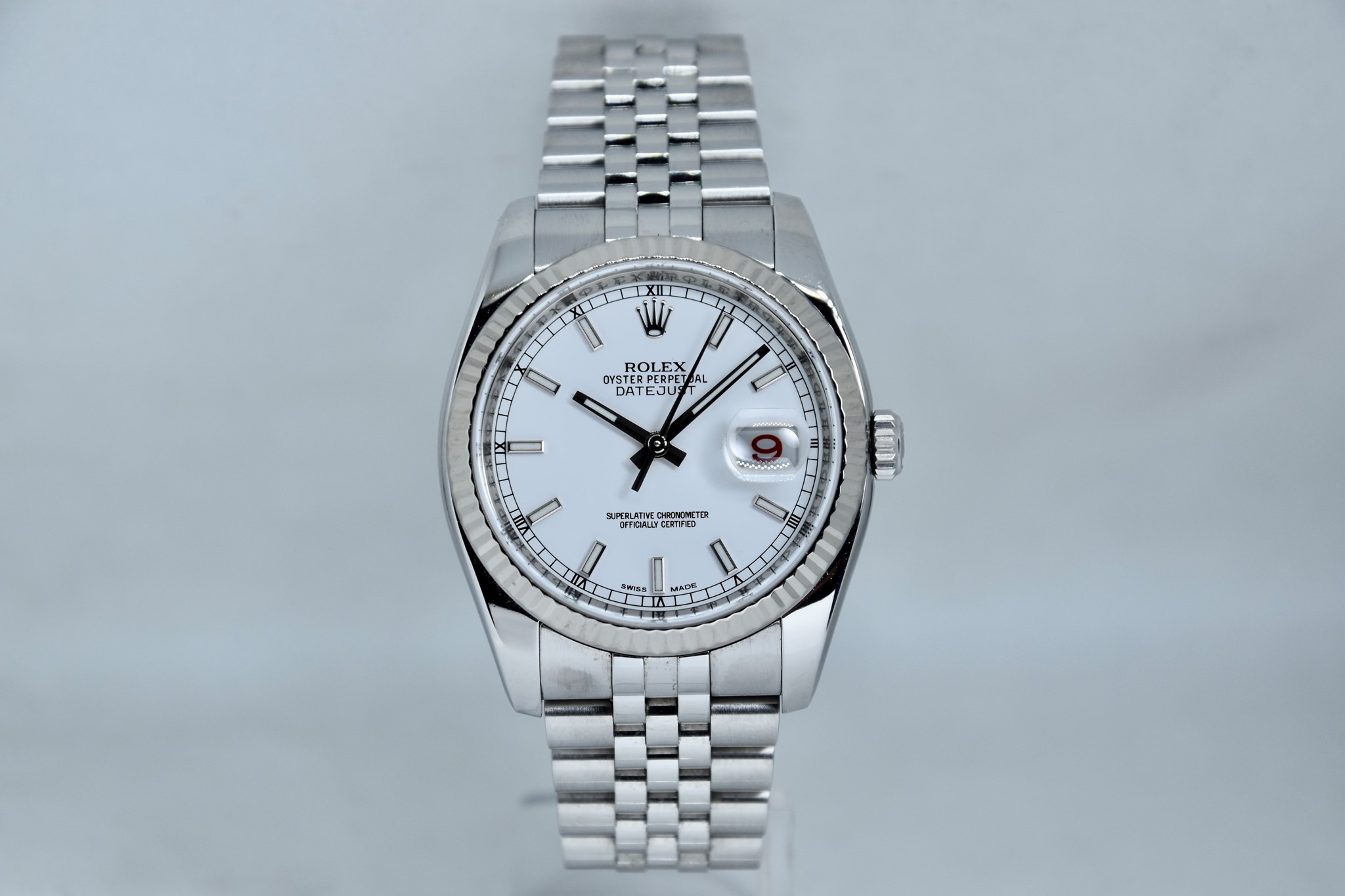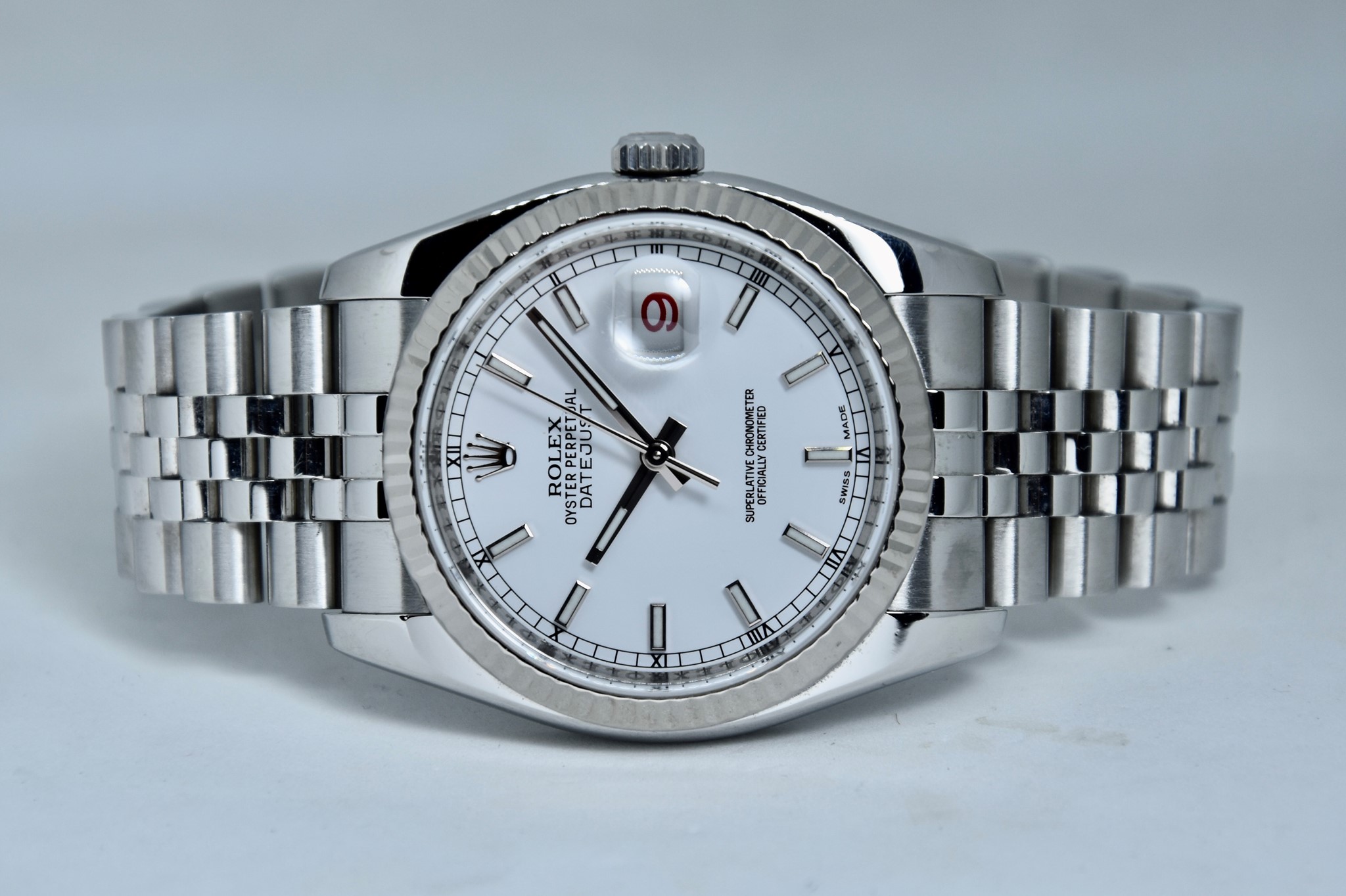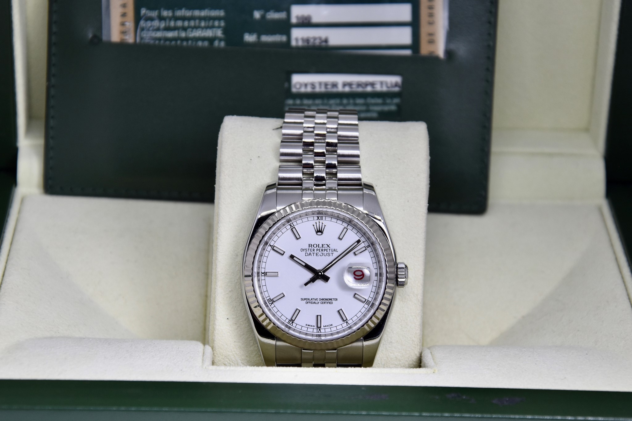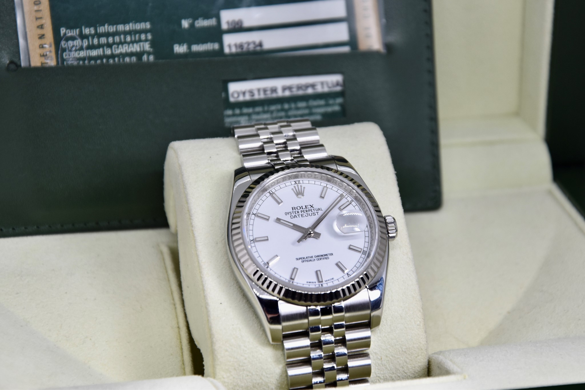 Rolex Datejust ref. 116234 del 2010. Orologio in acciaio in ottime condizioni. Splendido quadrante color bianco. Movimento a carica automatica. Ghiera zigrinata in oro bianco. Diametro cassa 36mm. Indicatore del datario "Roulette". Vetro zaffiro. Bracciale superjubilee in ottime condizioni. Con scatola e garanzia originali.