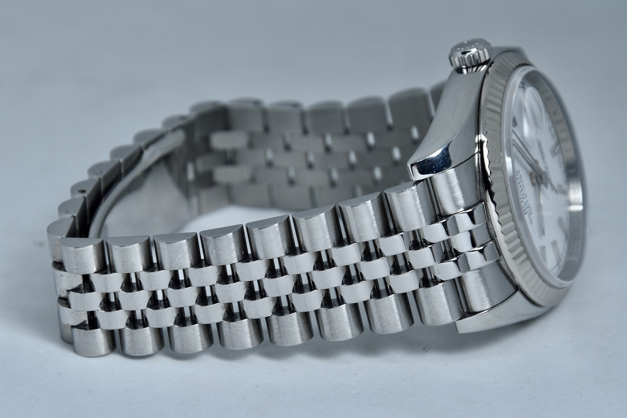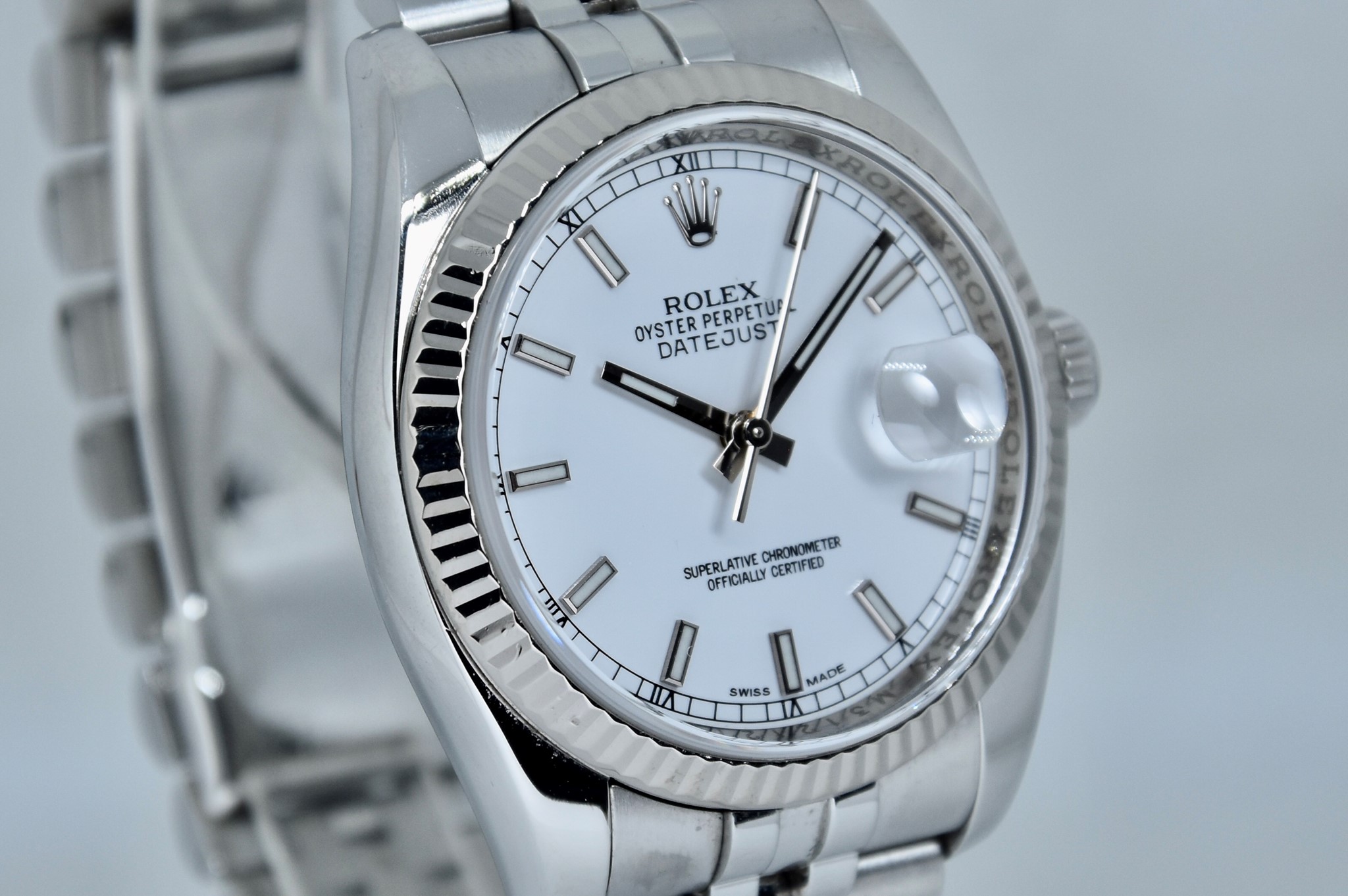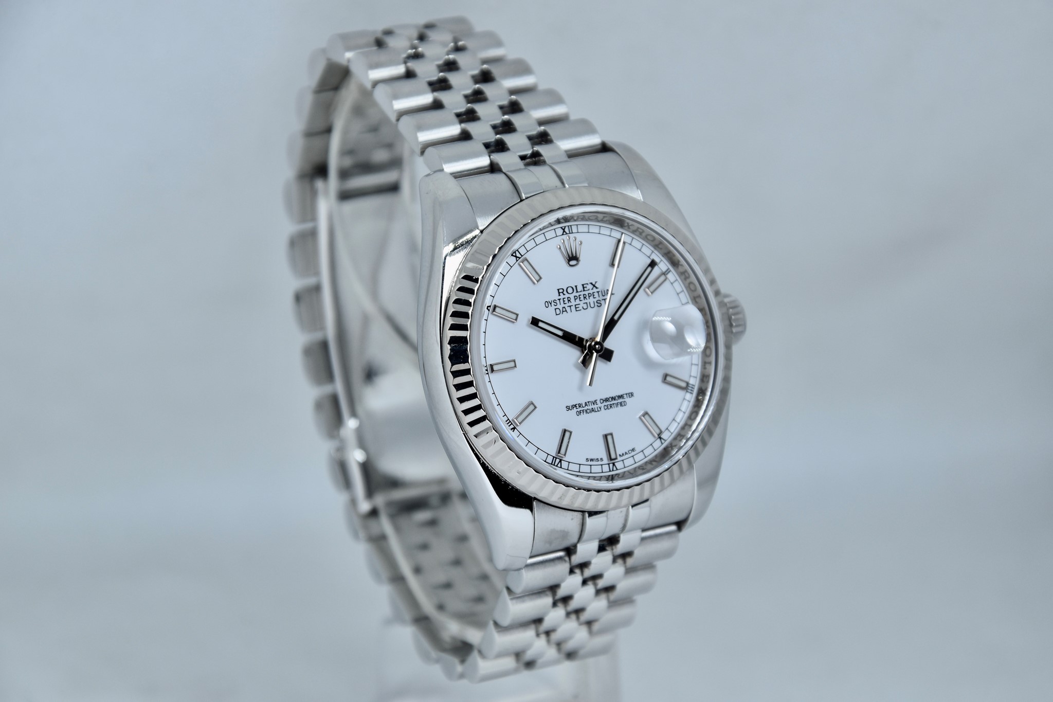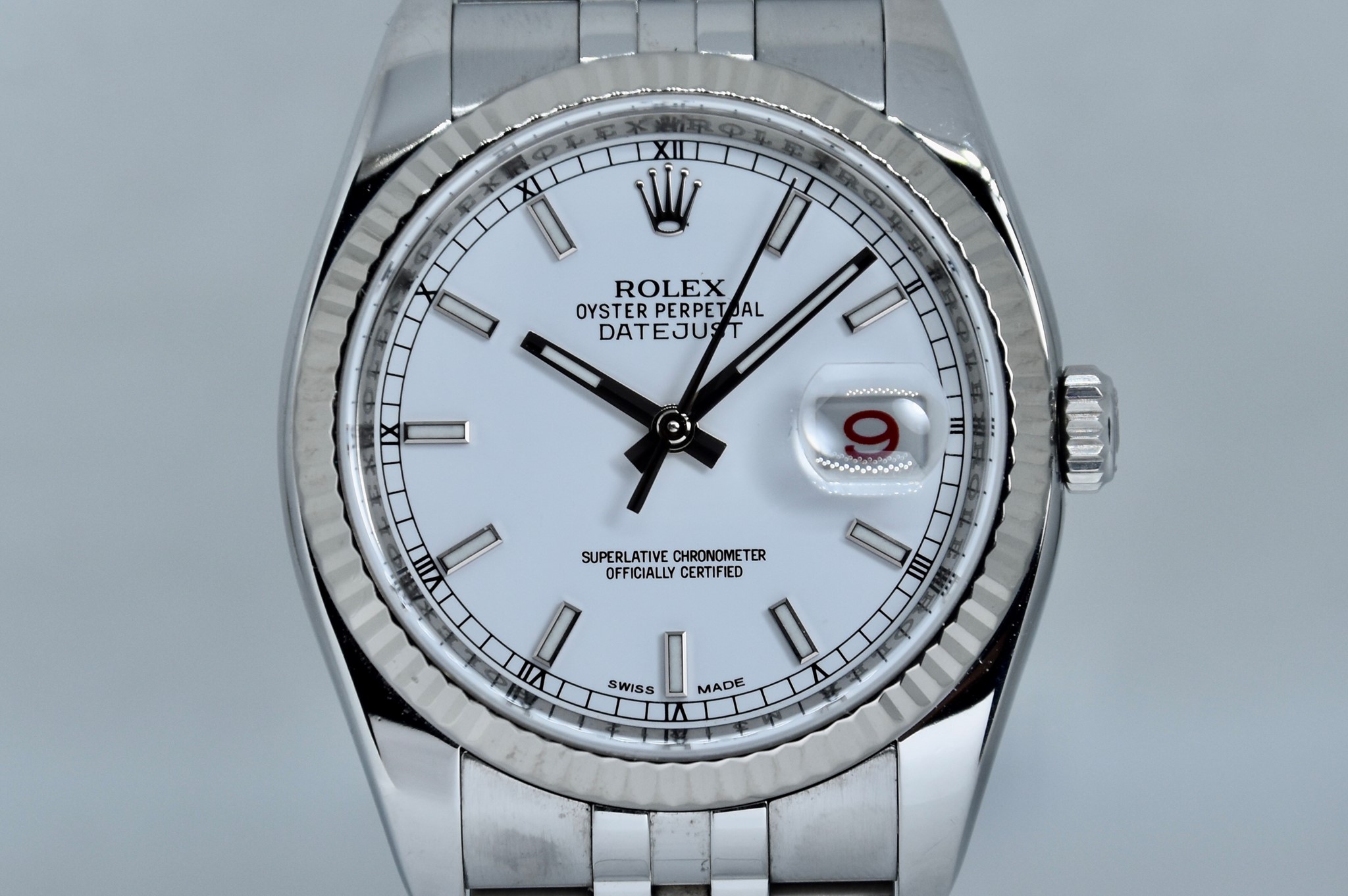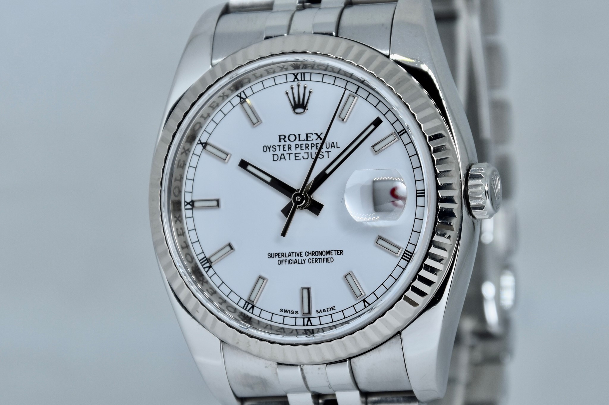 Rolex Datejust ref. 116234 del 2010. Orologio in acciaio in ottime condizioni. Splendido quadrante color bianco. Movimento a carica automatica. Ghiera zigrinata in oro bianco. Diametro cassa 36mm. Indicatore del datario "Roulette". Vetro zaffiro. Bracciale superjubilee in ottime condizioni. Con scatola e garanzia originali.