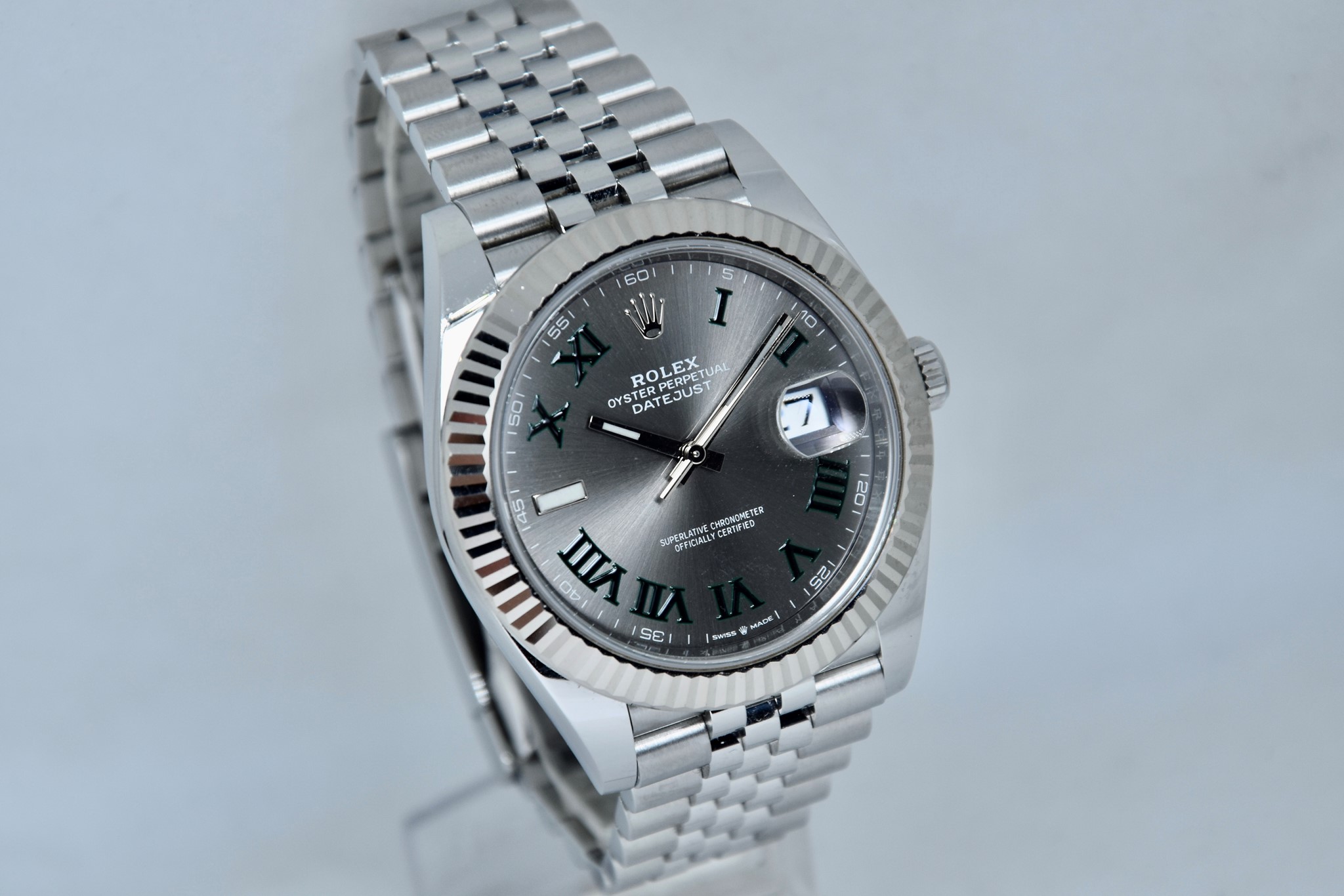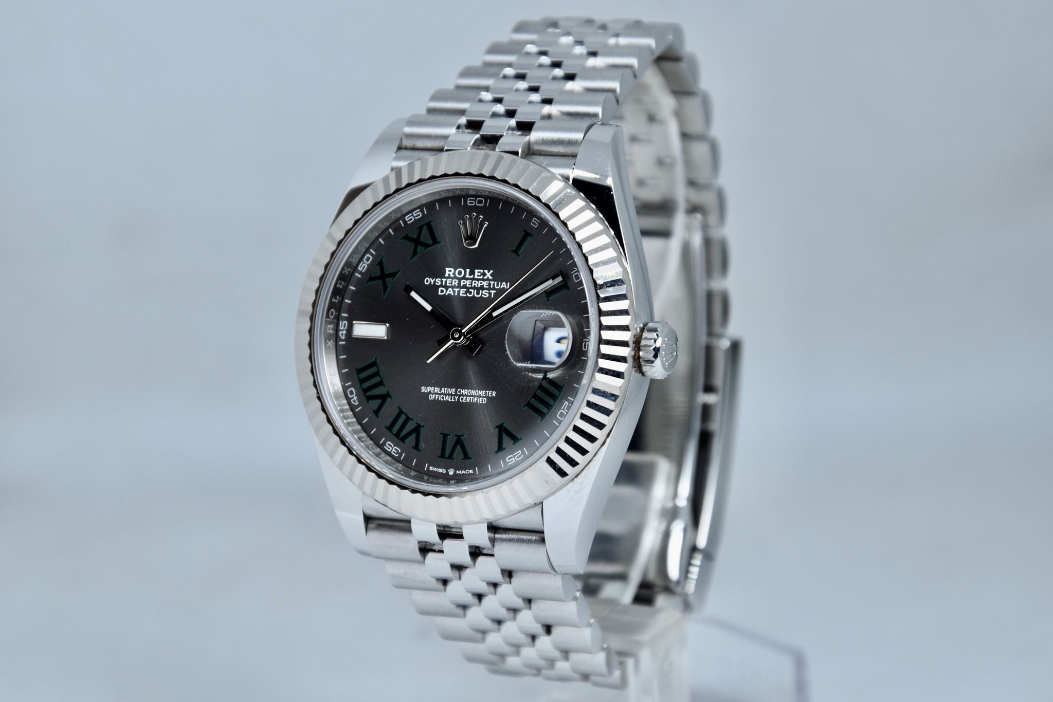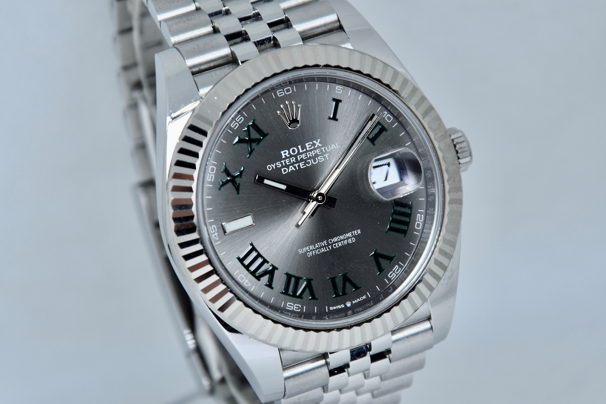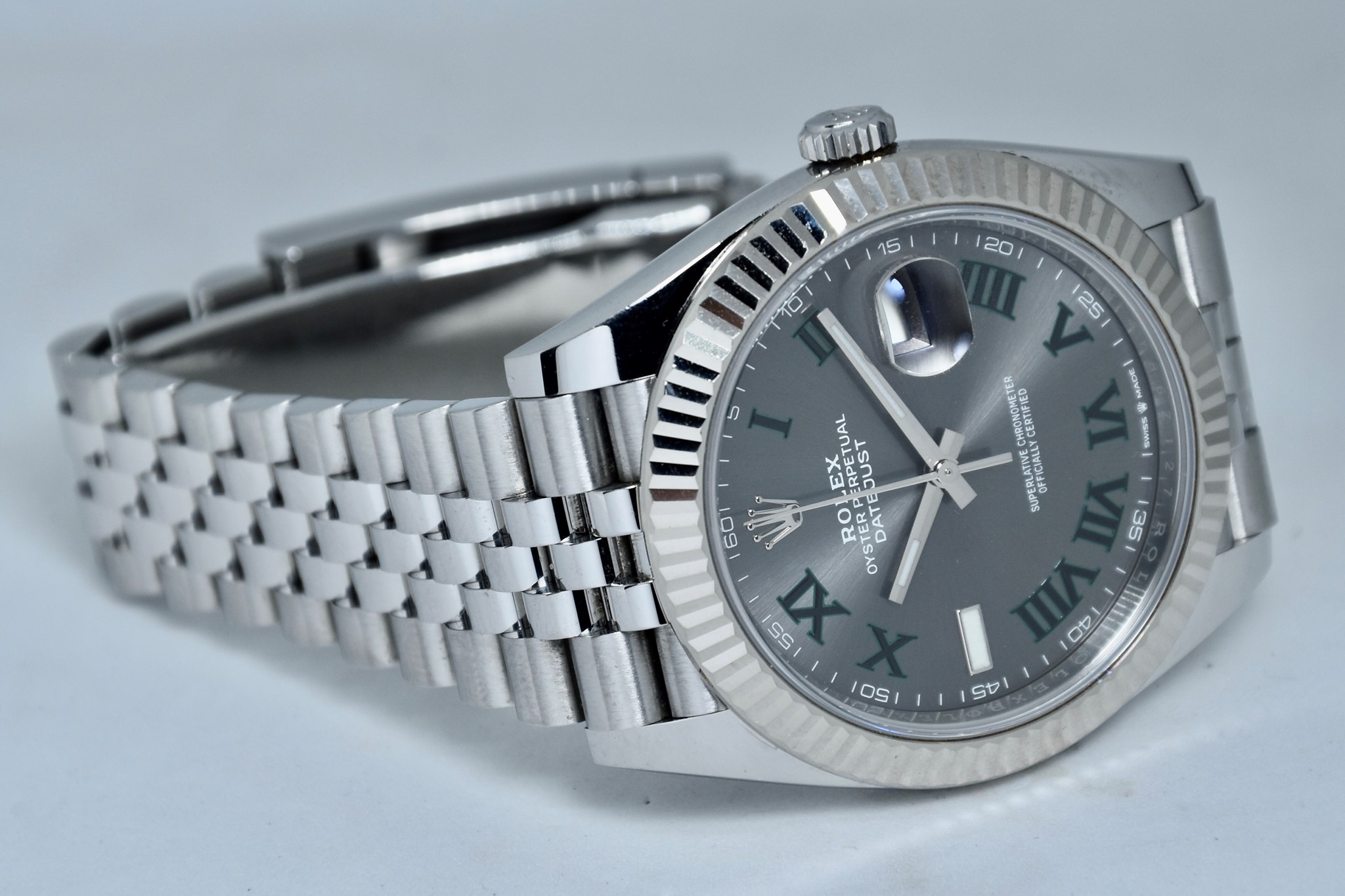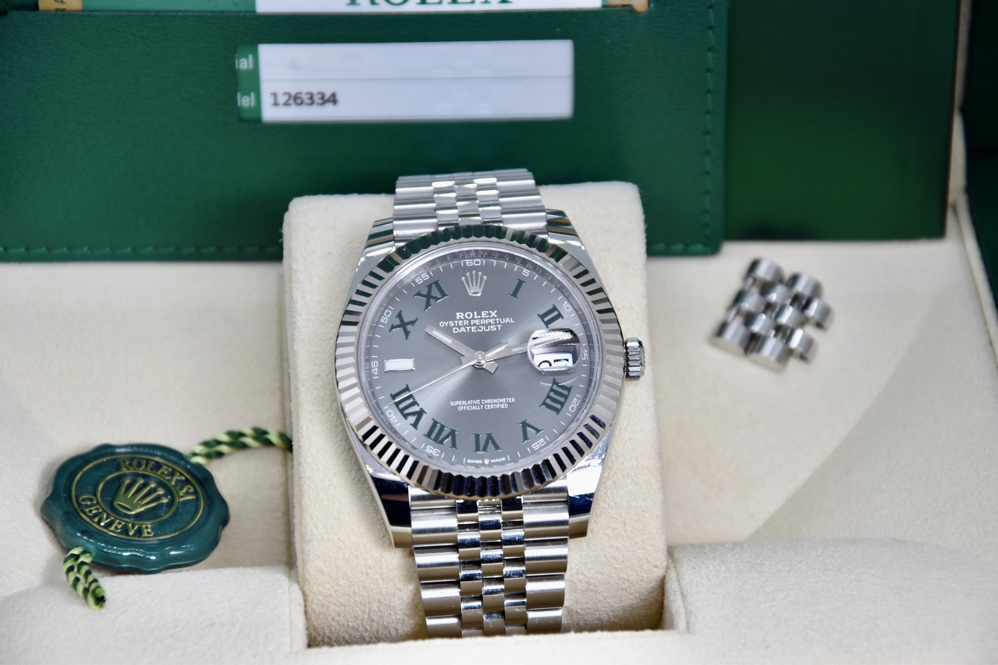 Rolex Datejust ref. 126334 del 2020. Orologio in acciaio in condizioni ottime. Movimento a carica automatica. Splendido quadrante "Wimbledon" grigio con numeri arabi verde. Ghiera zigrinata in oro bianco. Diametro cassa 41mm. Vetro zaffiro. Indicatore del datario. Corona a vite originale. Bracciale jubilee in ottime condizioni. Con scatola e garanzia originali.