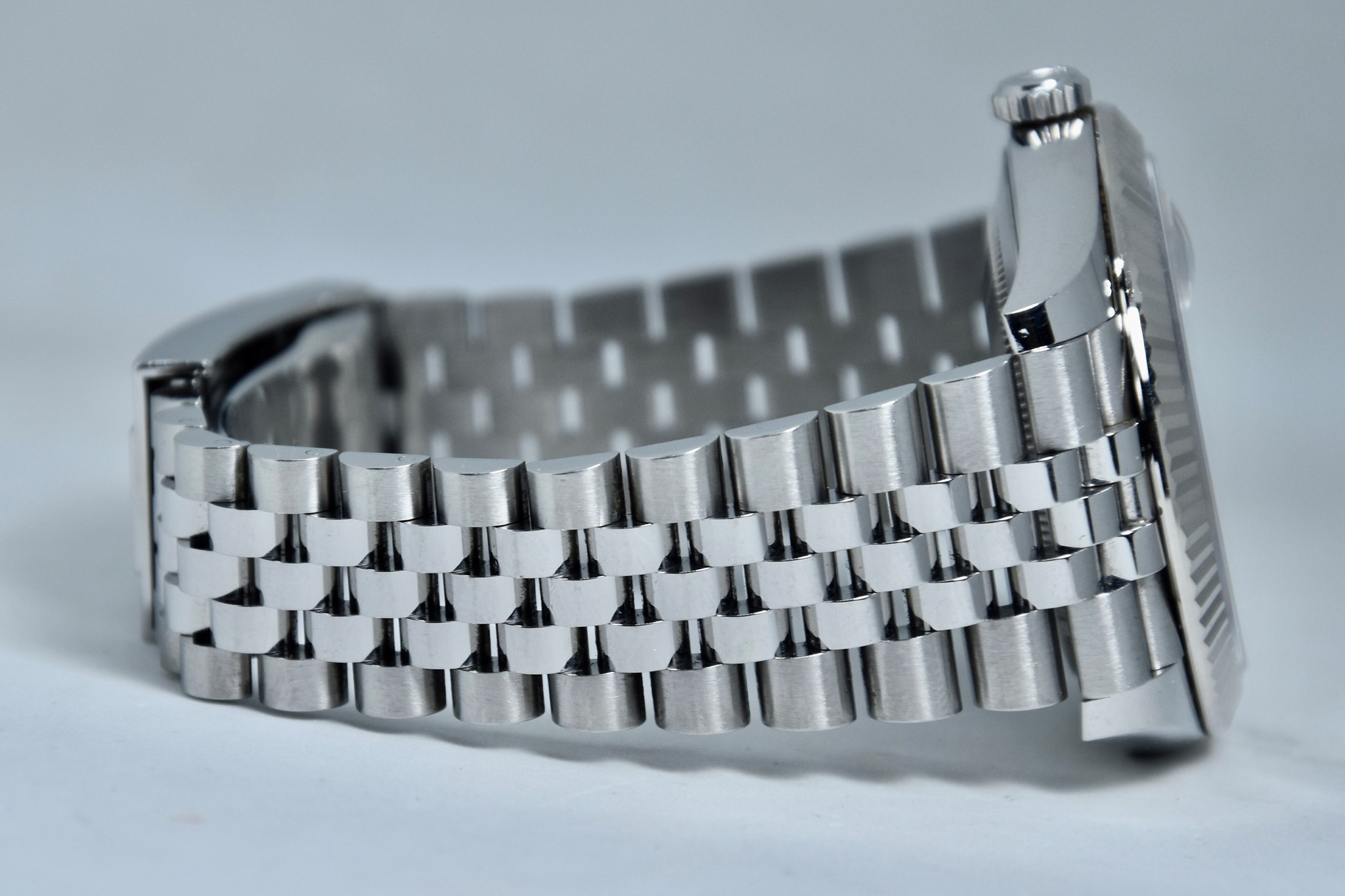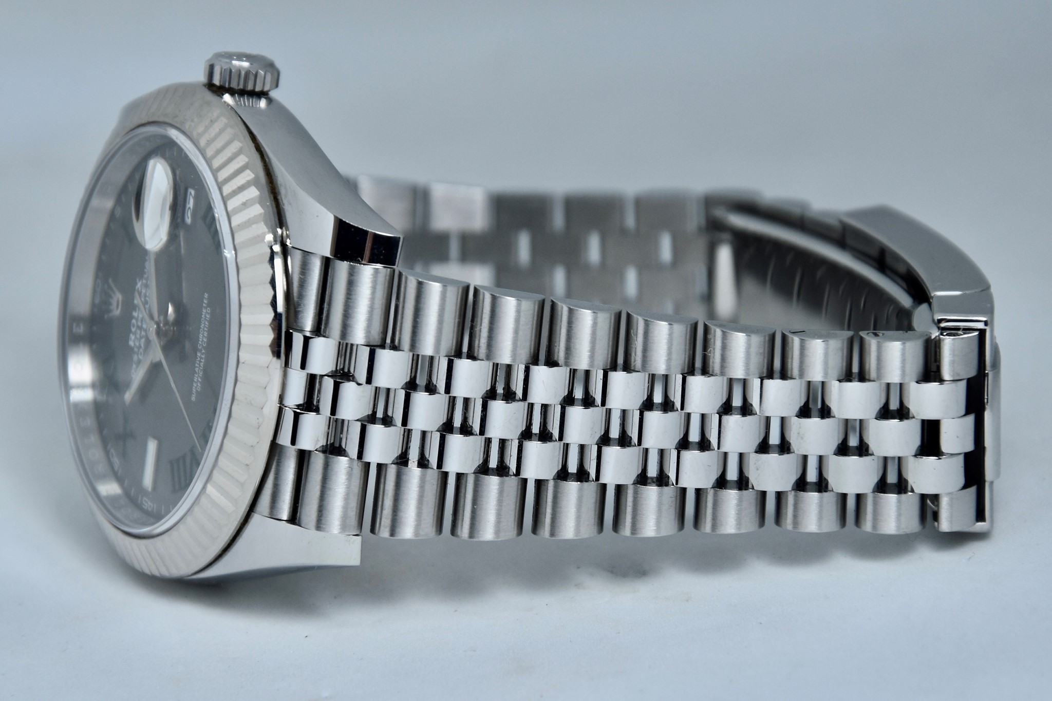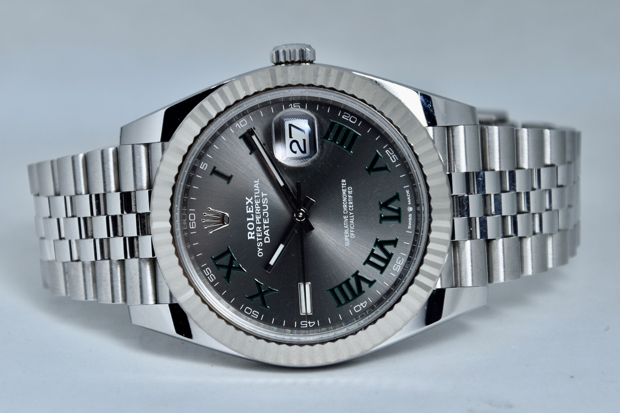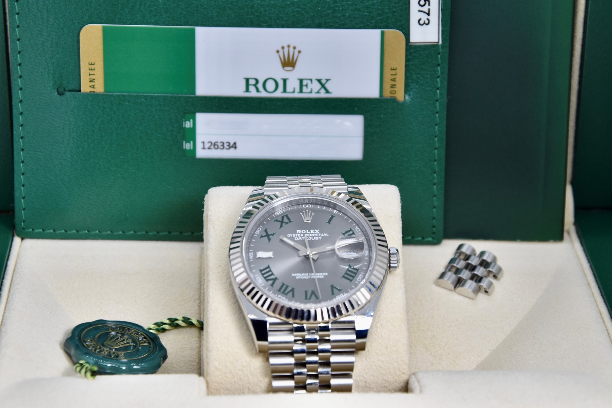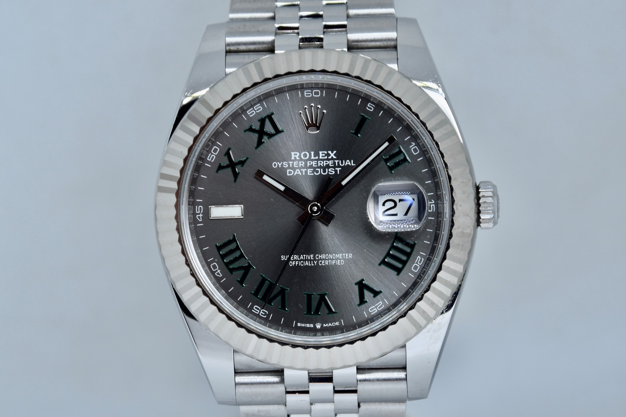 Rolex Datejust ref. 126334 del 2020. Orologio in acciaio in condizioni ottime. Movimento a carica automatica. Splendido quadrante "Wimbledon" grigio con numeri arabi verde. Ghiera zigrinata in oro bianco. Diametro cassa 41mm. Vetro zaffiro. Indicatore del datario. Corona a vite originale. Bracciale jubilee in ottime condizioni. Con scatola e garanzia originali.