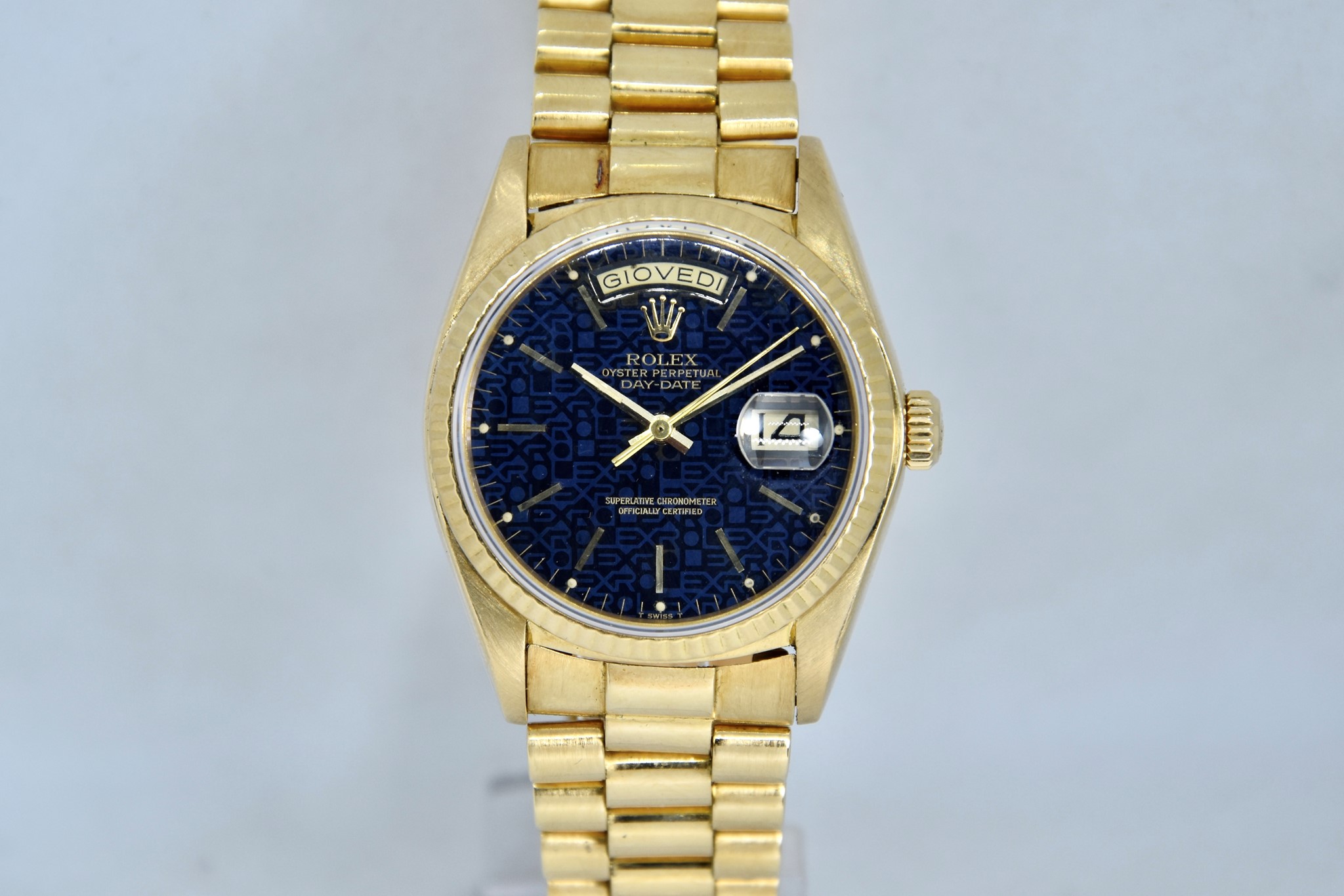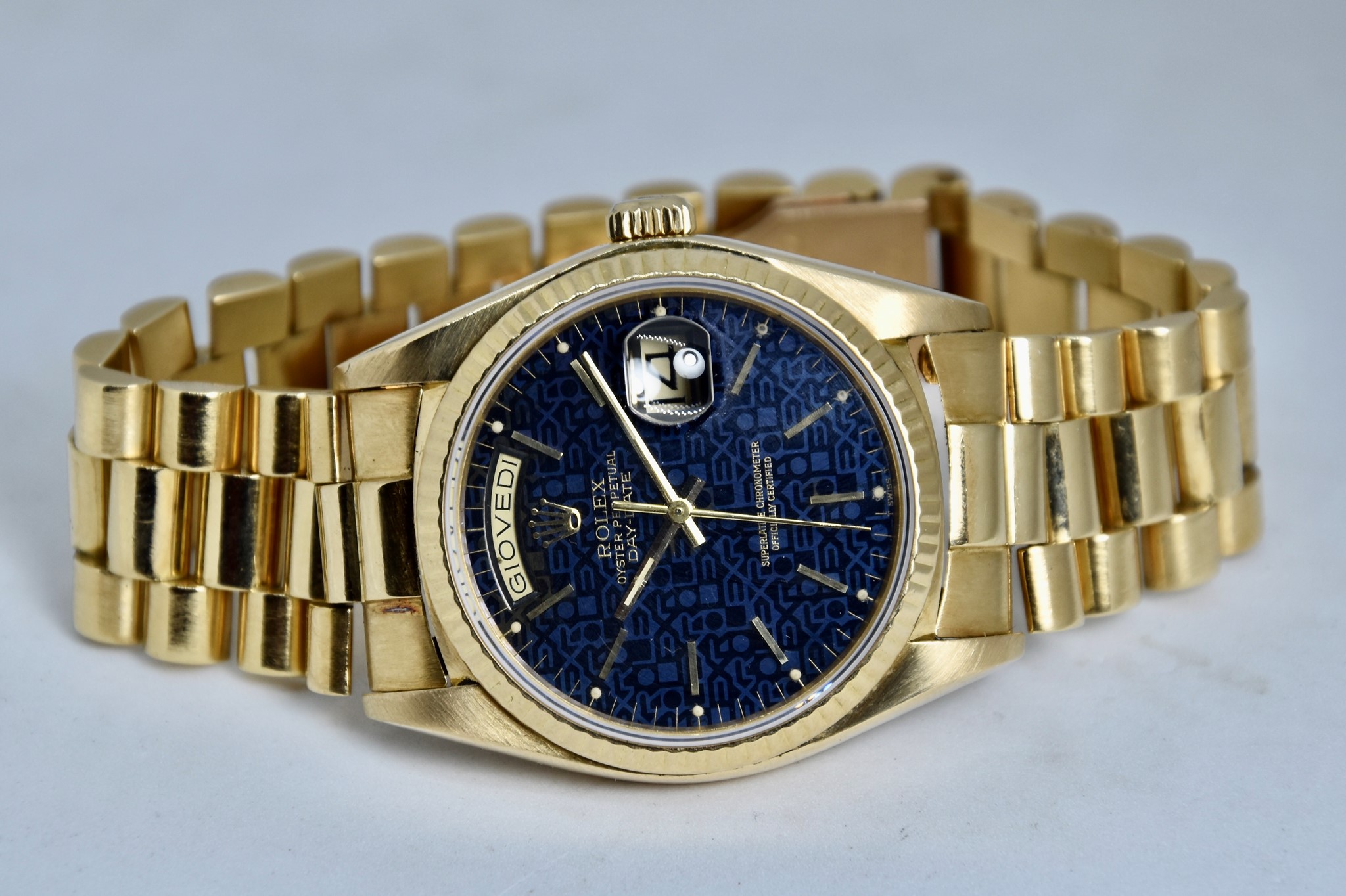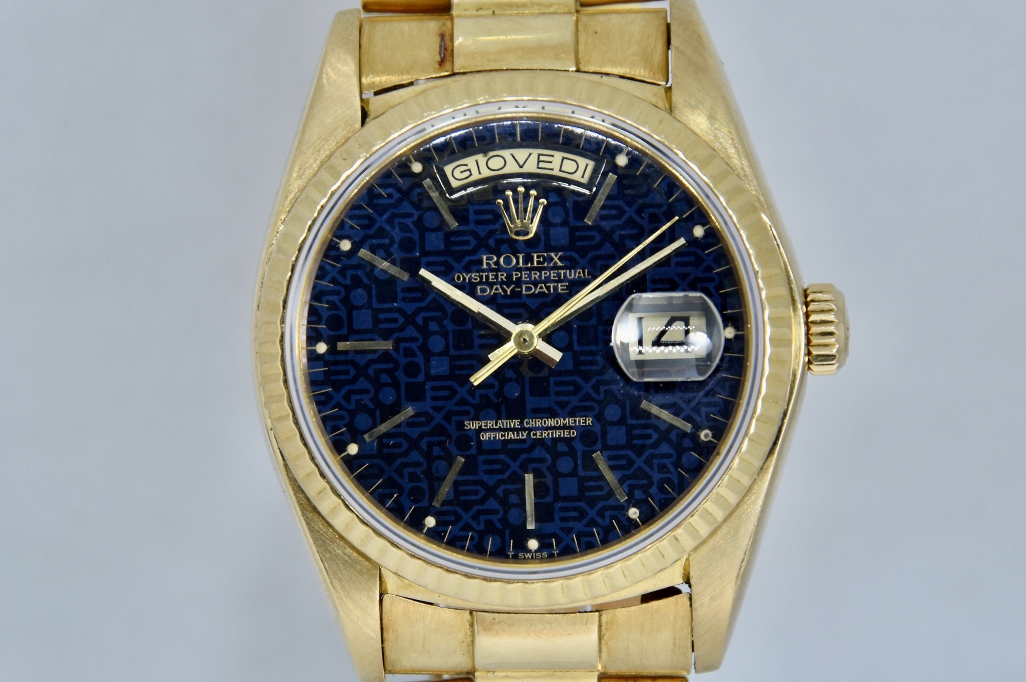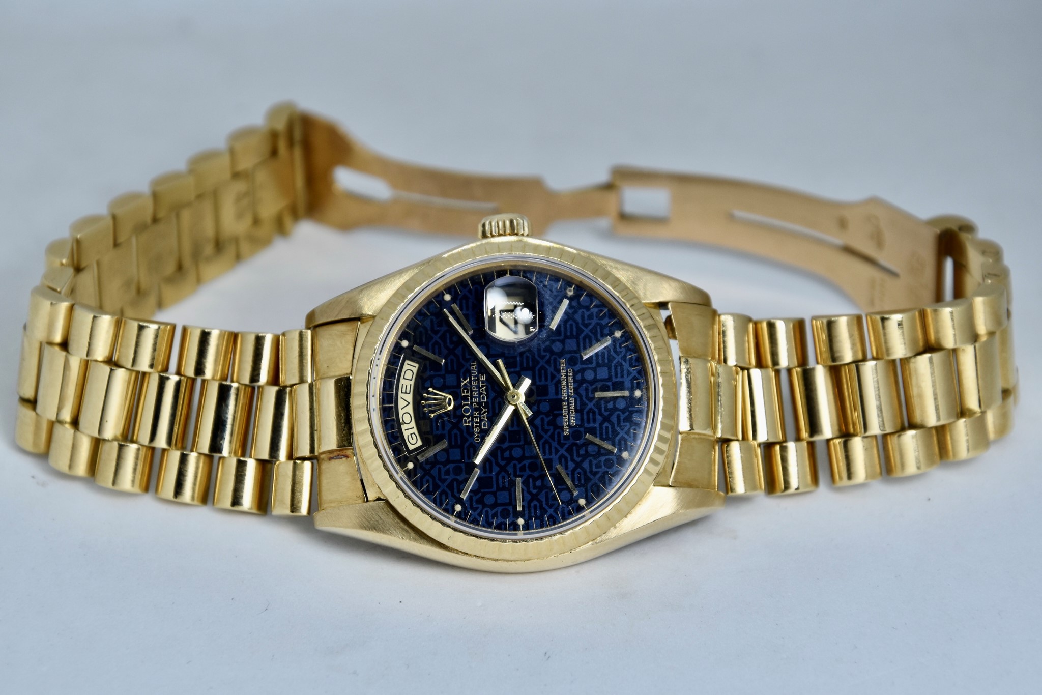 Rolex Day-Date ref. 18038 del 1980. Orologio in oro giallo in buone condizioni. Quadrante Blu jubilee molto raro. Movimento a carica automatica. Ghiera zigrinata in oro giallo. Diametro cassa 36mm. Indicatore del datario e giorno della settimana in italiano. Vetro zaffiro. Sfere e indici in oro 750/00. Il bracciale ha la deployante originale però finali e la corona applicata esternamente non lo sono. Peso bracciale 68.80g. Con nostra scatola.