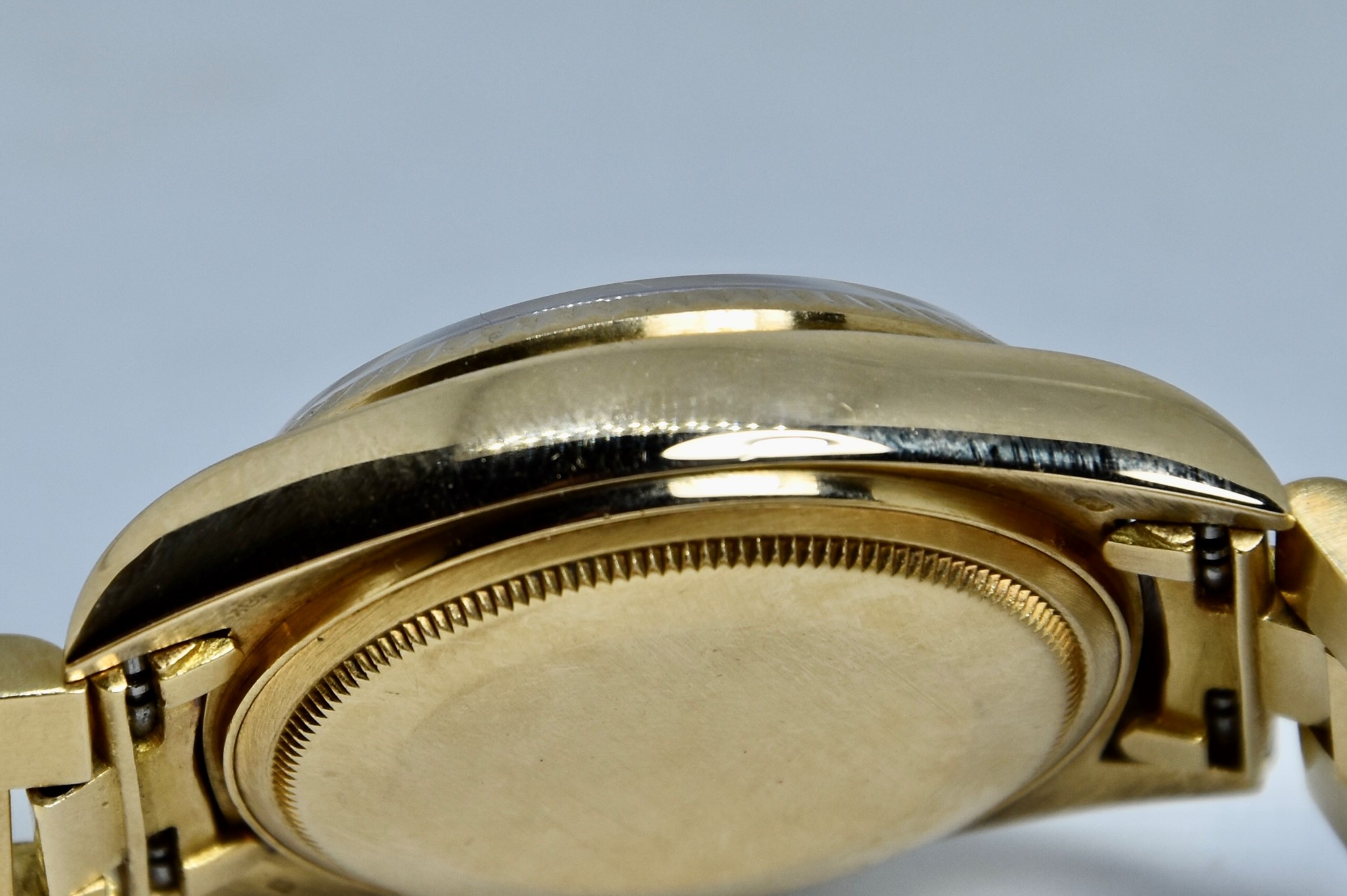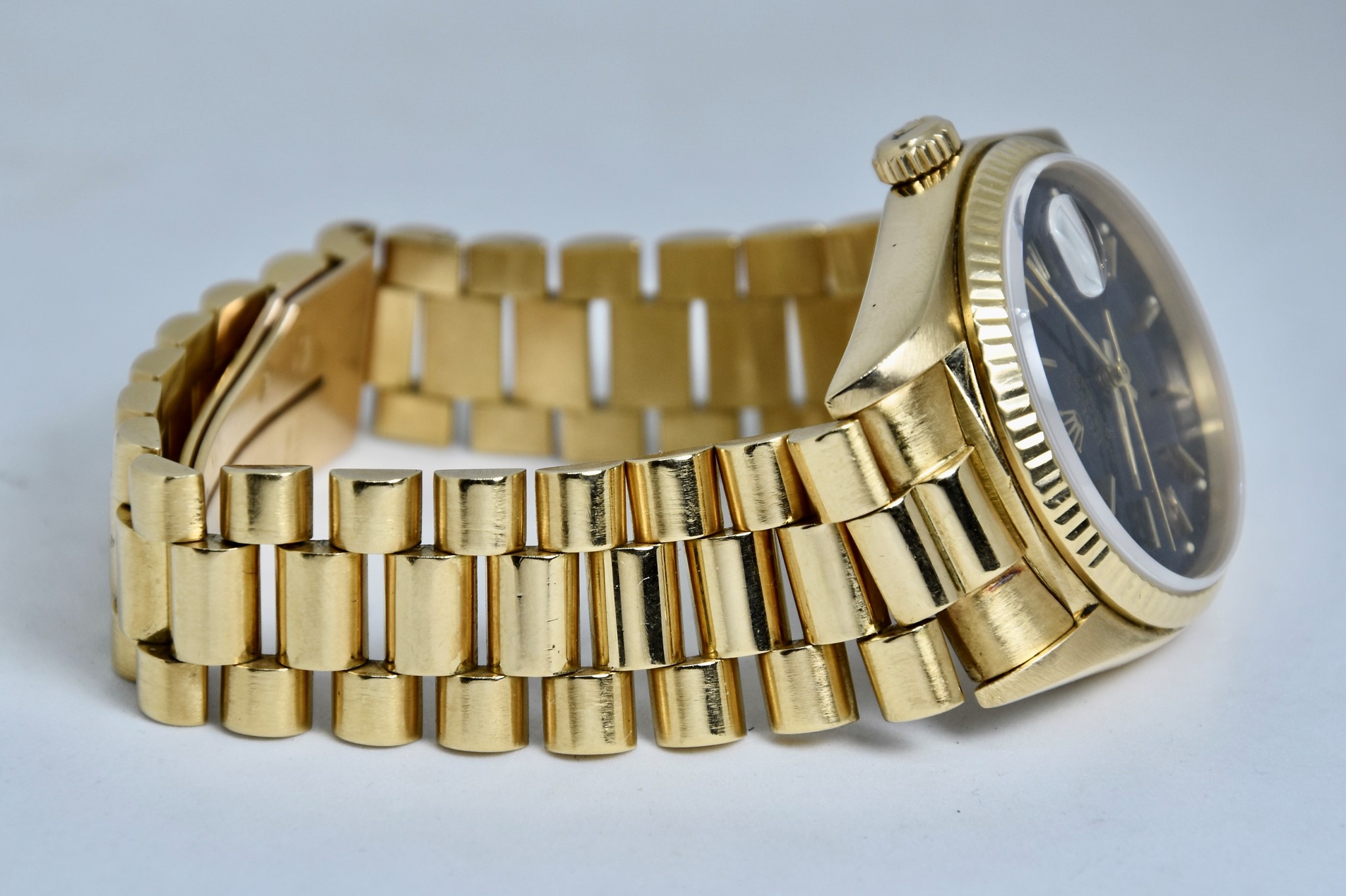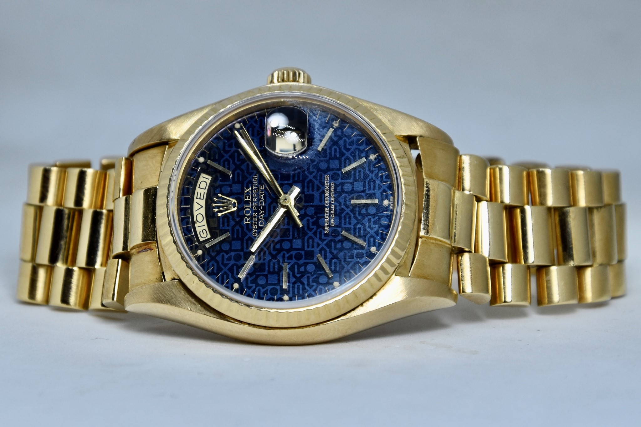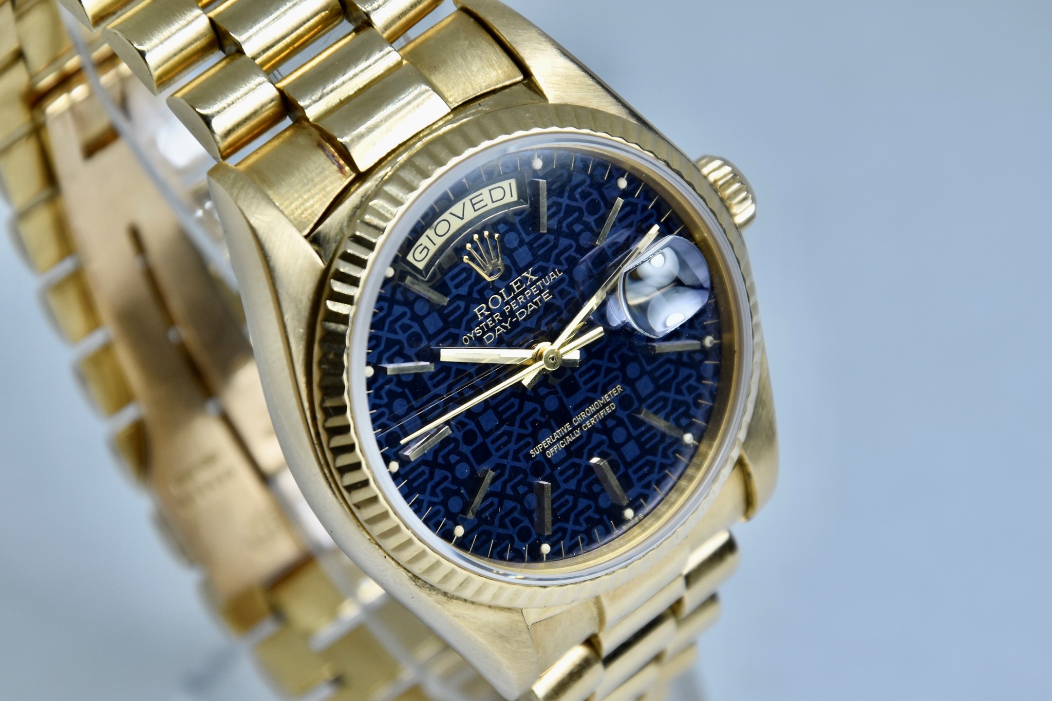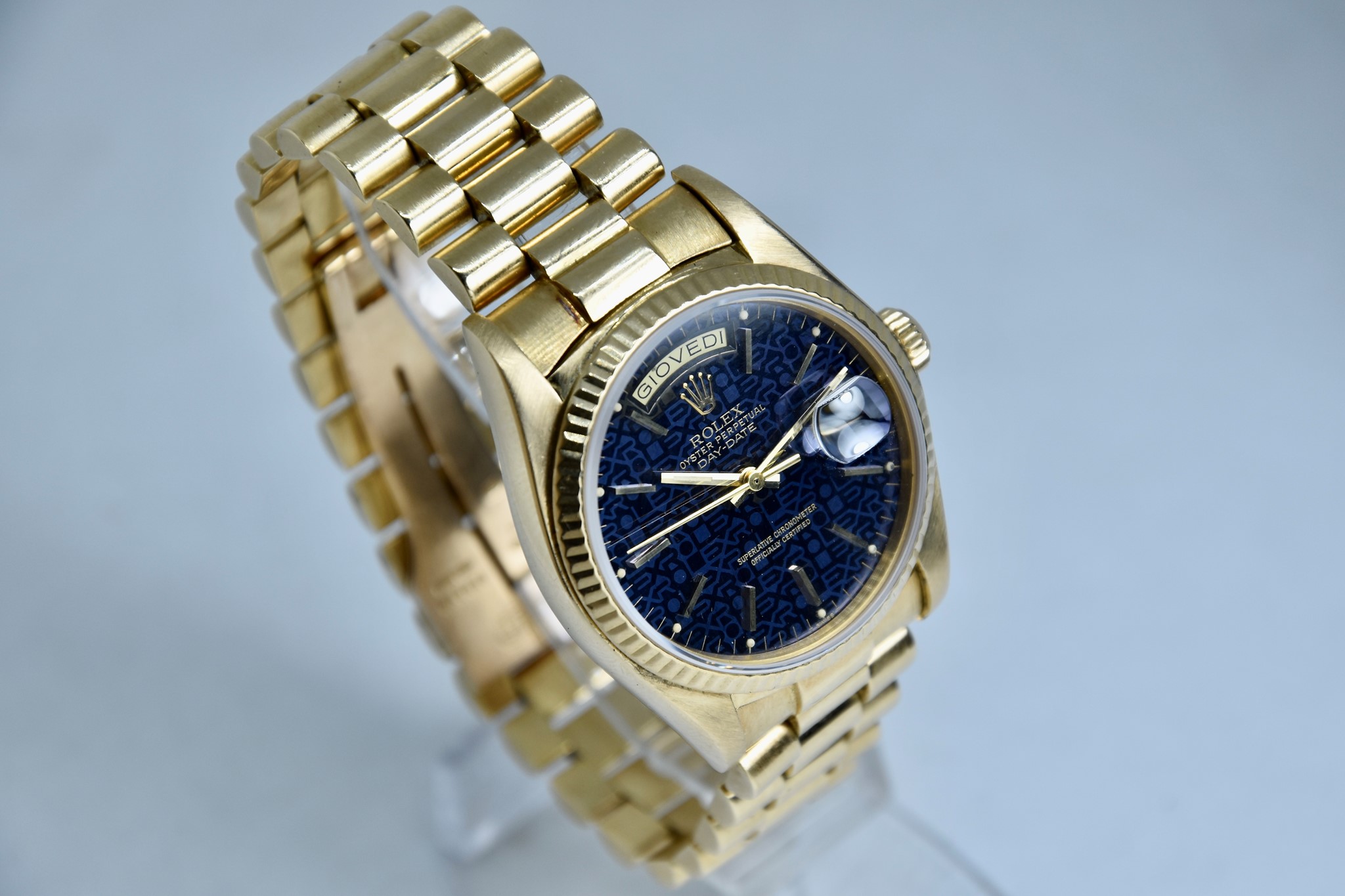 Rolex Day-Date ref. 18038 del 1980. Orologio in oro giallo in buone condizioni. Quadrante Blu jubilee molto raro. Movimento a carica automatica. Ghiera zigrinata in oro giallo. Diametro cassa 36mm. Indicatore del datario e giorno della settimana in italiano. Vetro zaffiro. Sfere e indici in oro 750/00. Il bracciale ha la deployante originale però finali e la corona applicata esternamente non lo sono. Peso bracciale 68.80g. Con nostra scatola.