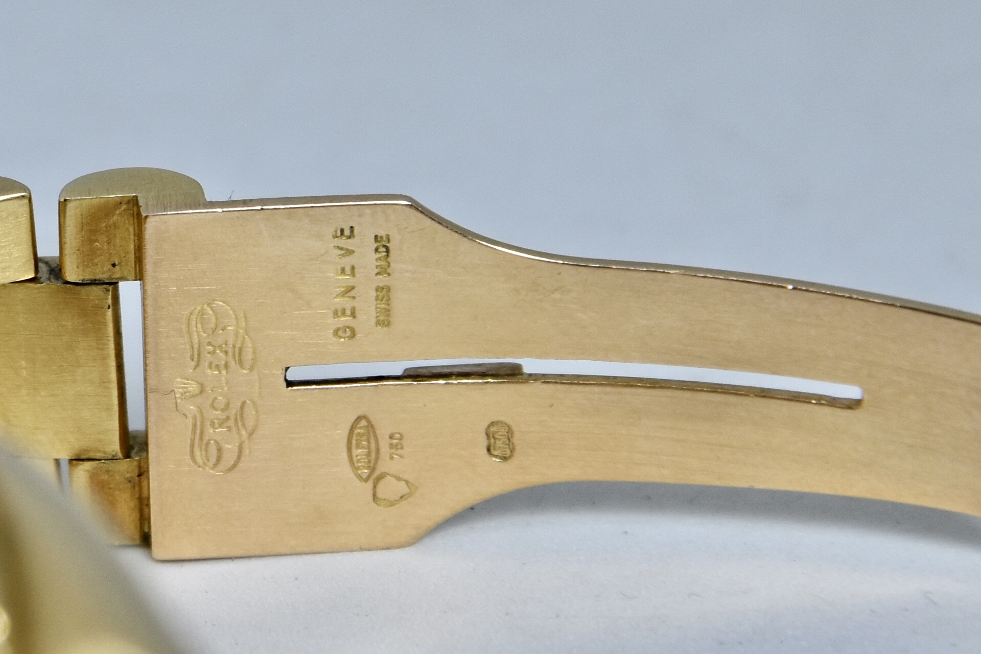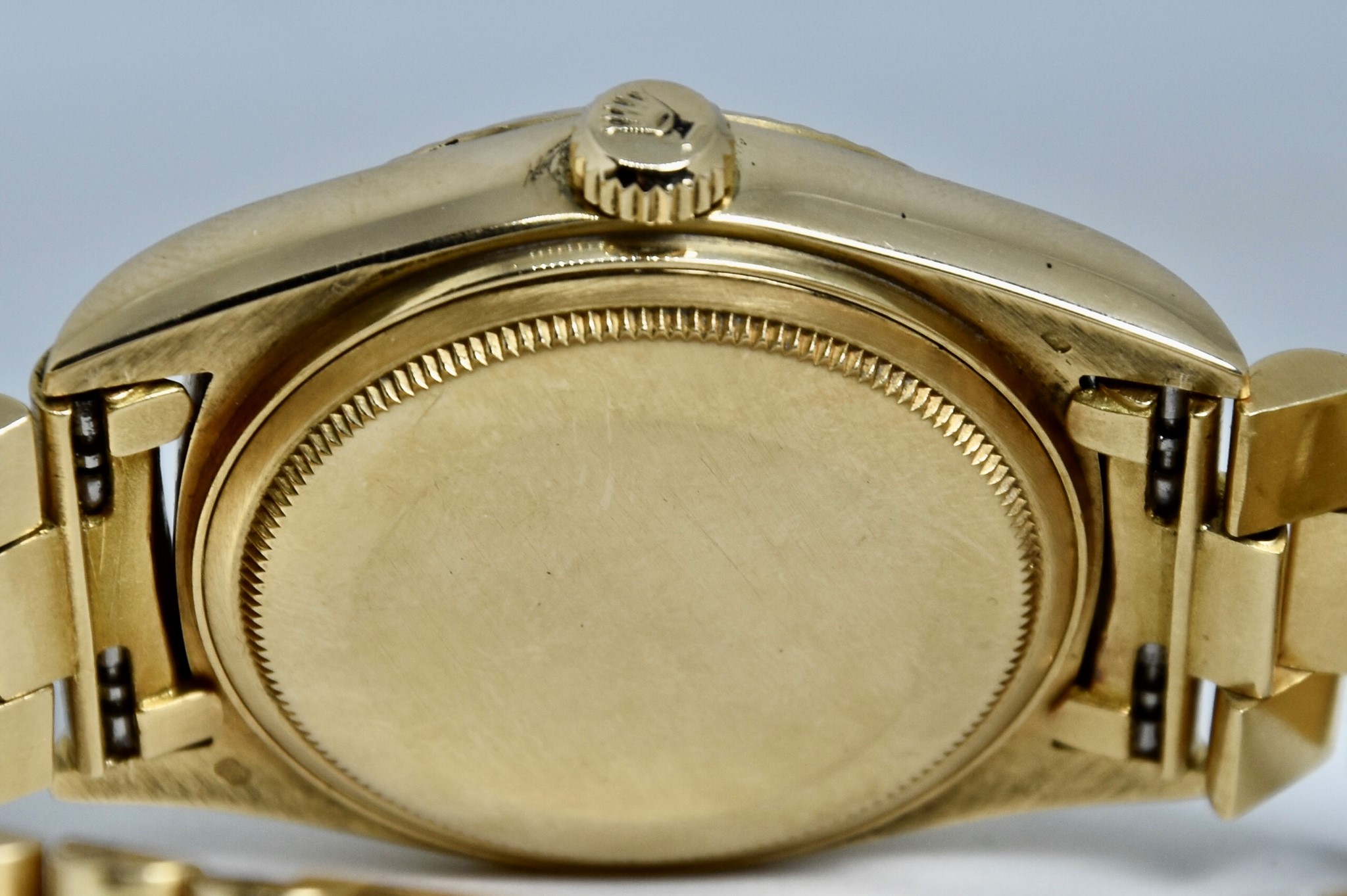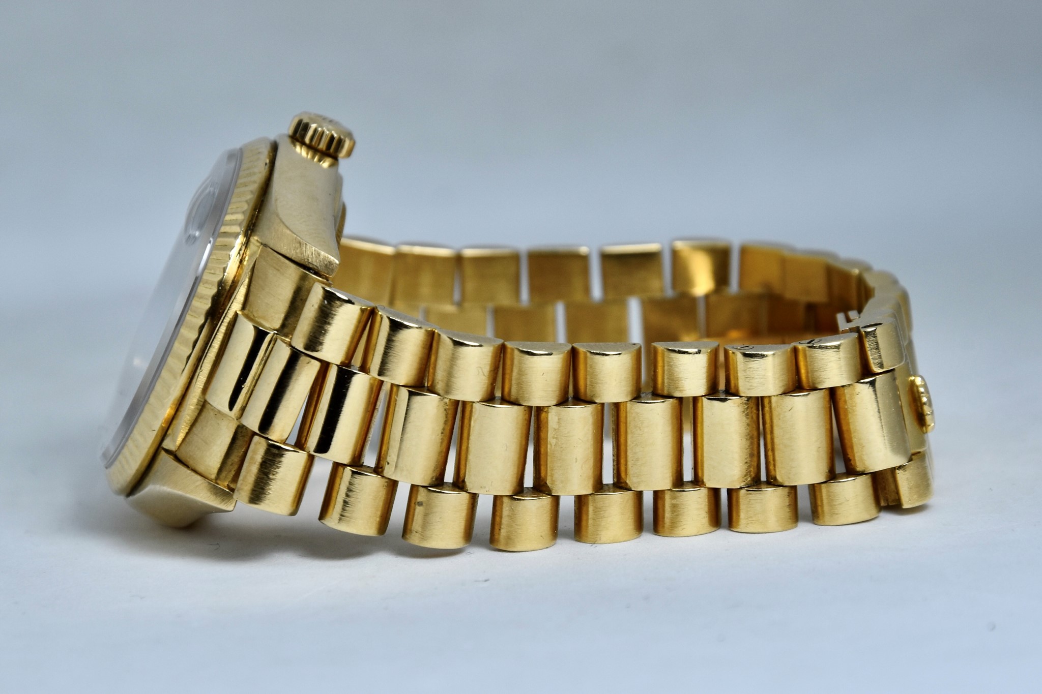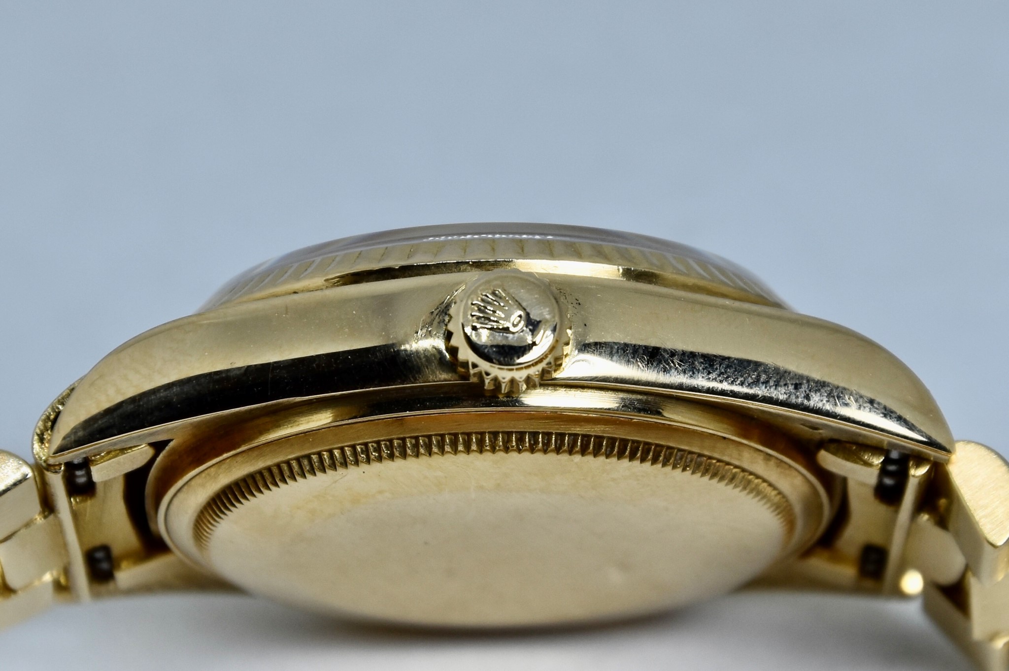 Rolex Day-Date ref. 18038 del 1980. Orologio in oro giallo in buone condizioni. Quadrante Blu jubilee molto raro. Movimento a carica automatica. Ghiera zigrinata in oro giallo. Diametro cassa 36mm. Indicatore del datario e giorno della settimana in italiano. Vetro zaffiro. Sfere e indici in oro 750/00. Il bracciale ha la deployante originale però finali e la corona applicata esternamente non lo sono. Peso bracciale 68.80g. Con nostra scatola.