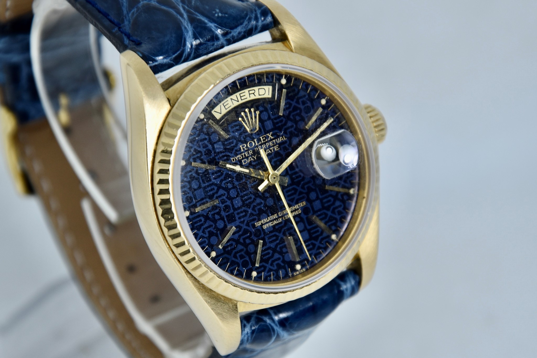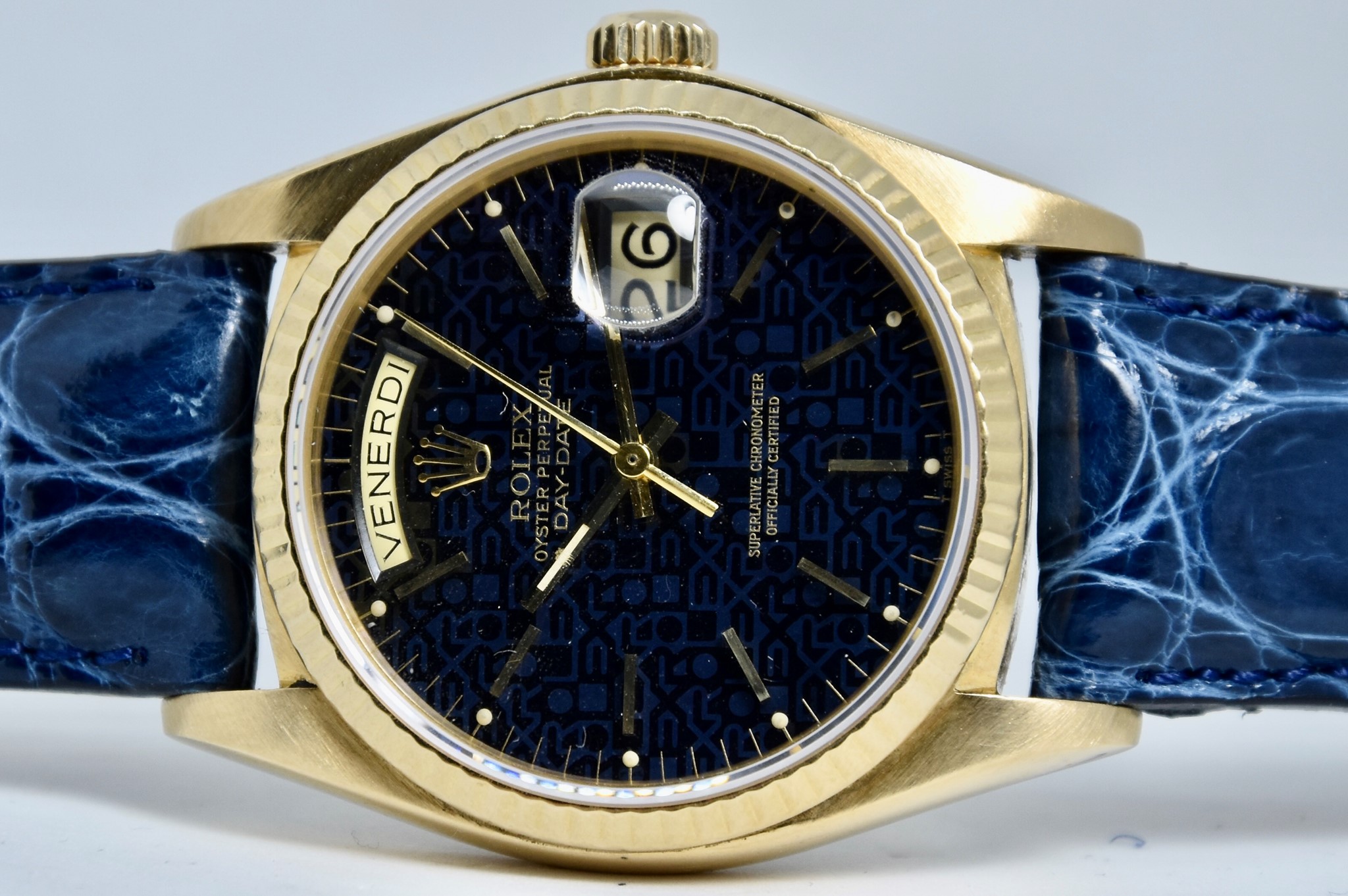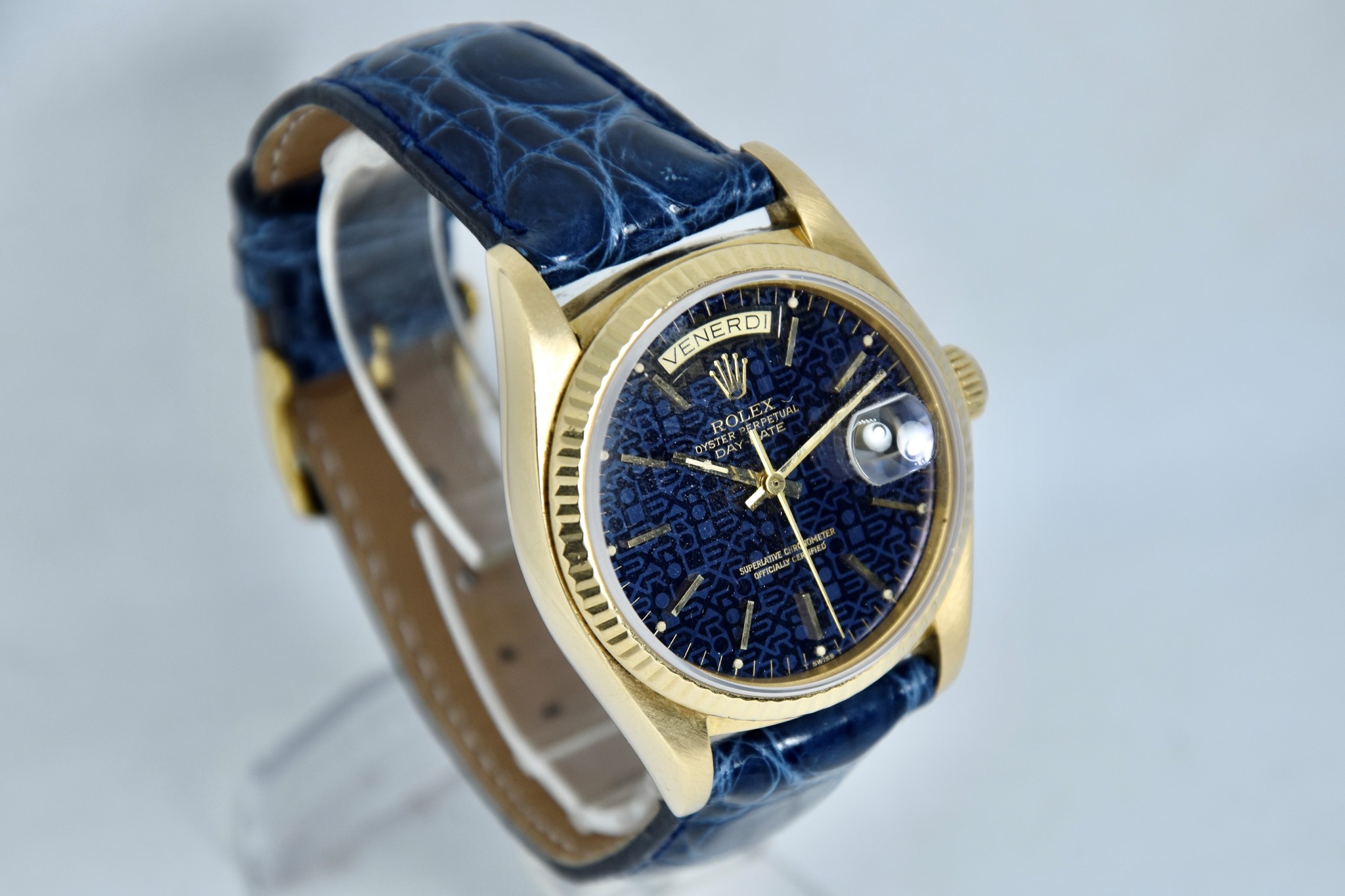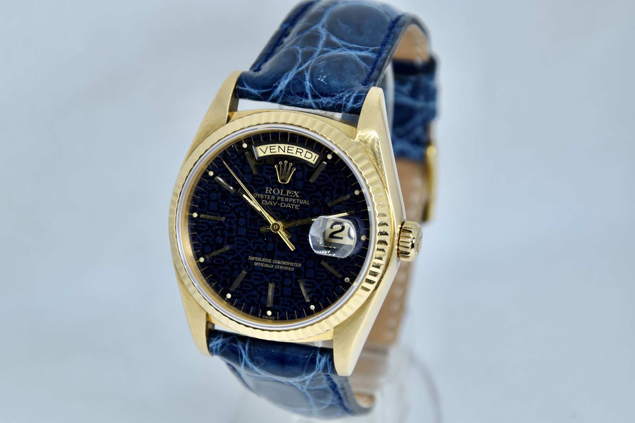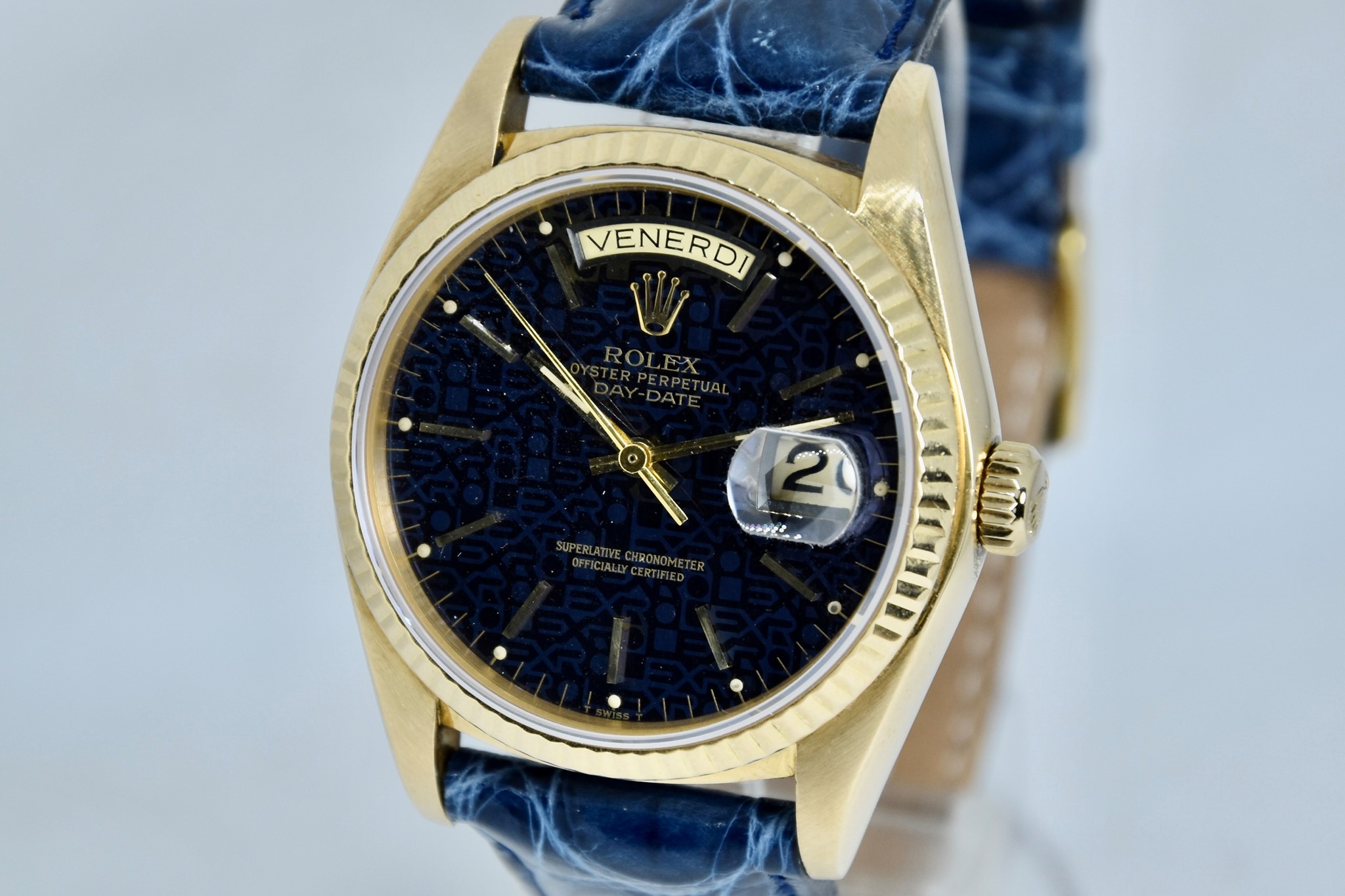 Rolex Day-Date ref. 18038 del 1980. Orologio in oro giallo in buone condizioni. Quadrante Blu jubilee molto raro. Movimento a carica automatica. Ghiera zigrinata in oro giallo. Diametro cassa 36mm. Indicatore del datario e giorno della settimana in italiano. Vetro zaffiro. Sfere e indici in oro 750/00. Chiusura ad ardiglione originale Rolex placcata. Con nostra scatola.