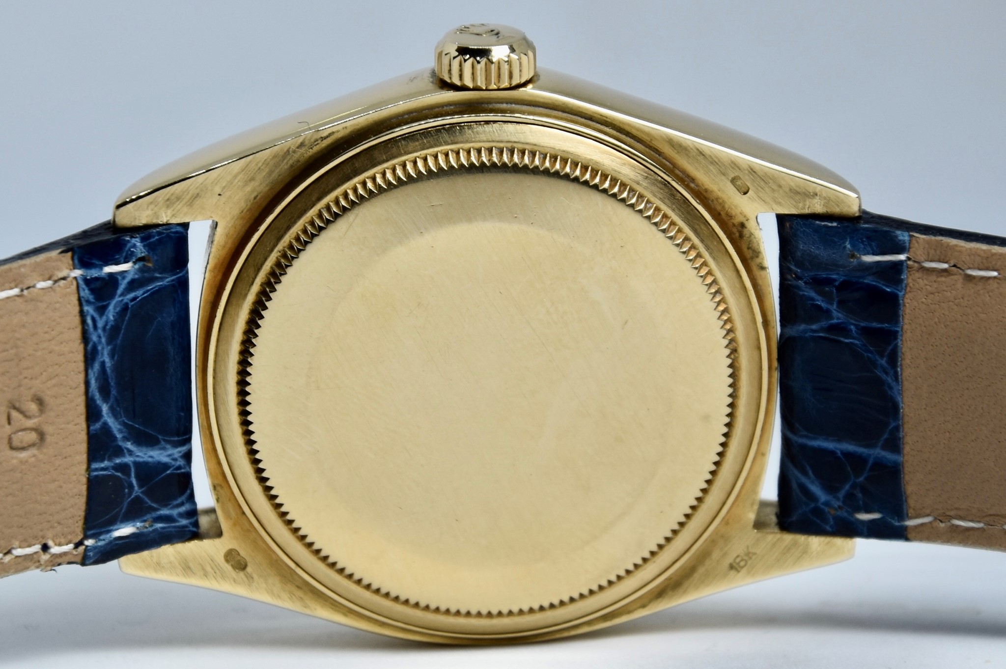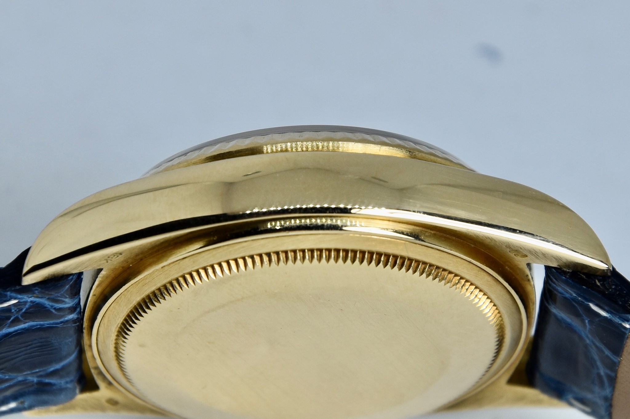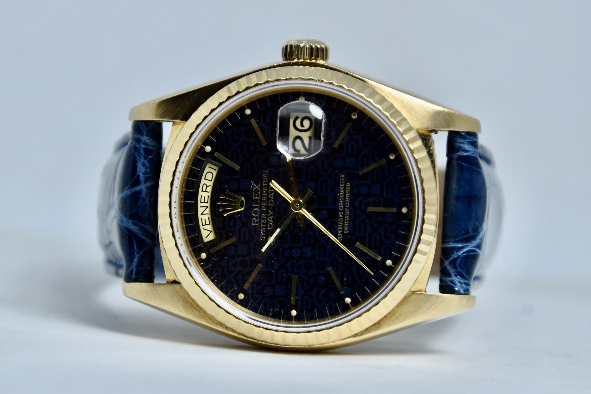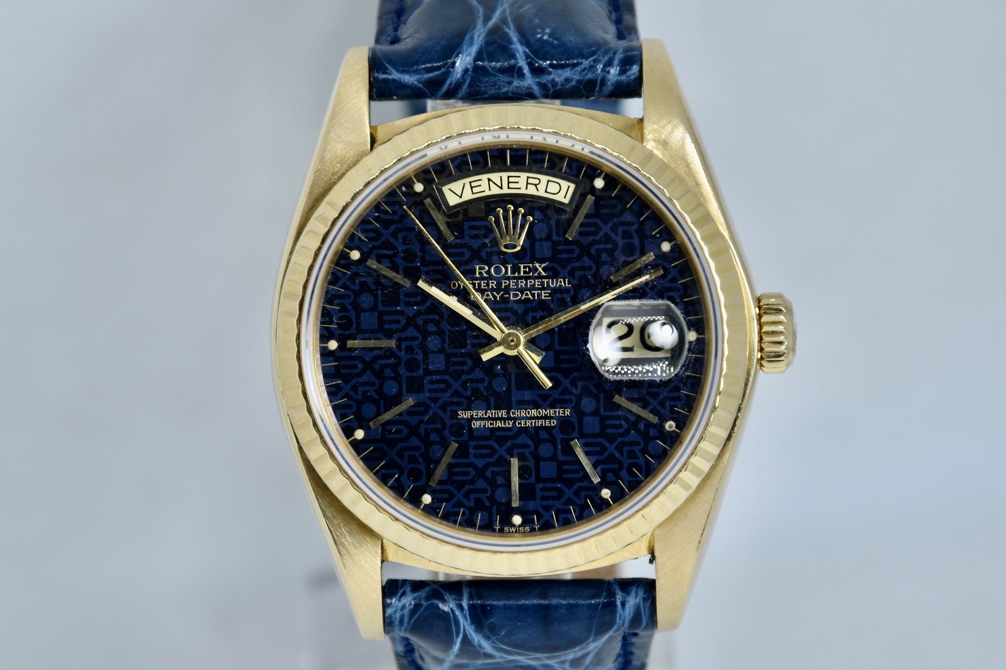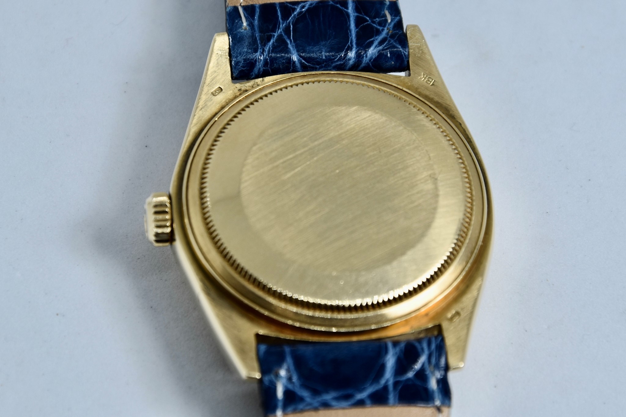 Rolex Day-Date ref. 18038 del 1980. Orologio in oro giallo in buone condizioni. Quadrante Blu jubilee molto raro. Movimento a carica automatica. Ghiera zigrinata in oro giallo. Diametro cassa 36mm. Indicatore del datario e giorno della settimana in italiano. Vetro zaffiro. Sfere e indici in oro 750/00. Chiusura ad ardiglione originale Rolex placcata. Con nostra scatola.