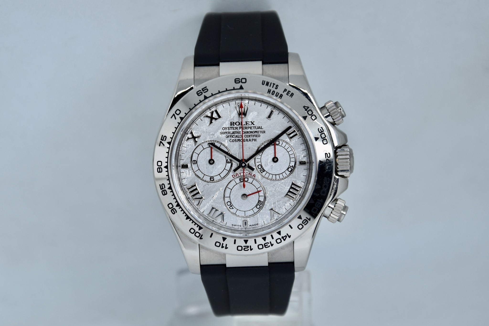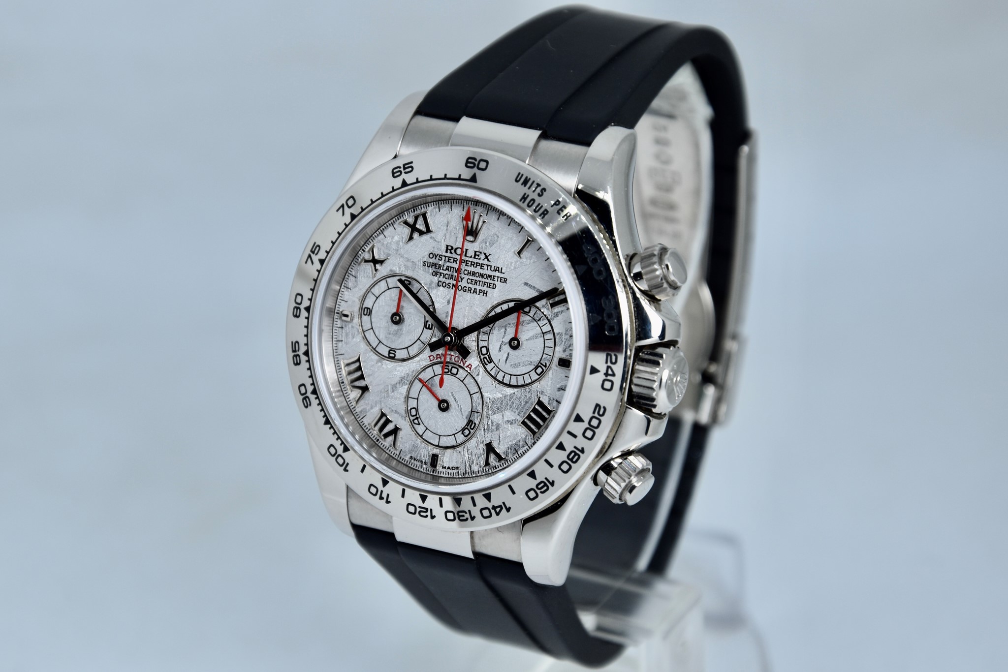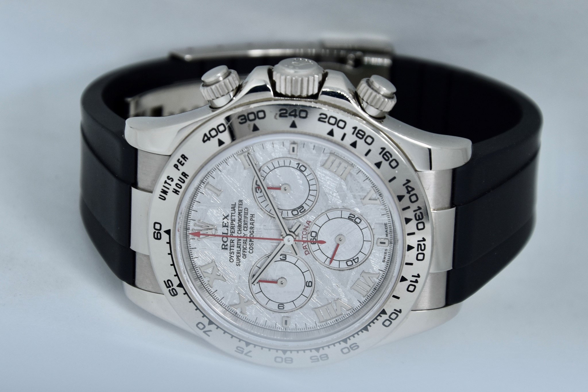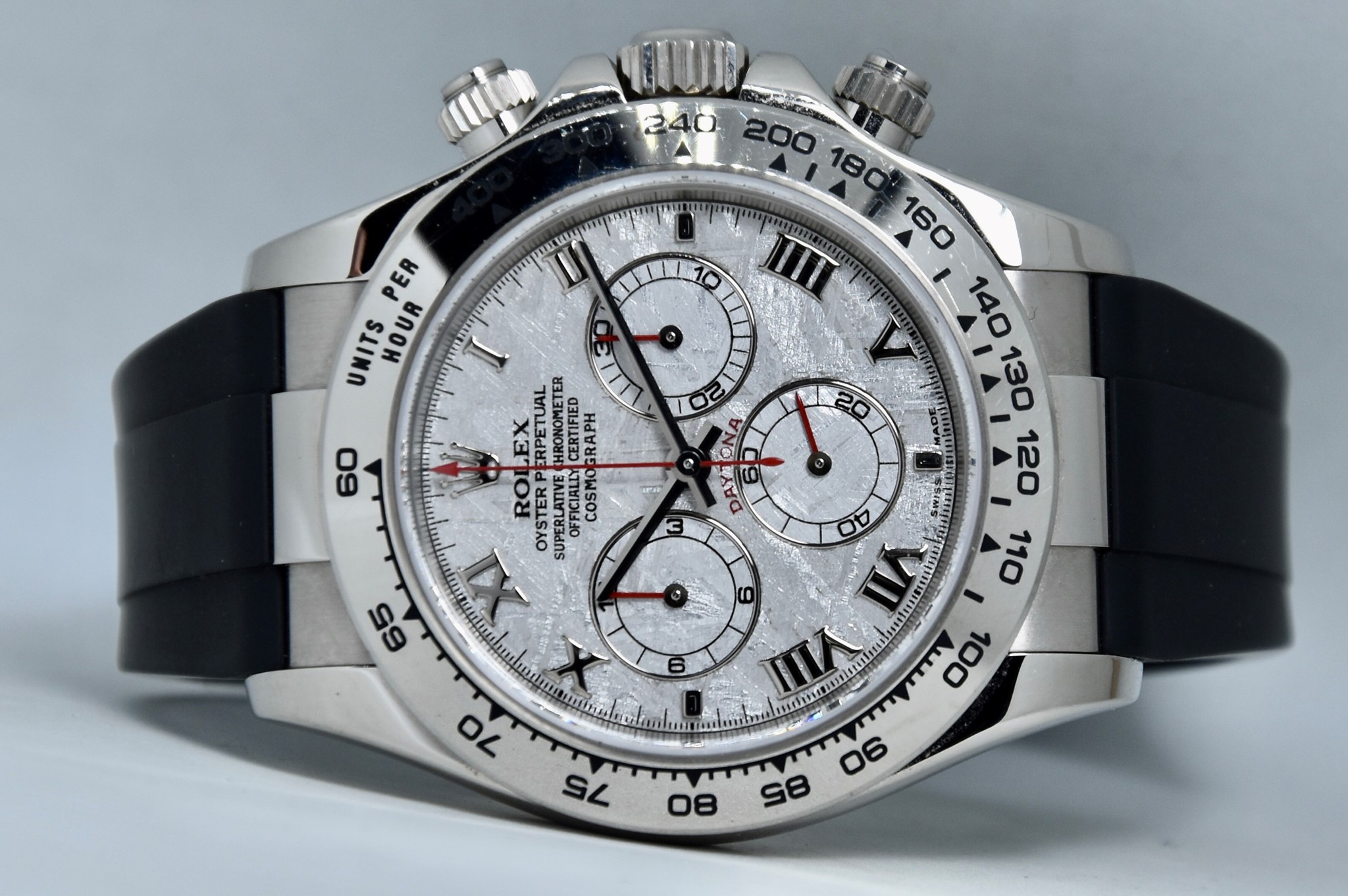 Rolex Daytona Meteorite ref. 116519 del 2004. Orologio in oro bianco in ottime condizioni. Orologio raro e per veri intenditori. Quadrante spettacolare in vero meteorite. Numeri romani in oro bianco. Movimento a carica automatica. Diametro cassa 40mm. Vetro zaffiro. Deployante originle in oro bianco. Viene venduto con cinturino in gomma rubber B e cinturino originale Rolex in coccodrillo rosso (lunghezza da donna). Orologio mai lucidato. Con scatola e garanzia originale.