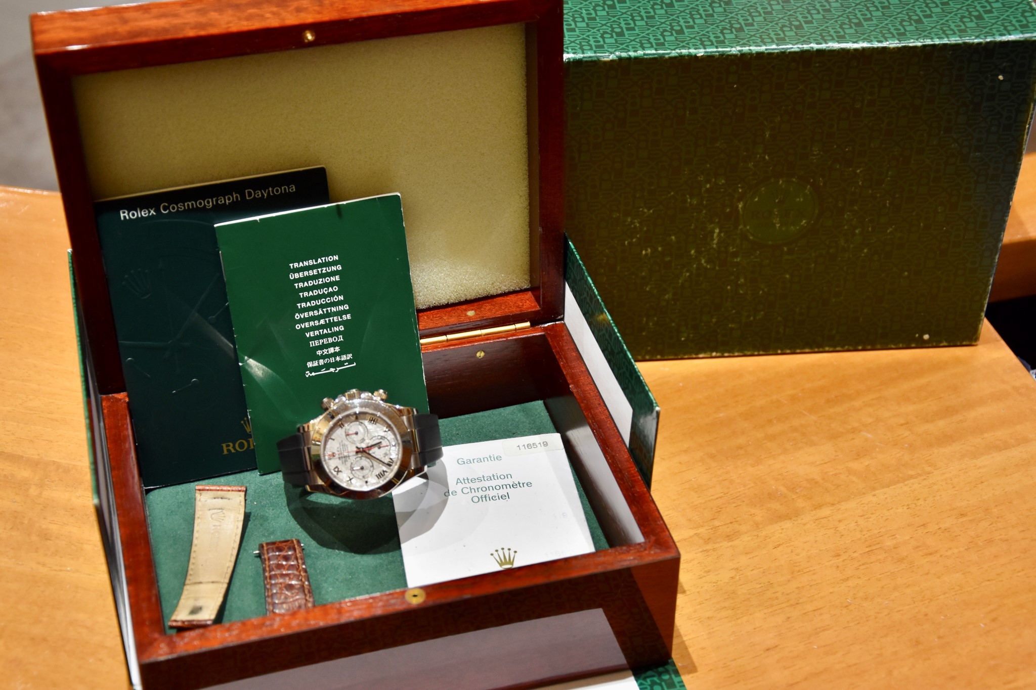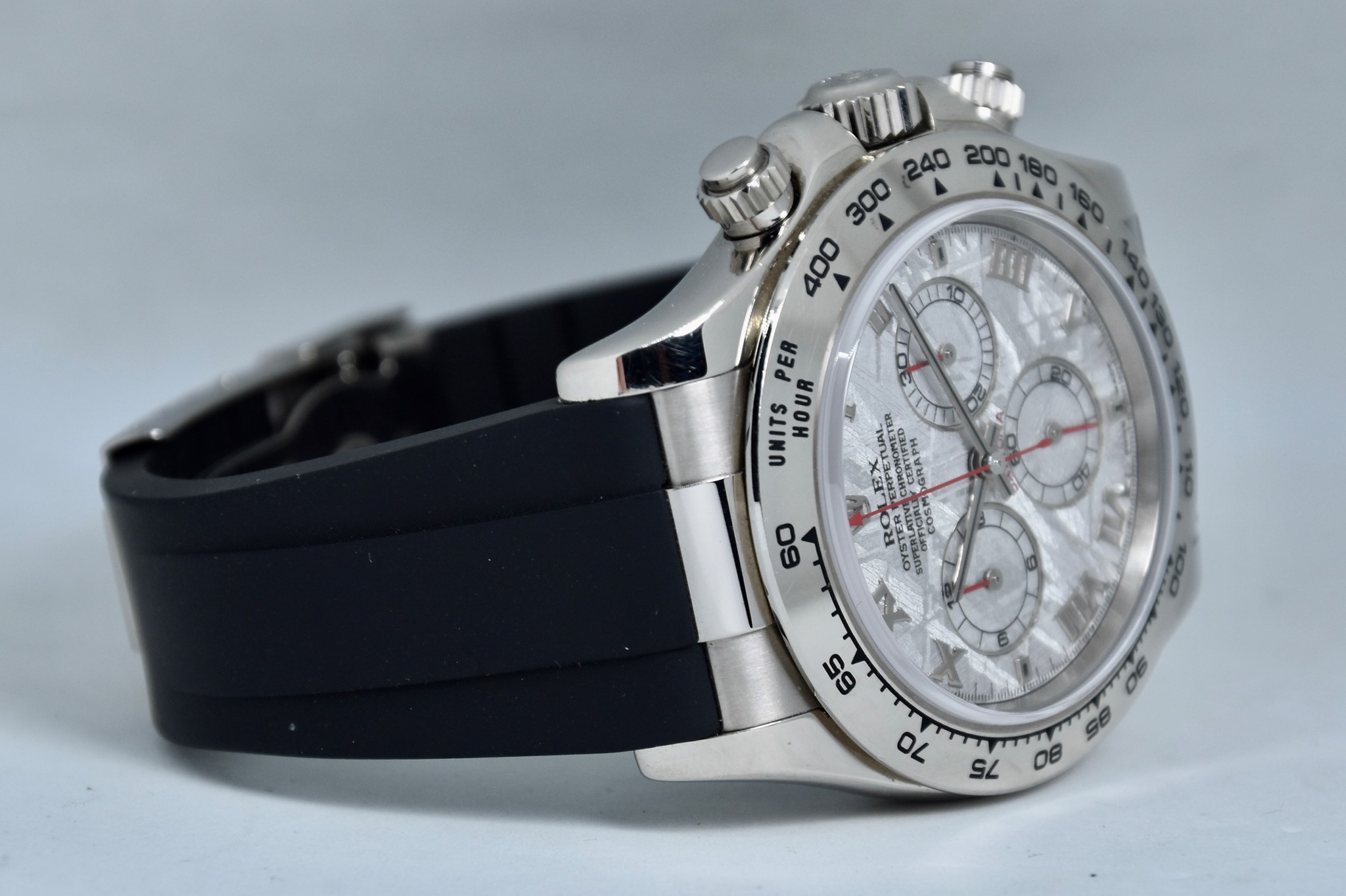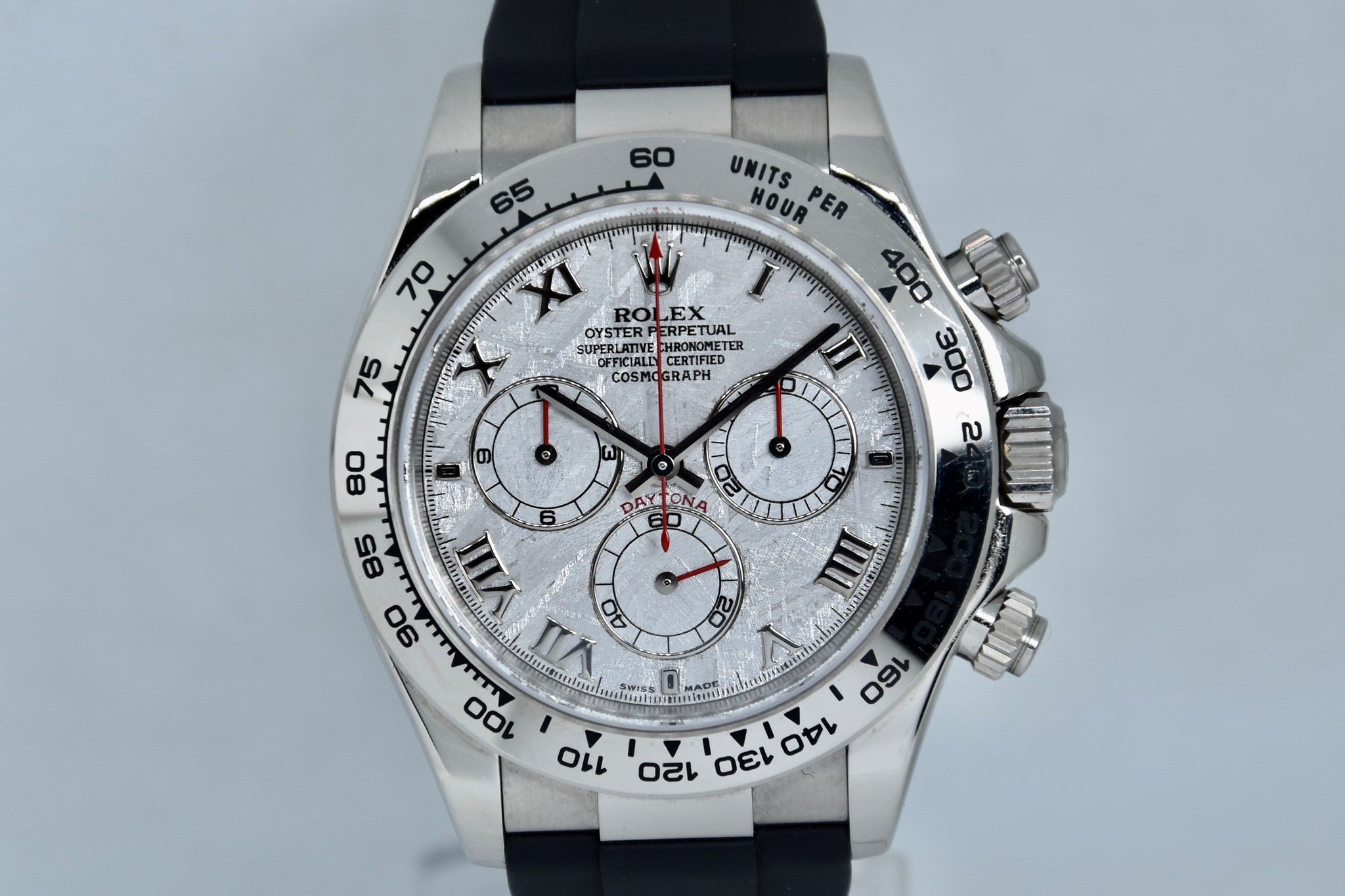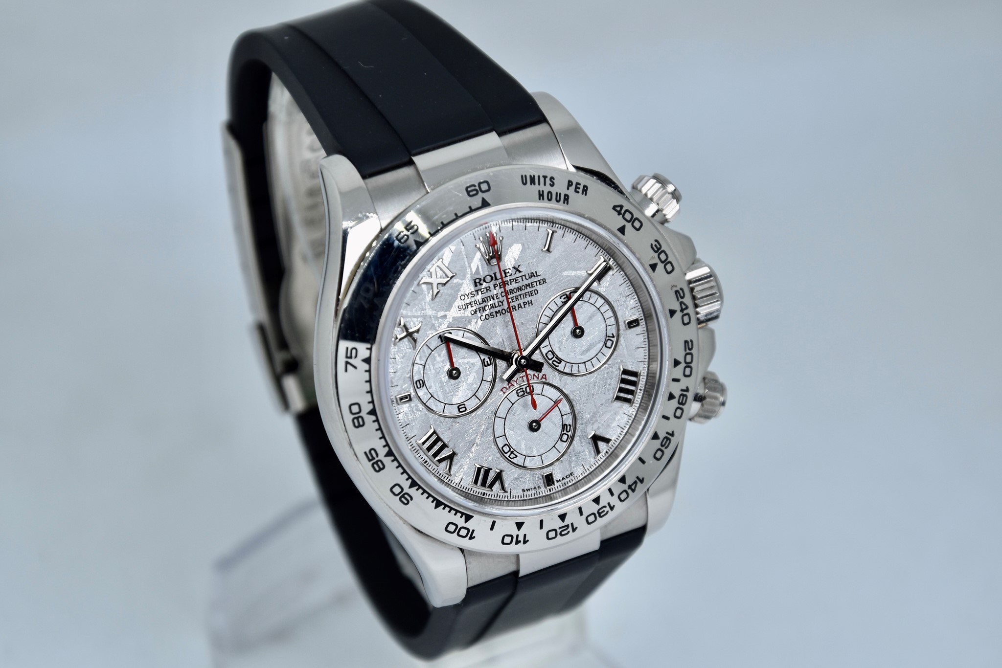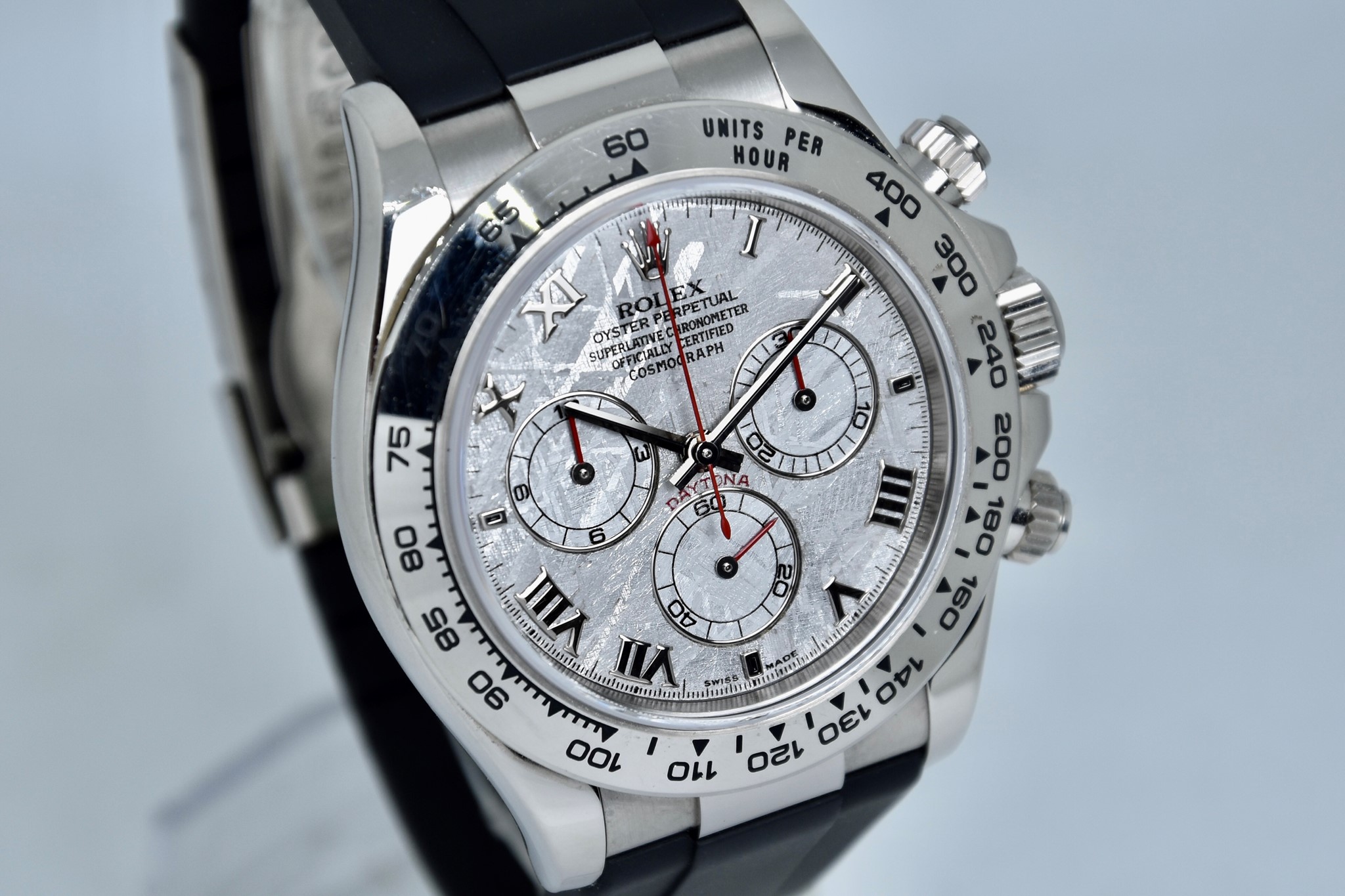Rolex Daytona Meteorite ref. 116519 del 2004. Orologio in oro bianco in ottime condizioni. Orologio raro e per veri intenditori. Quadrante spettacolare in vero meteorite. Numeri romani in oro bianco. Movimento a carica automatica. Diametro cassa 40mm. Vetro zaffiro. Deployante originle in oro bianco. Viene venduto con cinturino in gomma rubber B e cinturino originale Rolex in coccodrillo rosso (lunghezza da donna). Orologio mai lucidato. Con scatola e garanzia originale.
