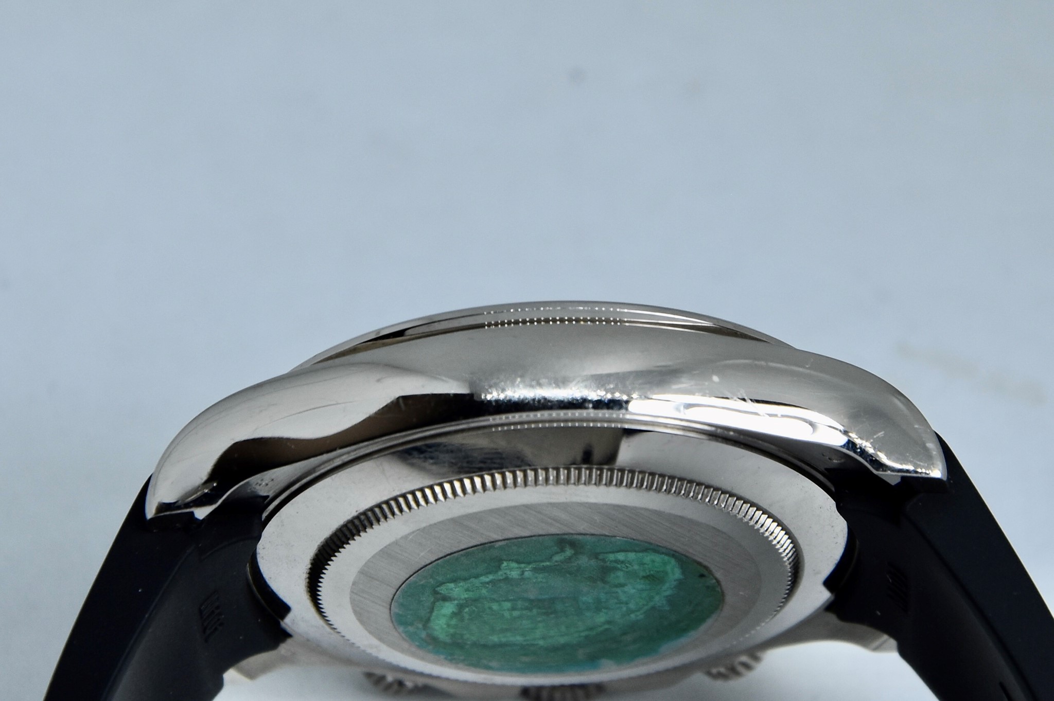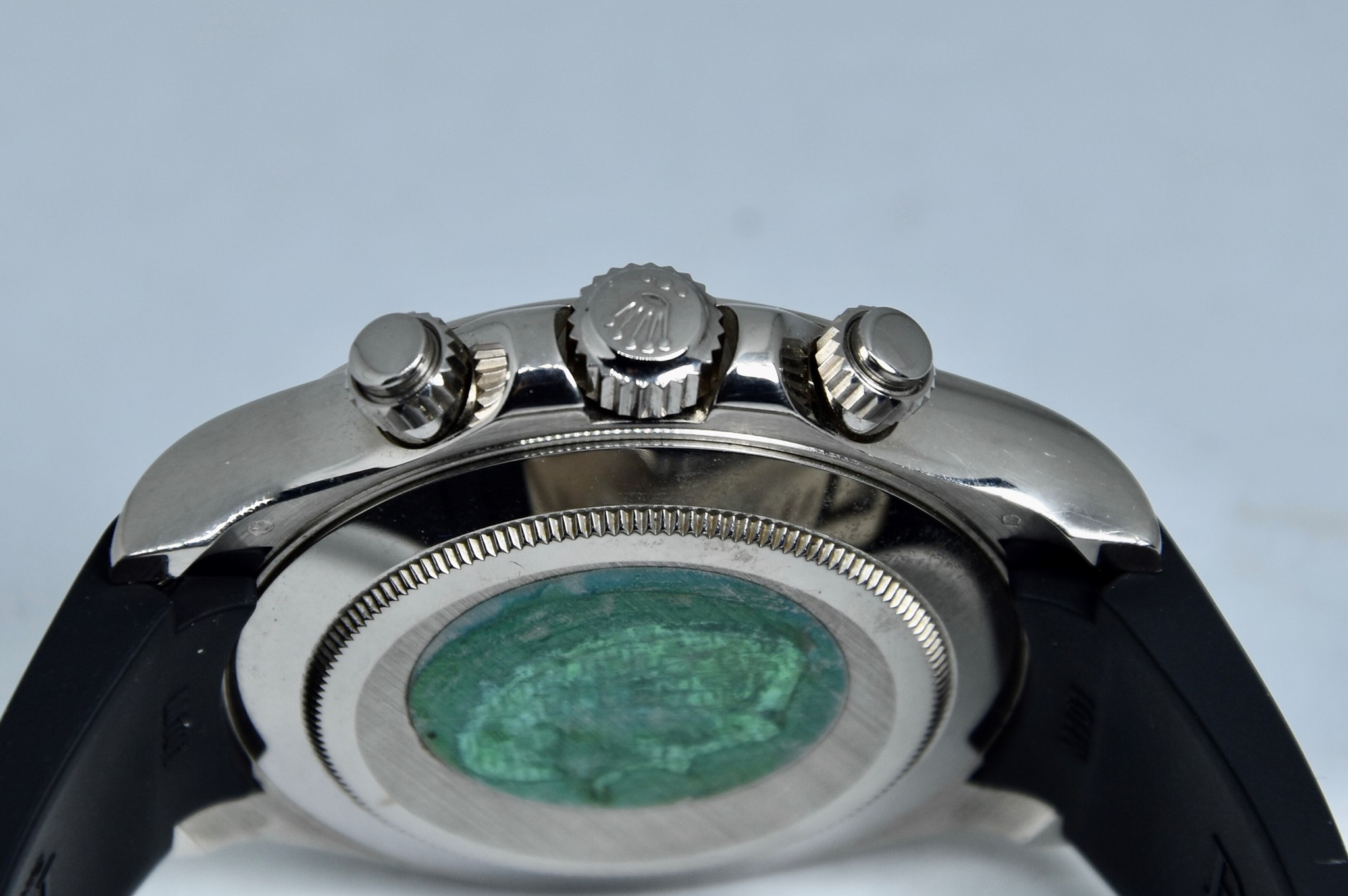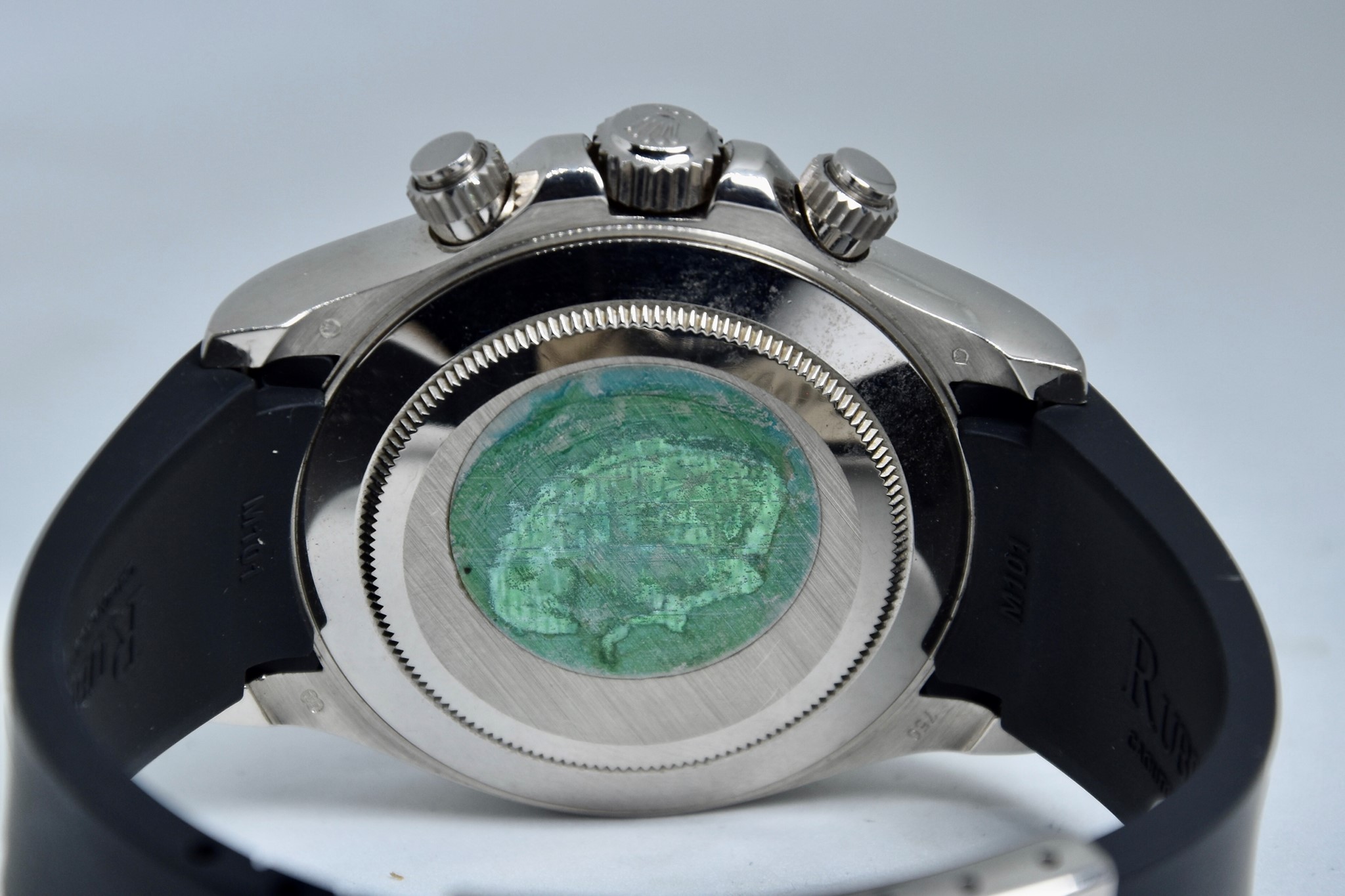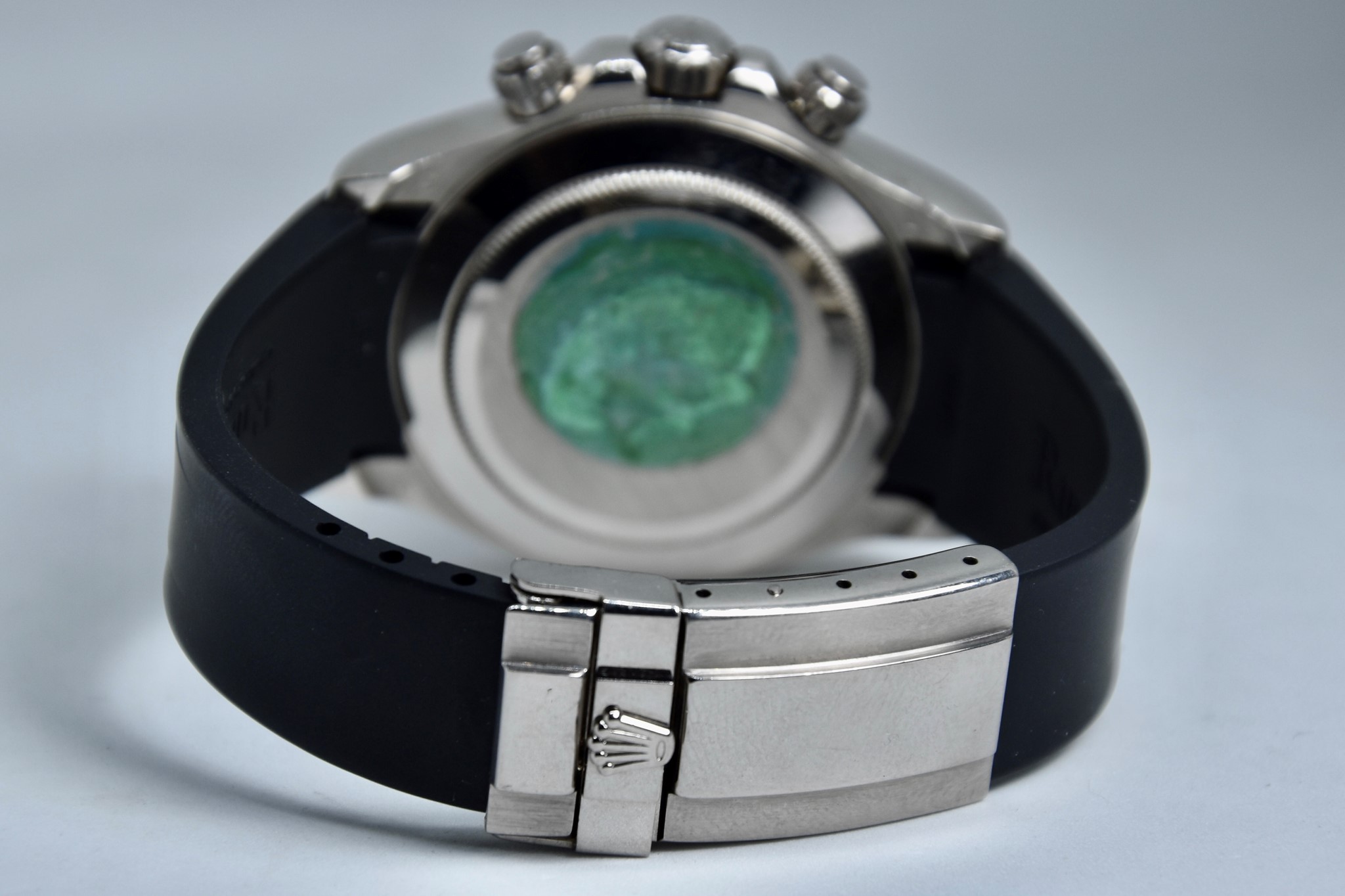 Rolex Daytona Meteorite ref. 116519 del 2004. Orologio in oro bianco in ottime condizioni. Orologio raro e per veri intenditori. Quadrante spettacolare in vero meteorite. Numeri romani in oro bianco. Movimento a carica automatica. Diametro cassa 40mm. Vetro zaffiro. Deployante originle in oro bianco. Viene venduto con cinturino in gomma rubber B e cinturino originale Rolex in coccodrillo rosso (lunghezza da donna). Orologio mai lucidato. Con scatola e garanzia originale.