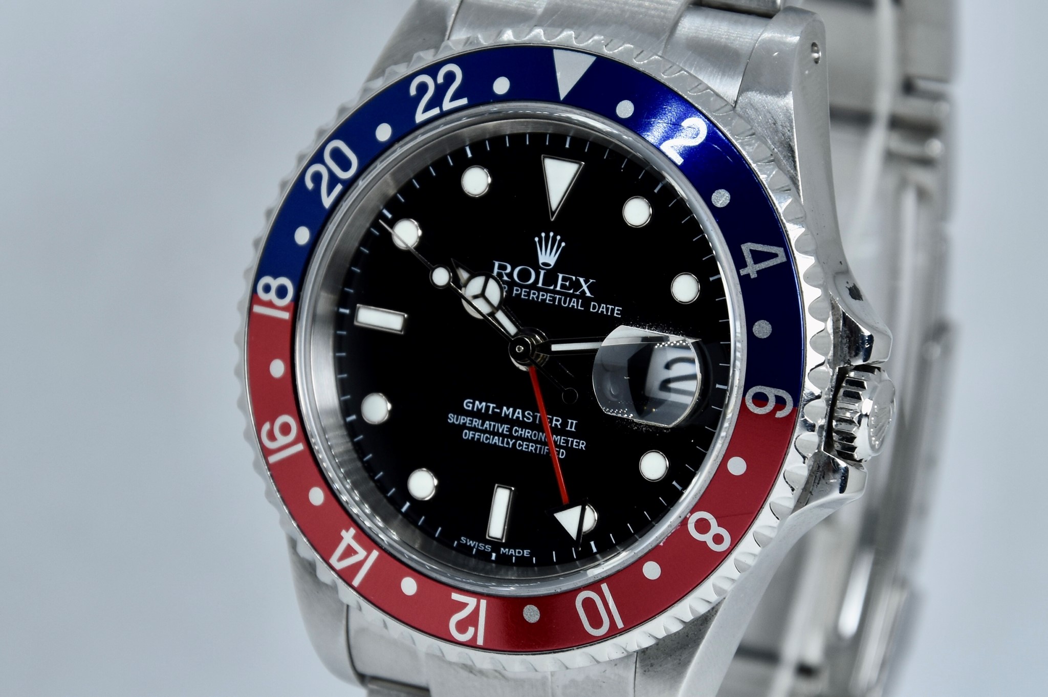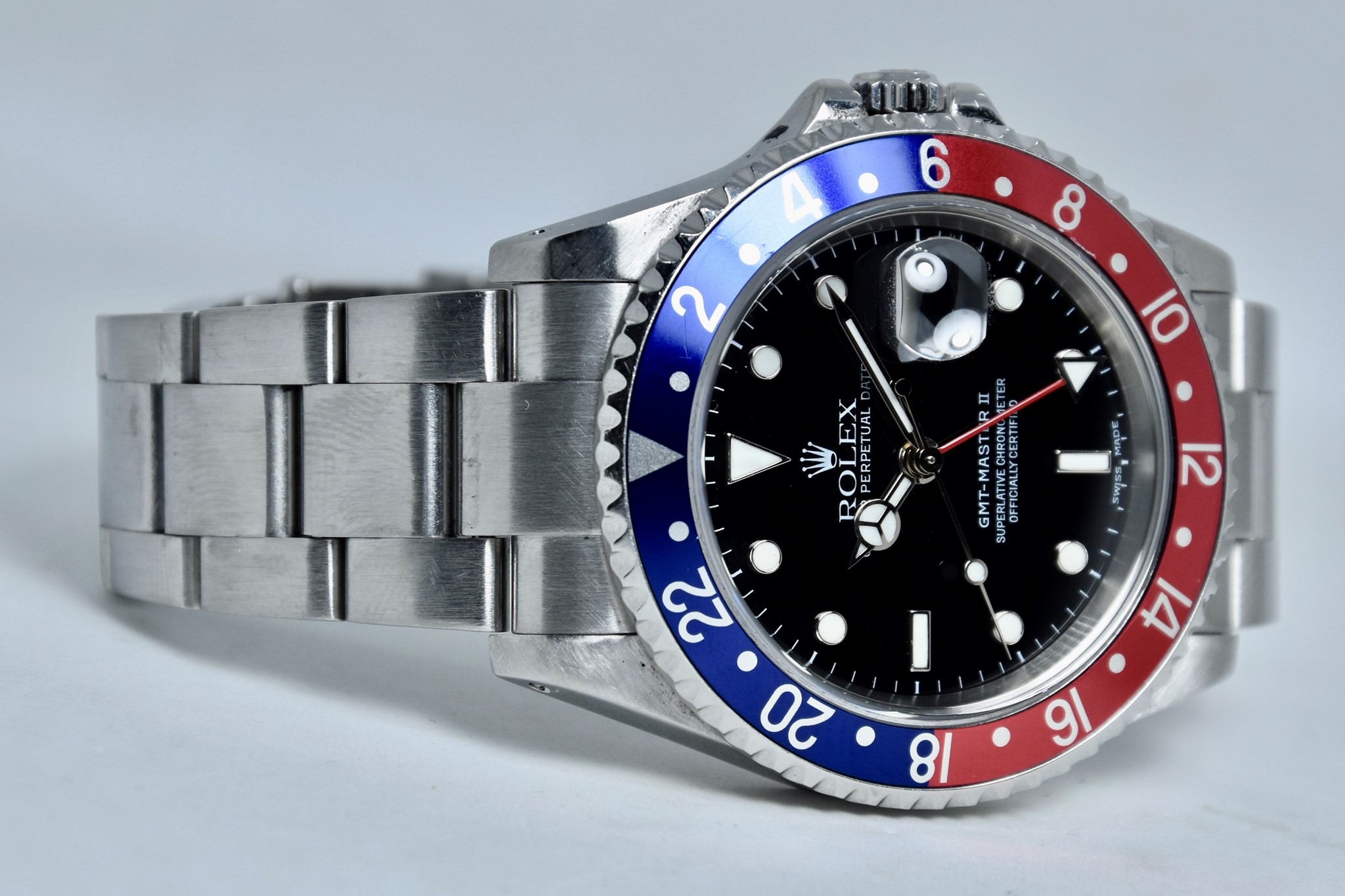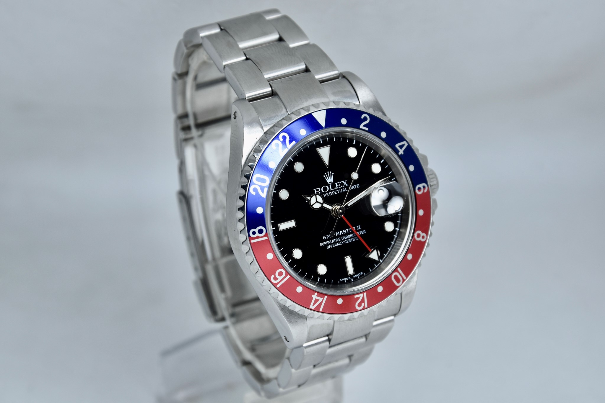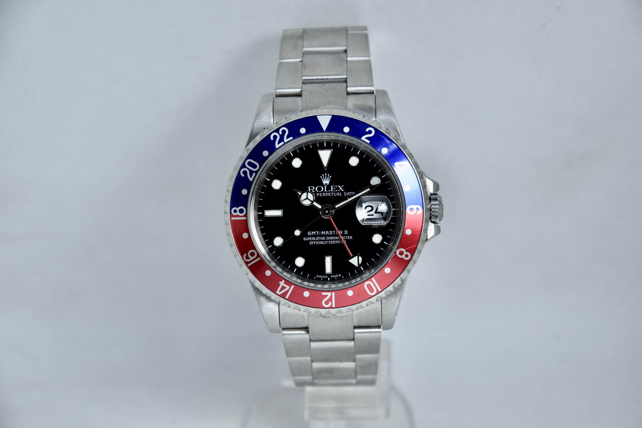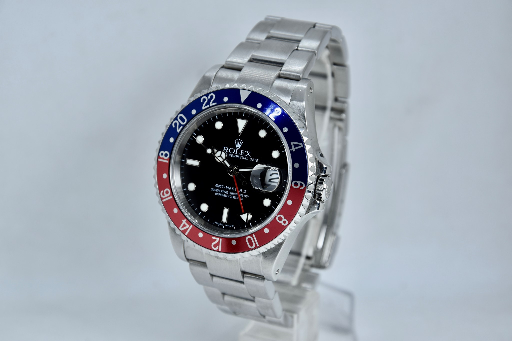 Rolex GMT Master II ref. 16710 del 2003 in buone condizioni. Orologio in acciaio con bracciale originale oyster. Quadrante color nero. Movimento a carica automatica. Diametro cassa 40mm. Vetro zaffiro. Lunetta in alluminio Pepsi. Indicatore del datario. Coevo in ogni suo particolare. Con scatola originale.