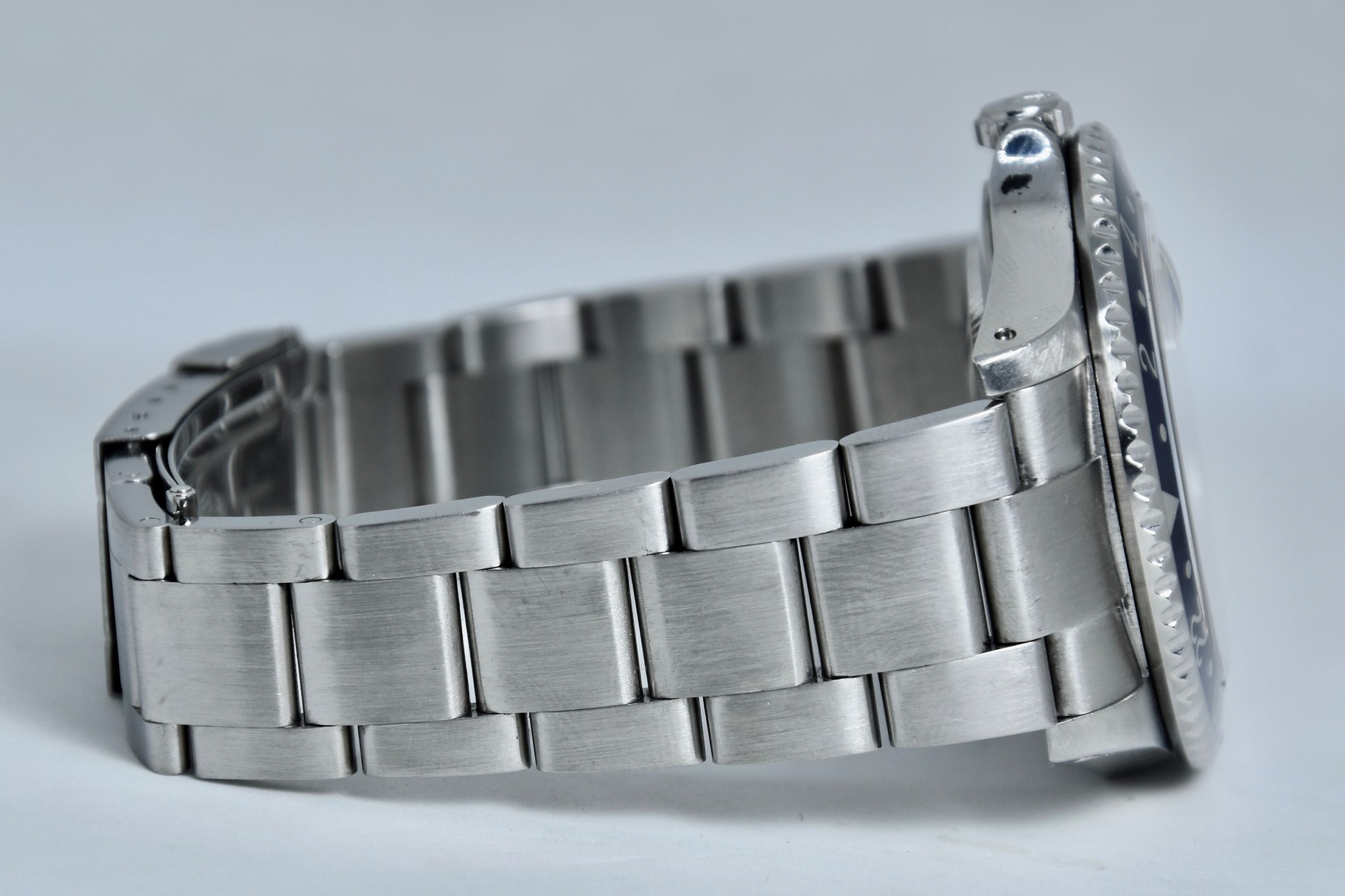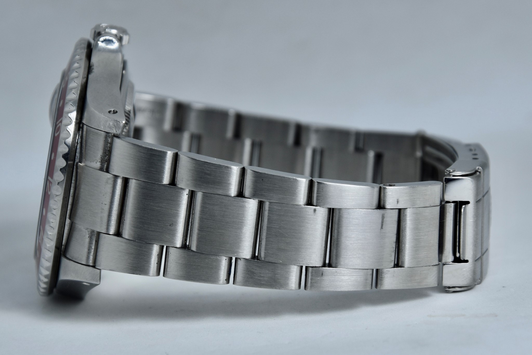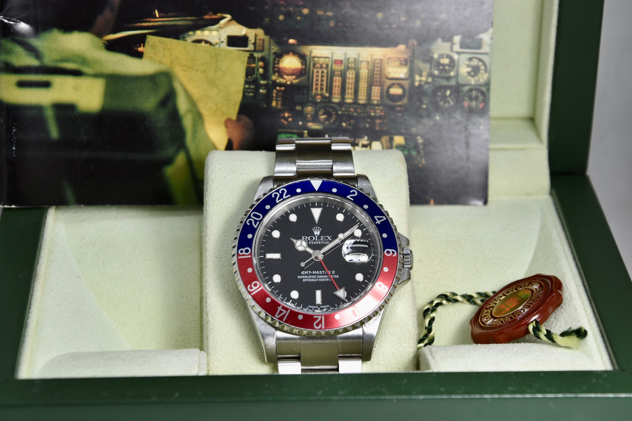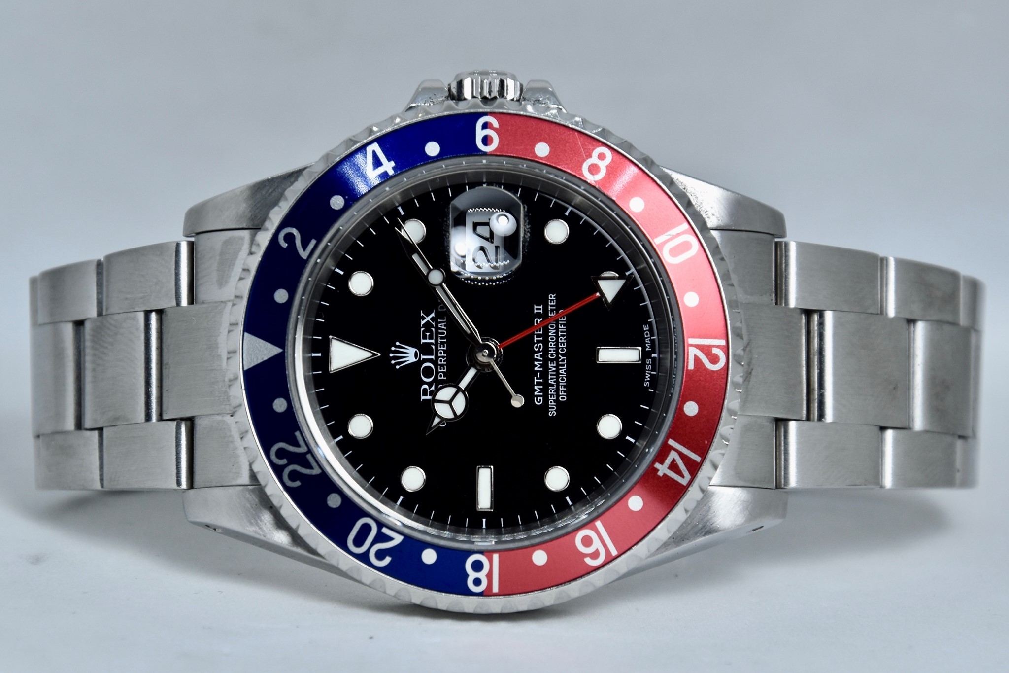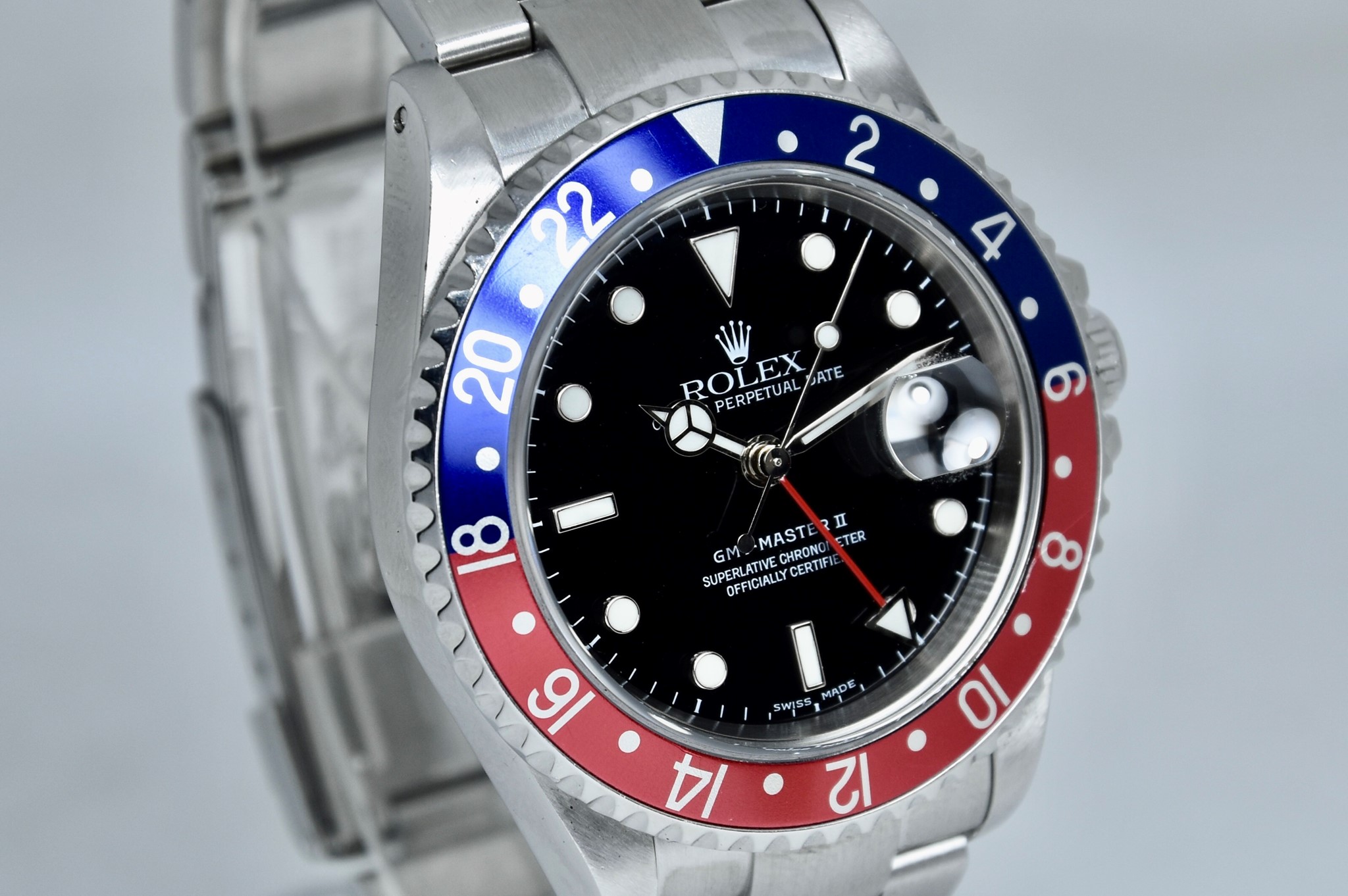 Rolex GMT Master II ref. 16710 del 2003 in buone condizioni. Orologio in acciaio con bracciale originale oyster. Quadrante color nero. Movimento a carica automatica. Diametro cassa 40mm. Vetro zaffiro. Lunetta in alluminio Pepsi. Indicatore del datario. Coevo in ogni suo particolare. Con scatola originale.