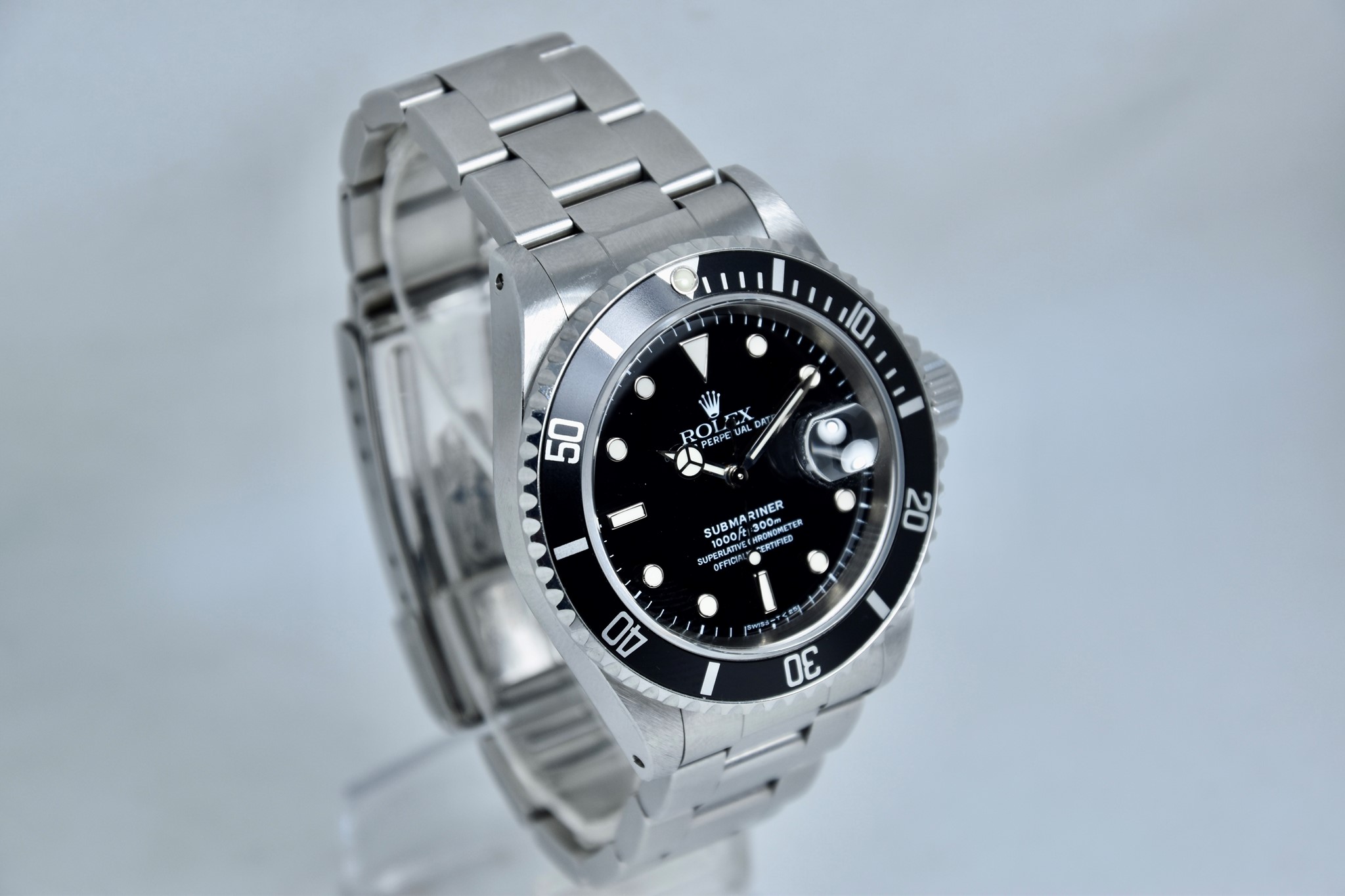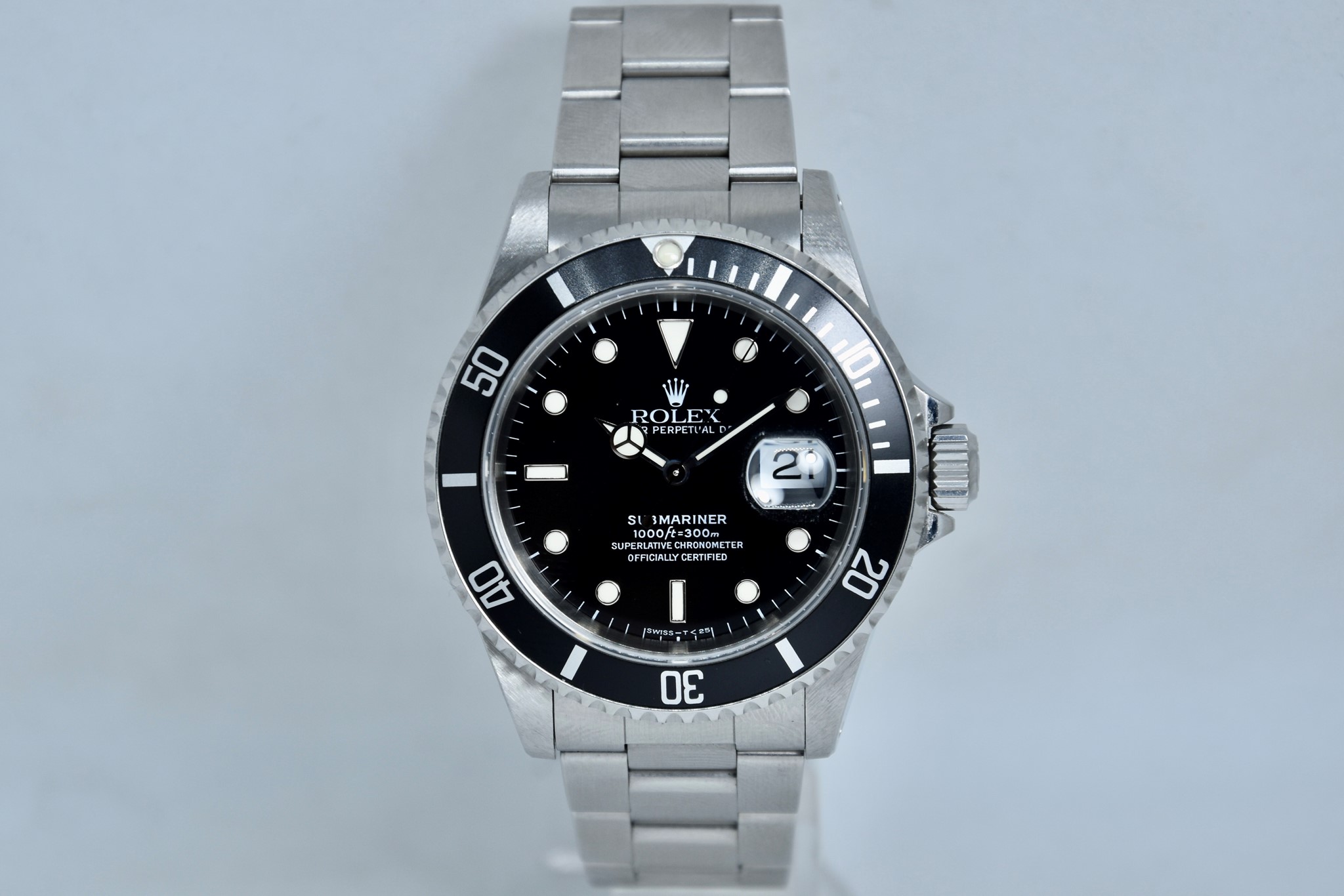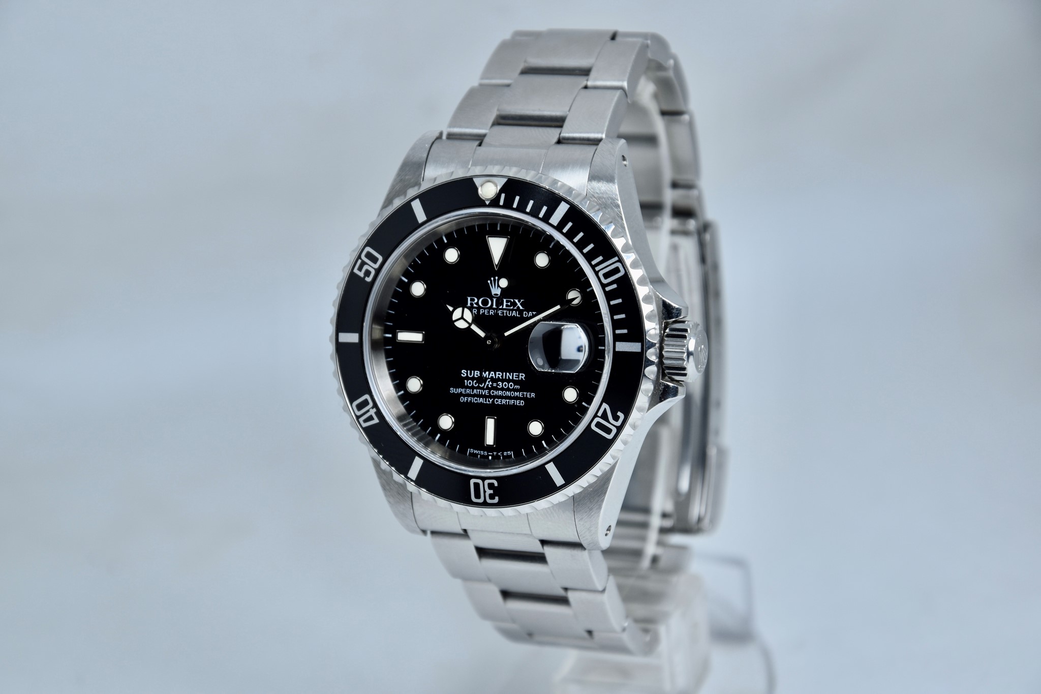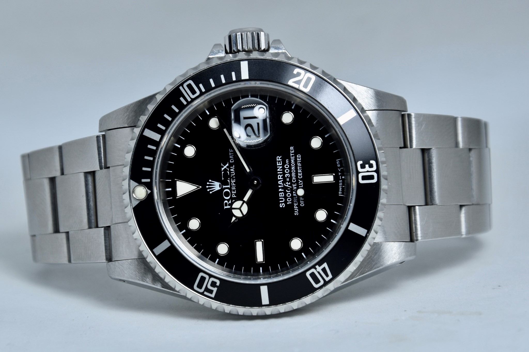 Rolex Submariner Date ref. 16610 del 1997 in ottime condizioni. Orologio in acciaio con bracciale originale oyster. Quadrante color nero con indici e sfere al trizio. Indici e sfere con una splendida colorazione panna. Movimento a carica automatica. Bracciale tesissimo. Orologio mai lucidato. Diametro cassa 40mm. Vetro zaffiro. Indicatore del datario. Con scatola originale.