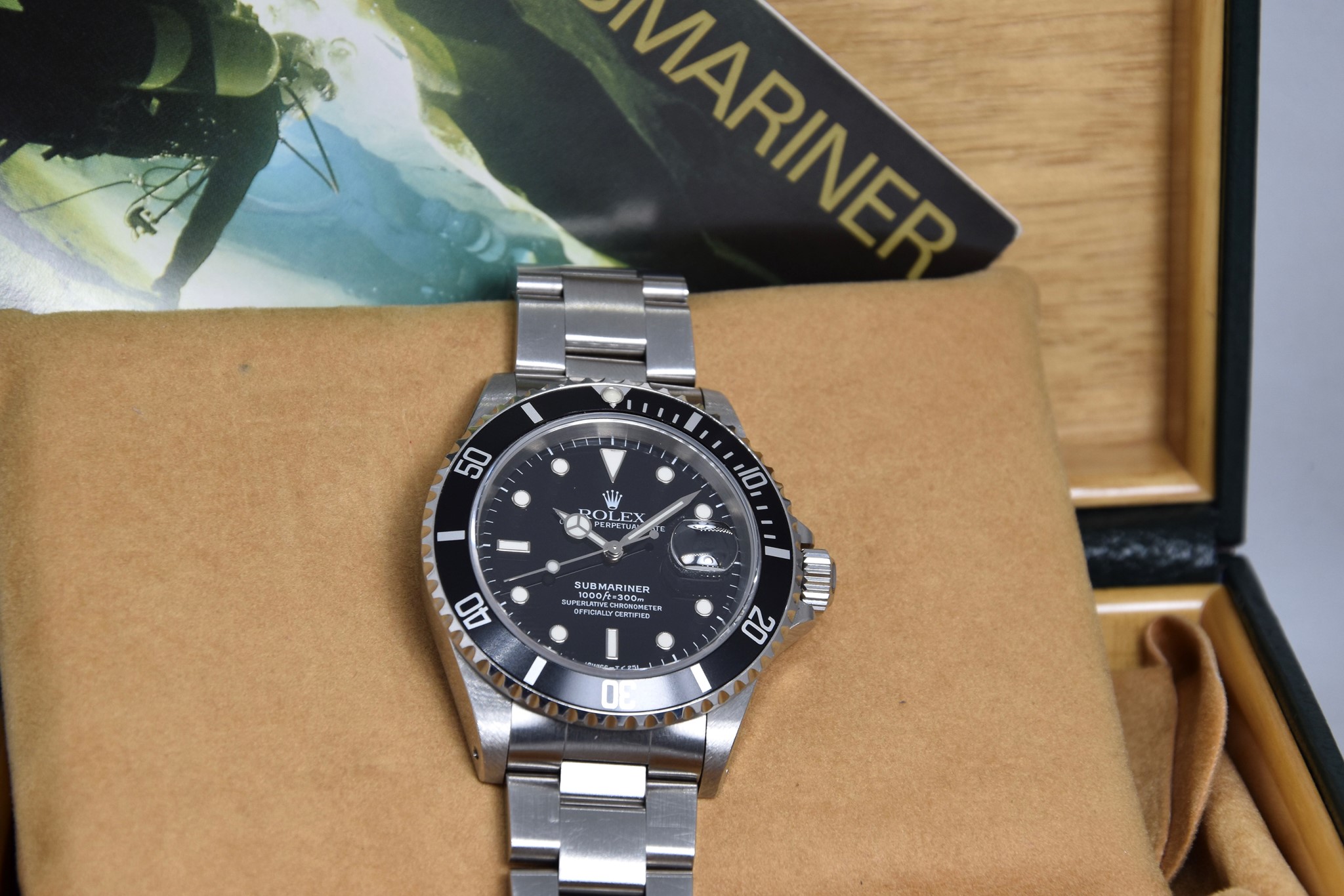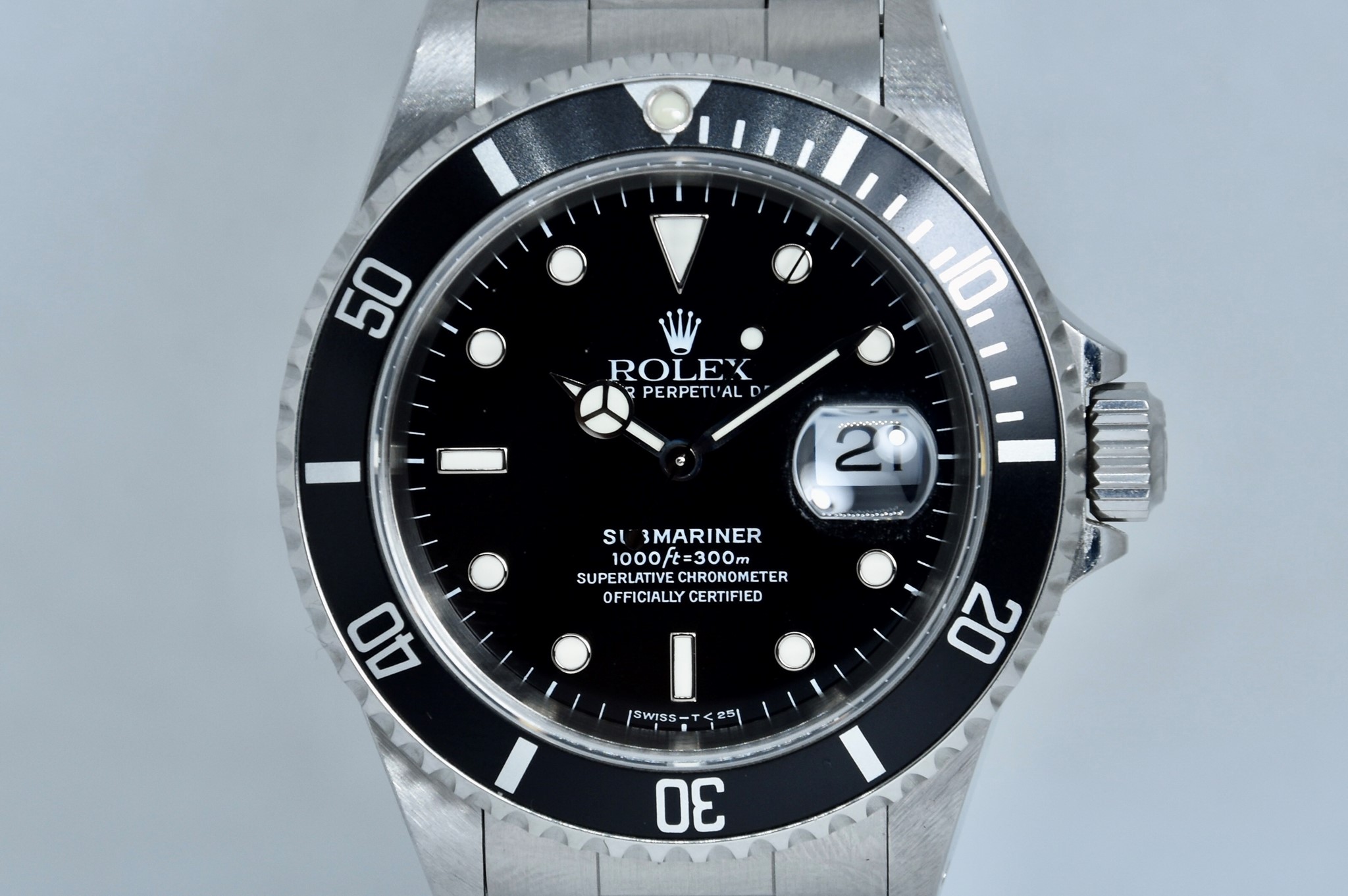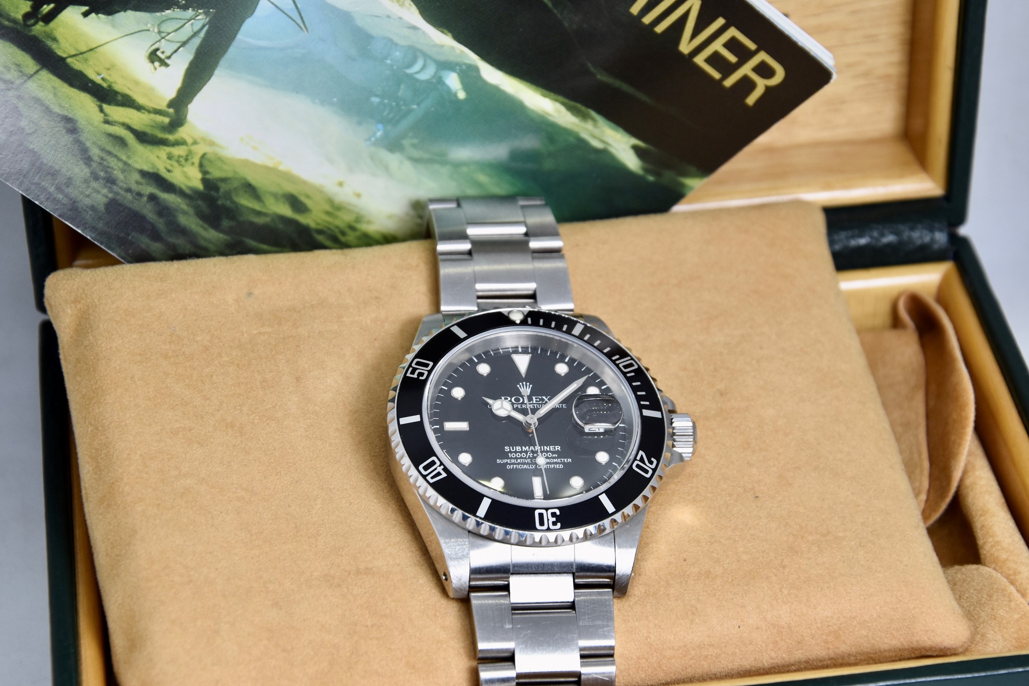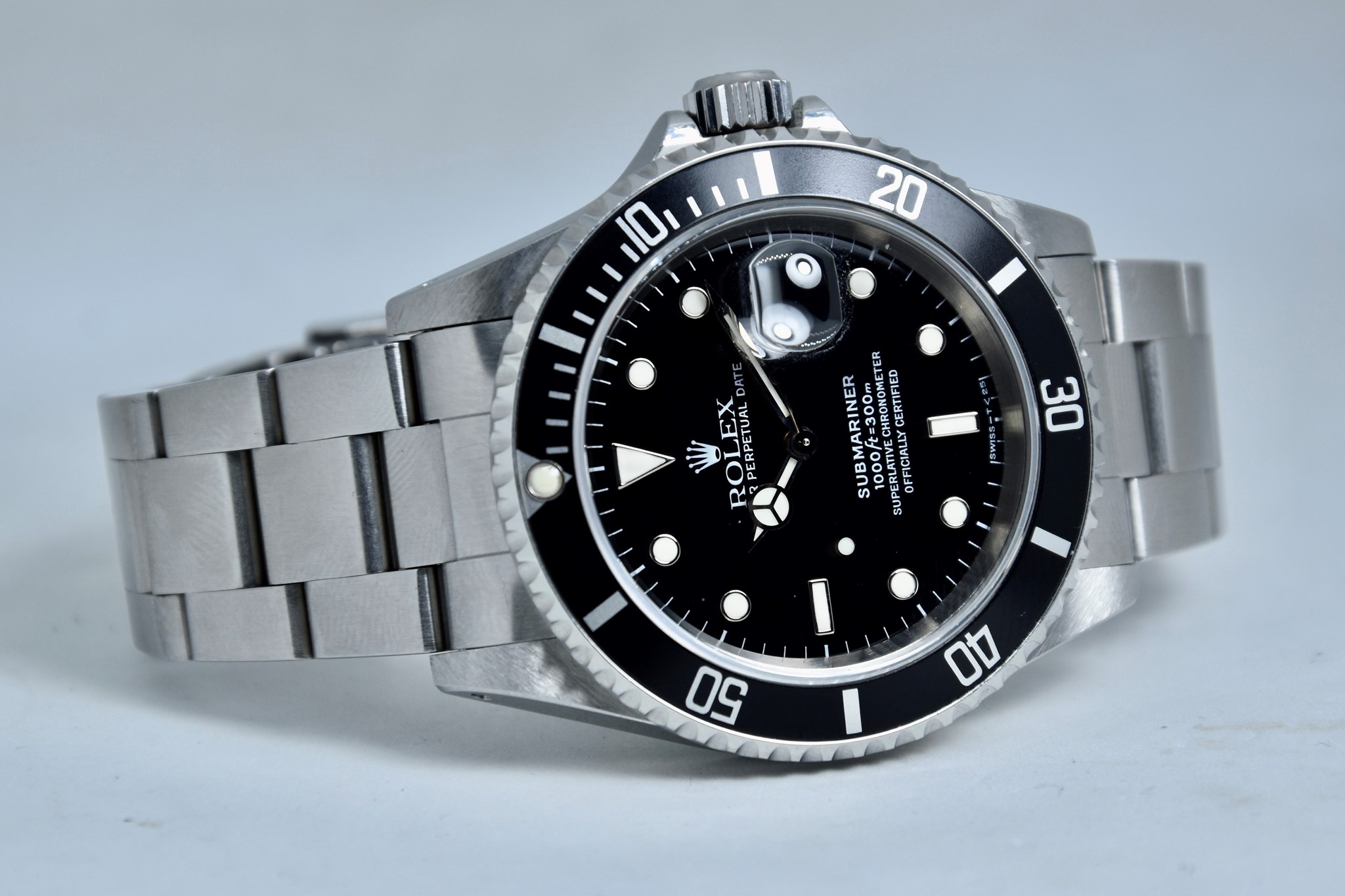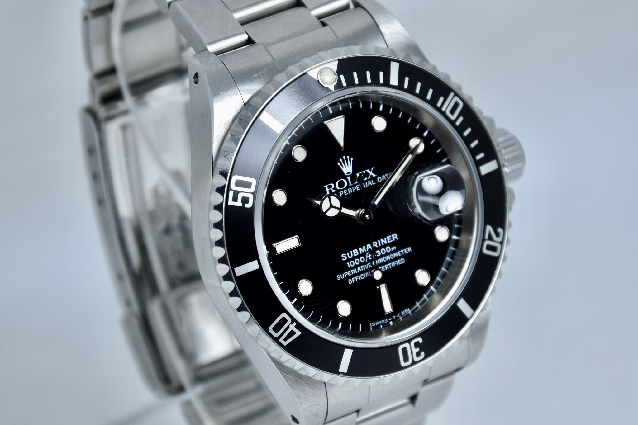Rolex Submariner Date ref. 16610 del 1997 in ottime condizioni. Orologio in acciaio con bracciale originale oyster. Quadrante color nero con indici e sfere al trizio. Indici e sfere con una splendida colorazione panna. Movimento a carica automatica. Bracciale tesissimo. Orologio mai lucidato. Diametro cassa 40mm. Vetro zaffiro. Indicatore del datario. Con scatola originale.