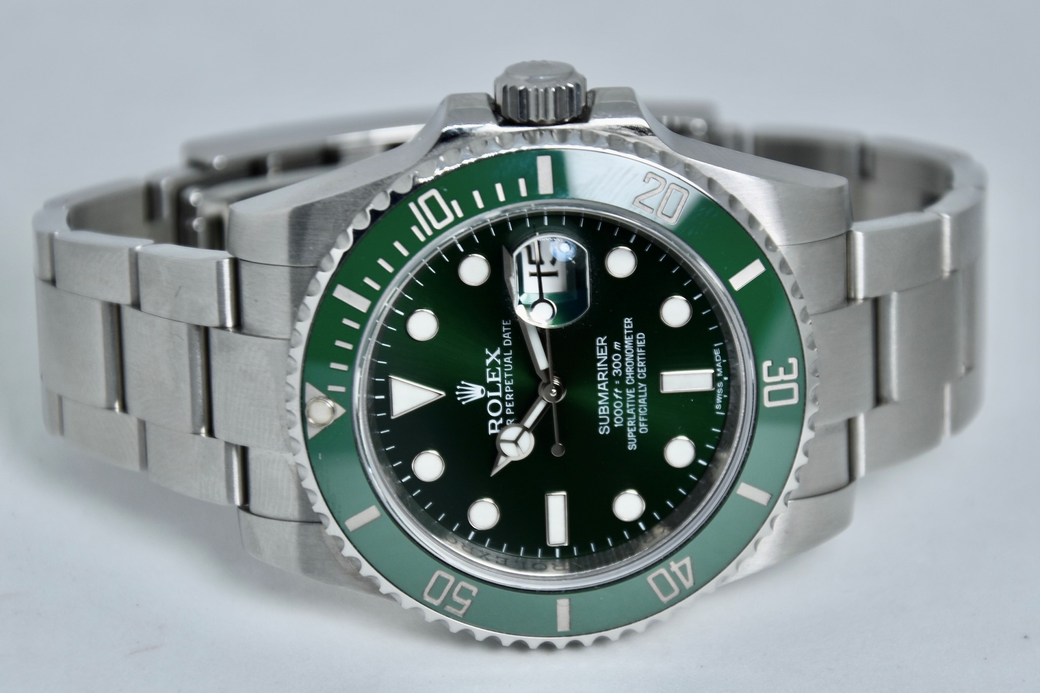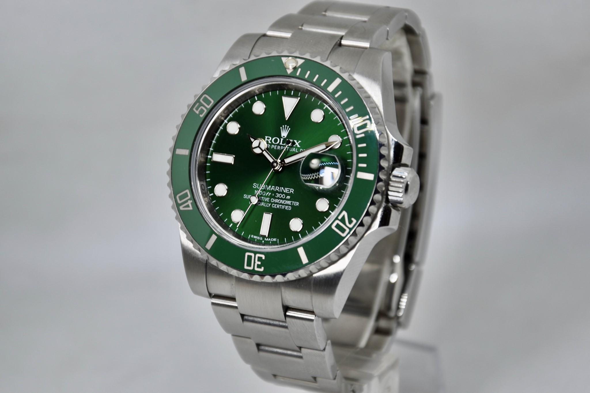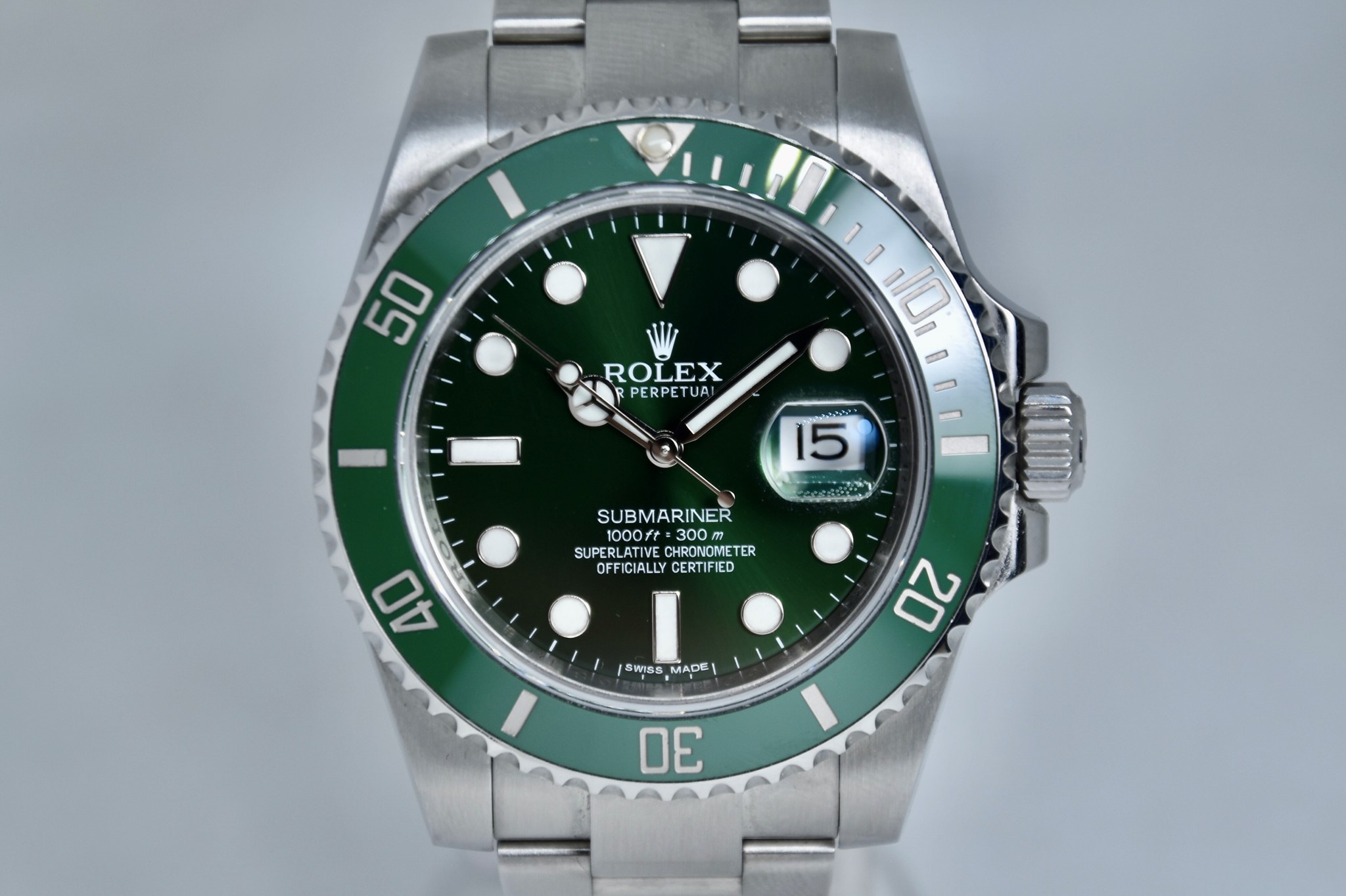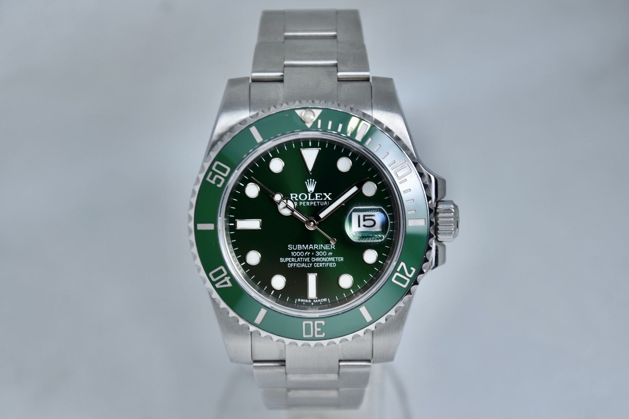 Rolex Submariner Date ref. 116610LV “HULK” del 2014. Orologio in acciaio con inserto girevole in ceramica. Quadrante color Verde. Movimento a carica automatica. Diametro cassa 40mm. Indicatore del datario. Vetro zaffiro. Bracciale oyster originale in acciaio. Service ufficiale Rolex 11/2025. Con scatola e garanzia originali, garanzia internazionale sul funzionamento fino a Novembre 2027.