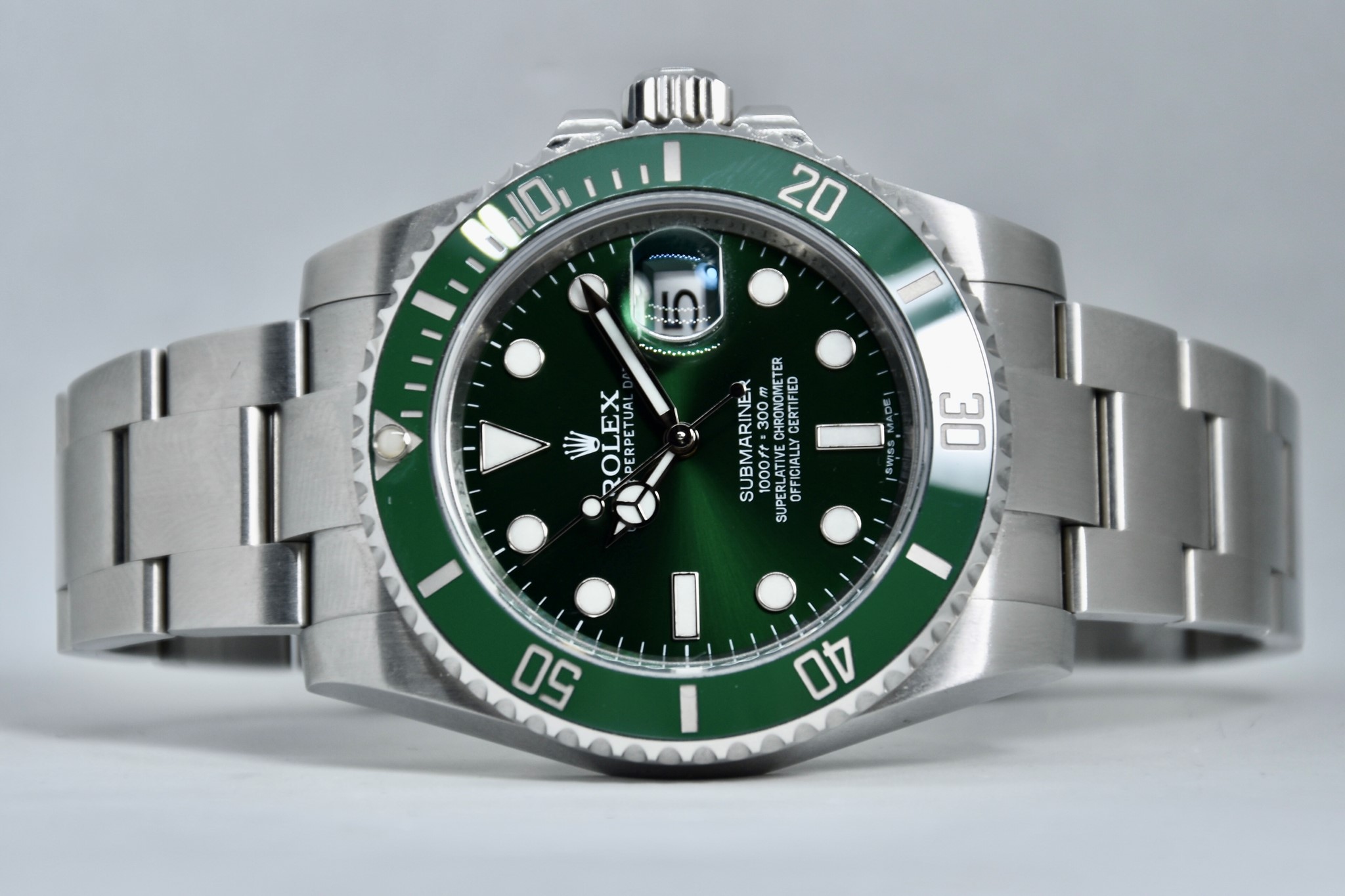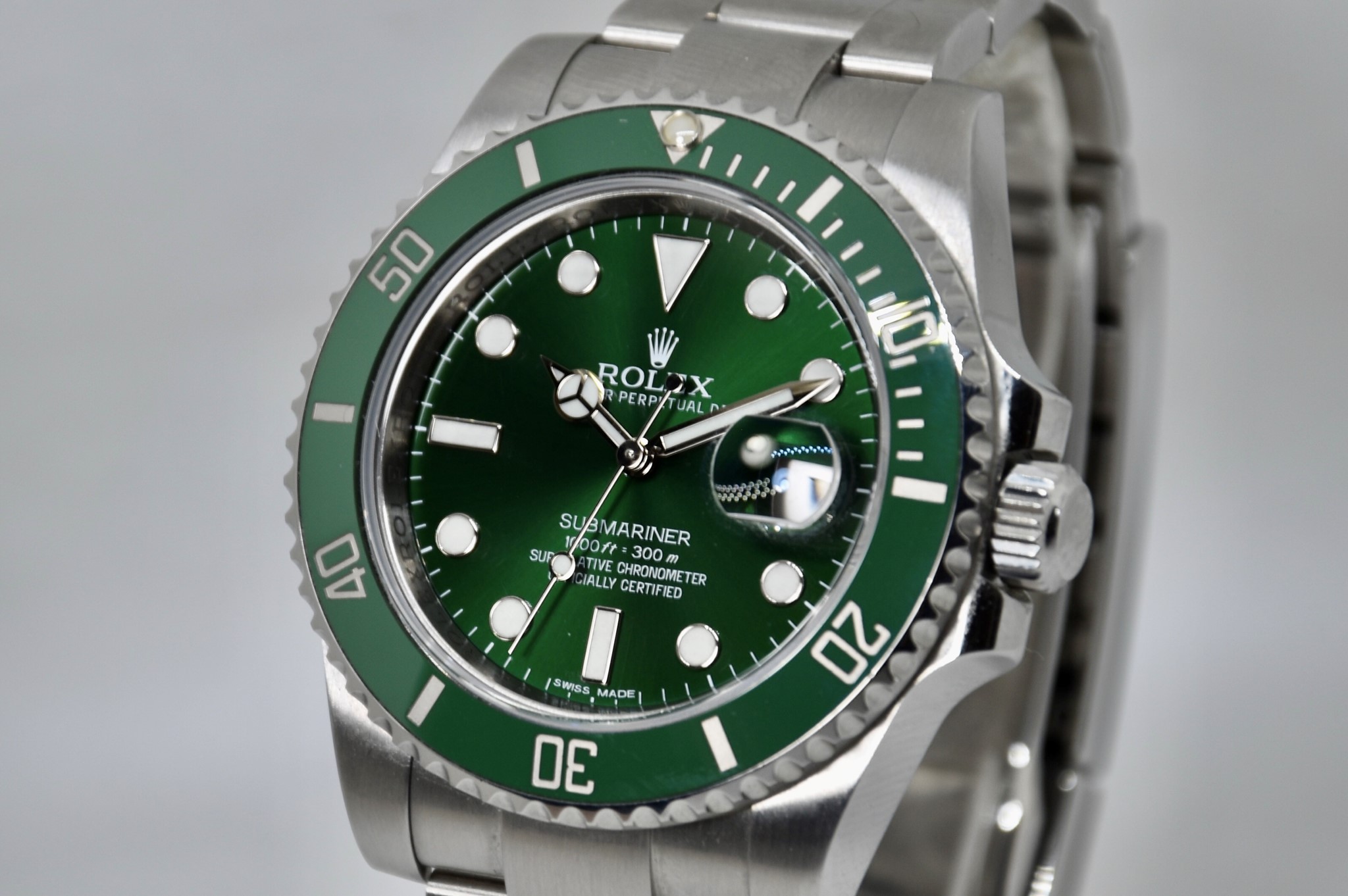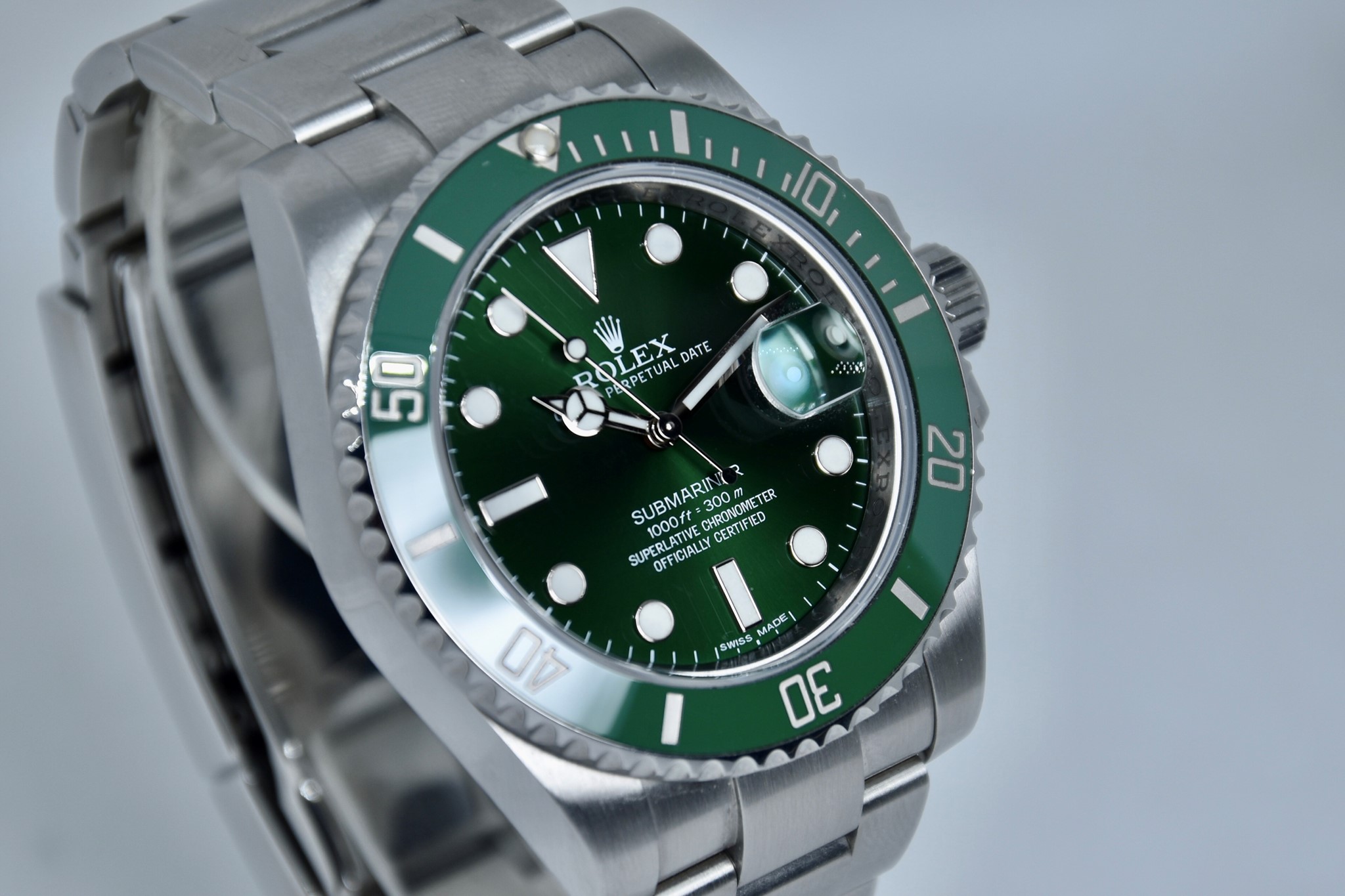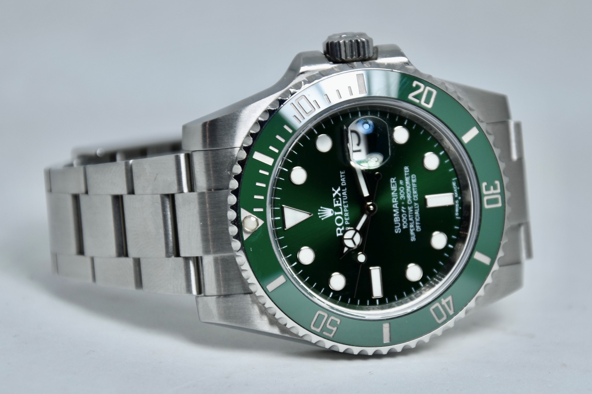 Rolex Submariner Date ref. 116610LV “HULK” del 2014. Orologio in acciaio con inserto girevole in ceramica. Quadrante color Verde. Movimento a carica automatica. Diametro cassa 40mm. Indicatore del datario. Vetro zaffiro. Bracciale oyster originale in acciaio. Service ufficiale Rolex 11/2025. Con scatola e garanzia originali, garanzia internazionale sul funzionamento fino a Novembre 2027.