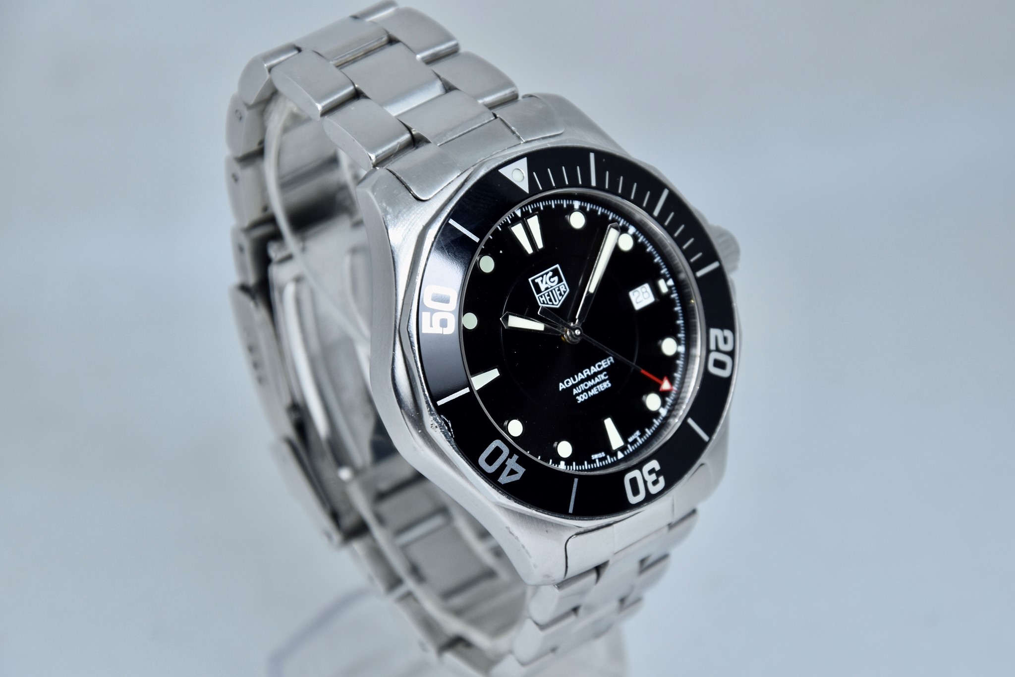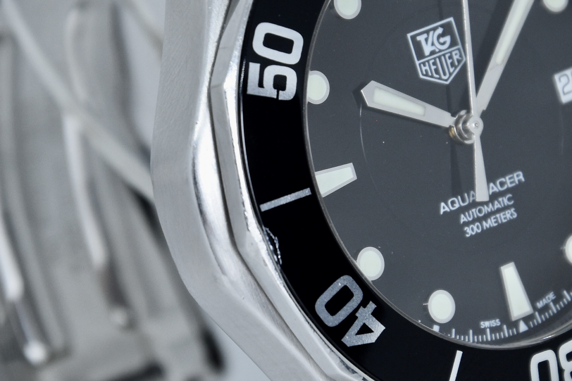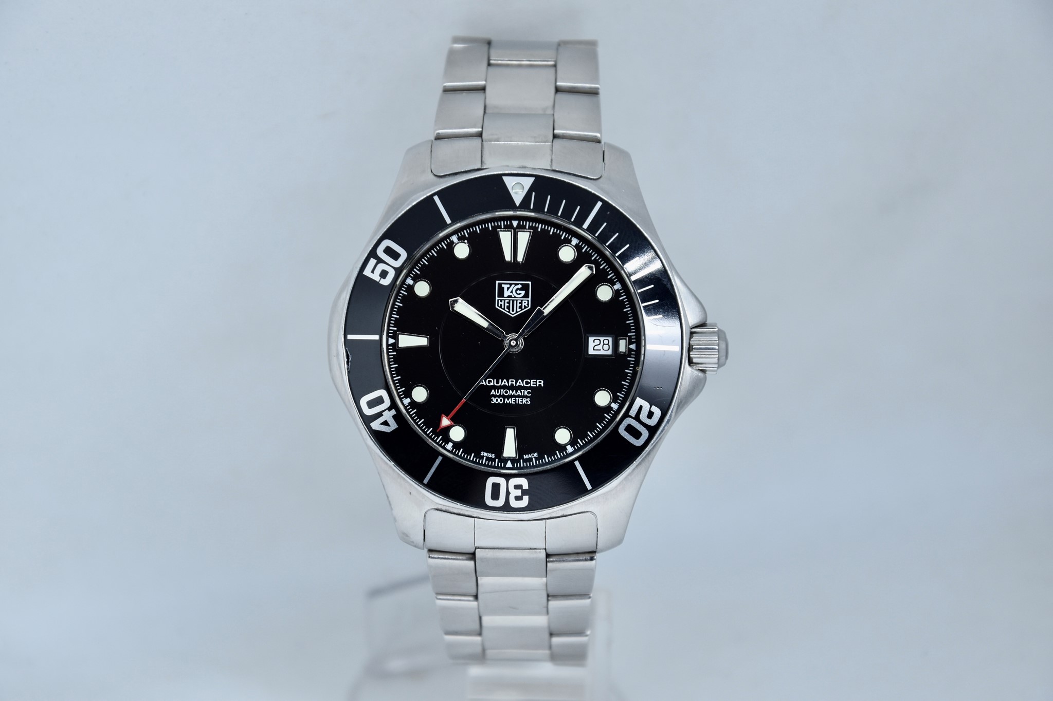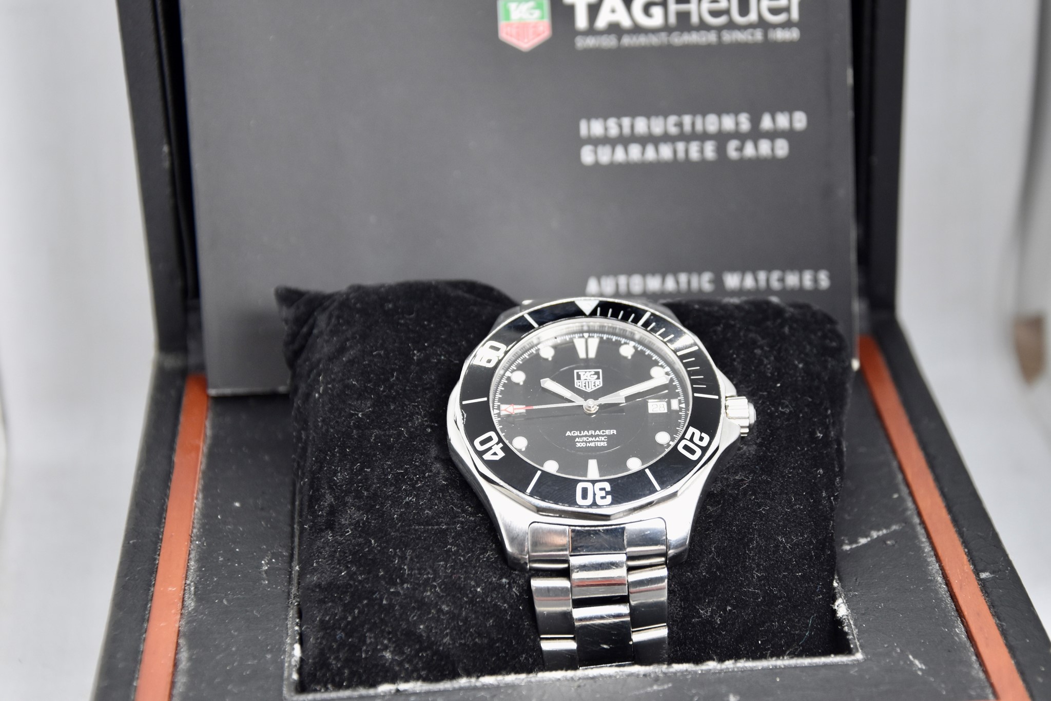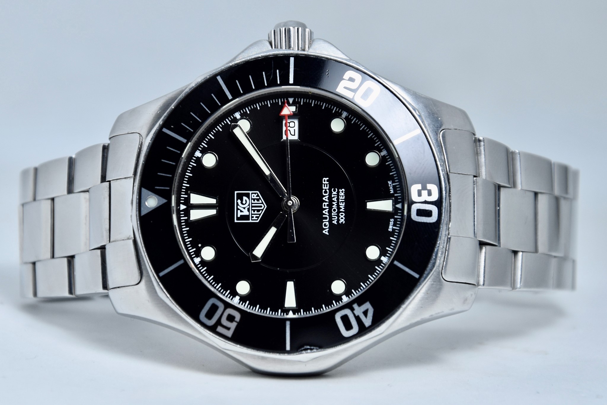 TAG Heuer Aquaracer ref. WAB2010 del 2011. Orologio in acciaio in buone condizioni. Quadrante lucido nero. Movimento a carica automatica. Diametro cassa 41mm. Vetro zaffiro. Indicatore del datario. Ghiera girevole unidirezionale. Colpo ad ore 9 sull'inserto ghiera. Corona a vite originale. Indici e lancette luminova con ottima lettura notturna. Con scatola e garanzia originali.