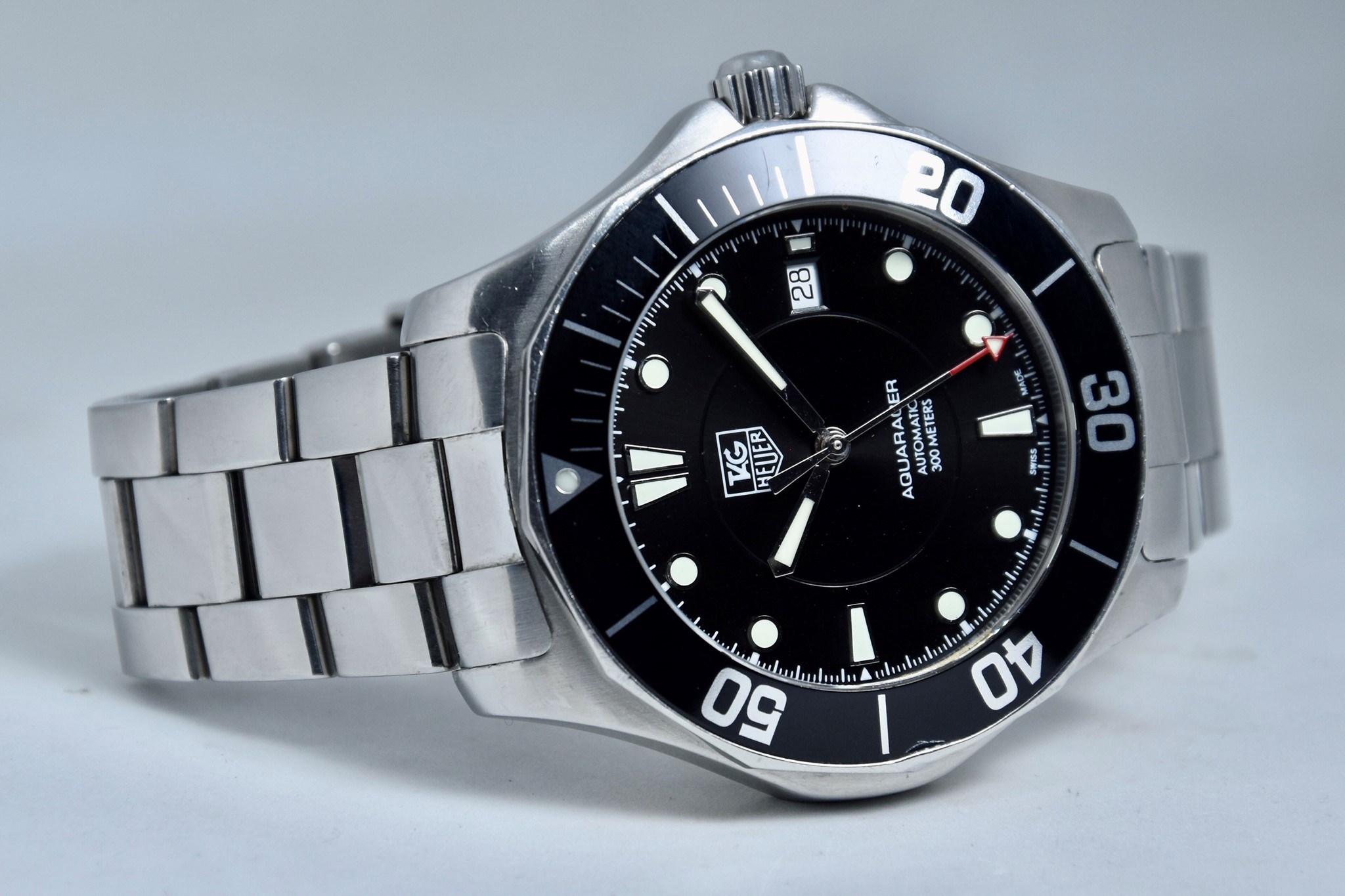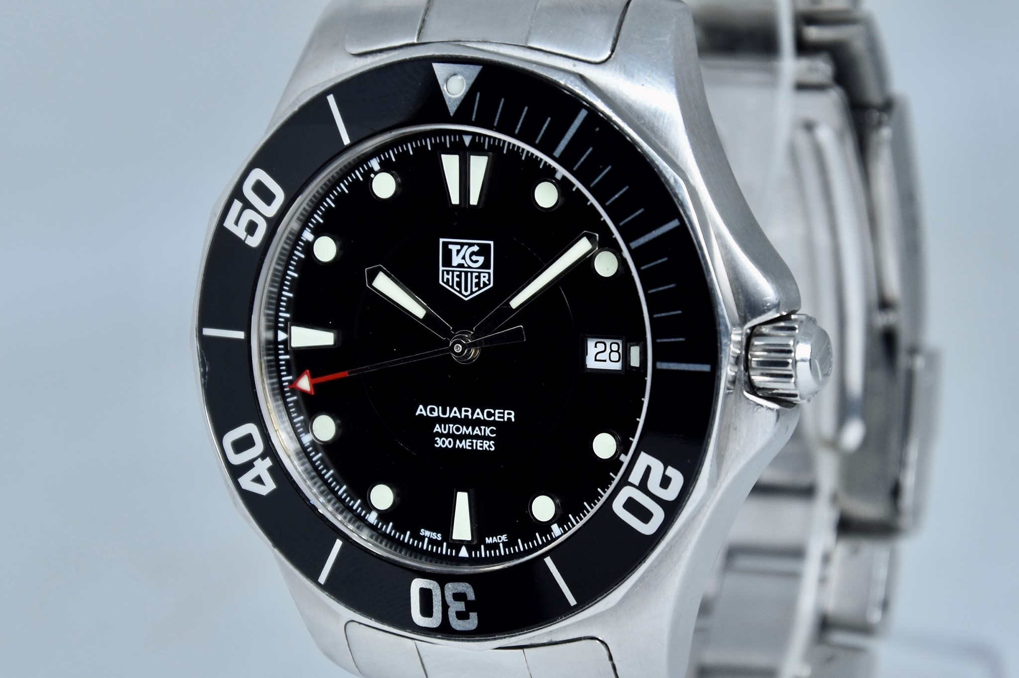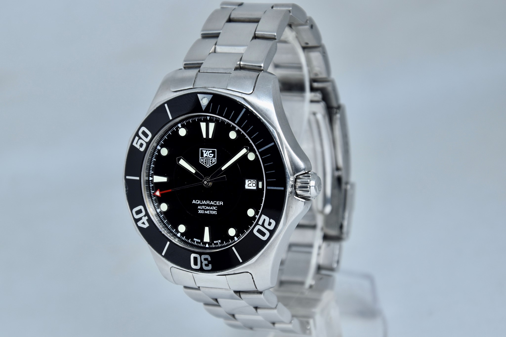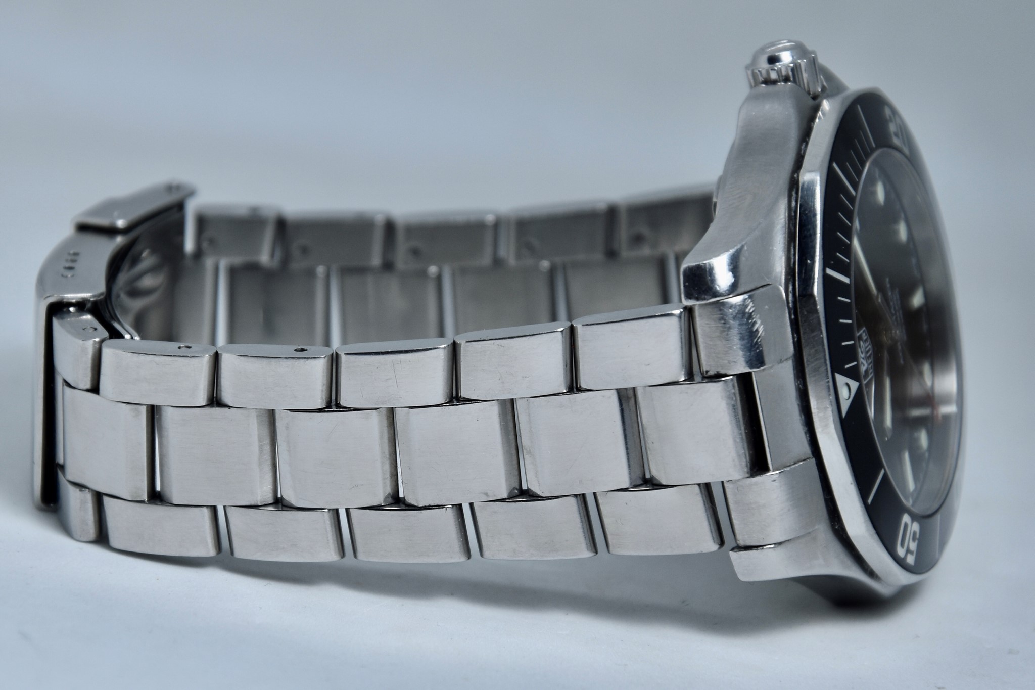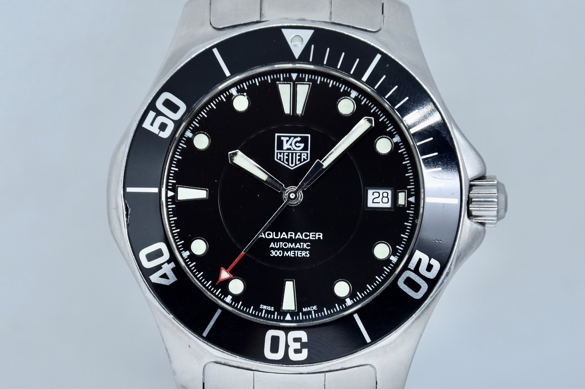 TAG Heuer Aquaracer ref. WAB2010 del 2011. Orologio in acciaio in buone condizioni. Quadrante lucido nero. Movimento a carica automatica. Diametro cassa 41mm. Vetro zaffiro. Indicatore del datario. Ghiera girevole unidirezionale. Colpo ad ore 9 sull'inserto ghiera. Corona a vite originale. Indici e lancette luminova con ottima lettura notturna. Con scatola e garanzia originali.