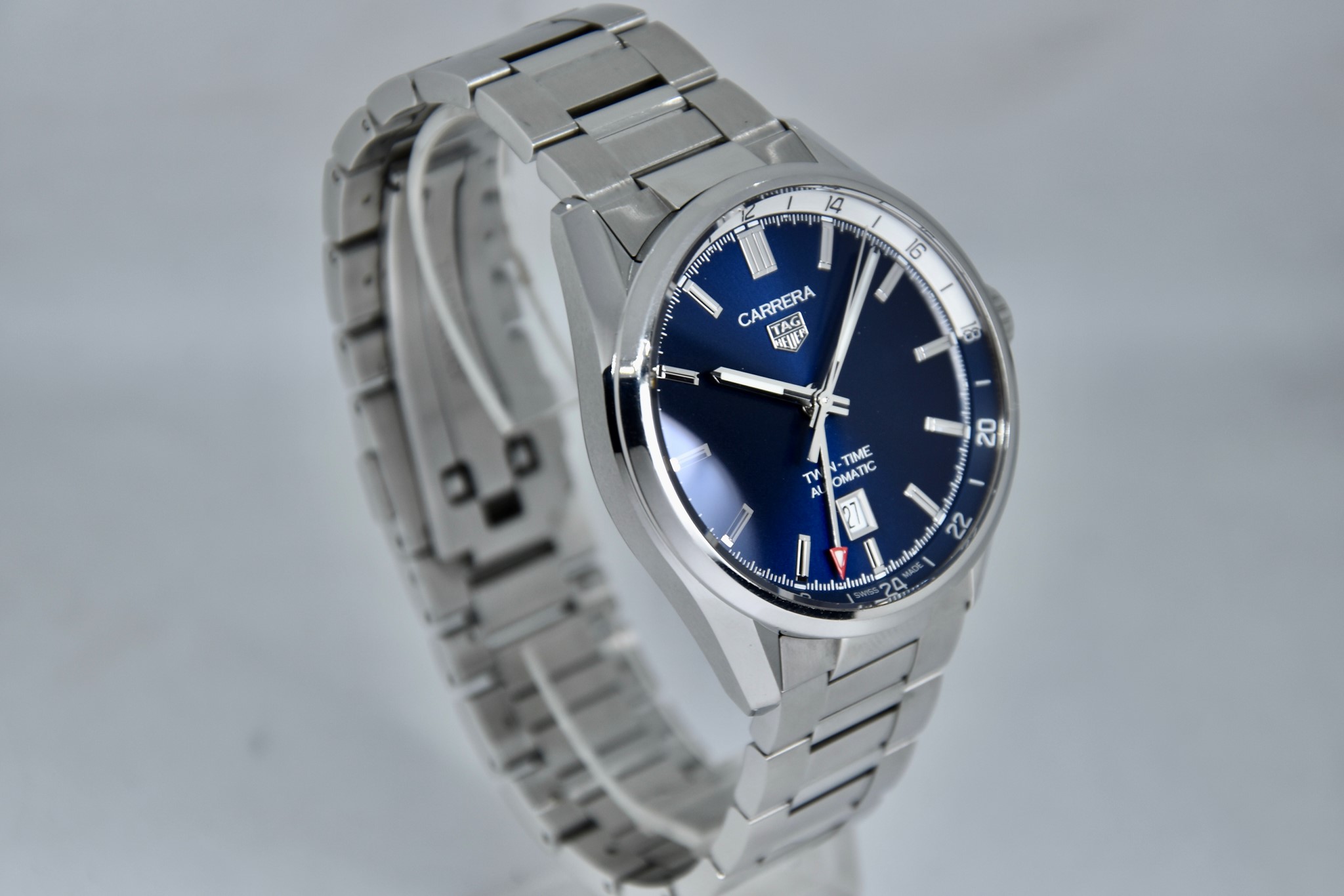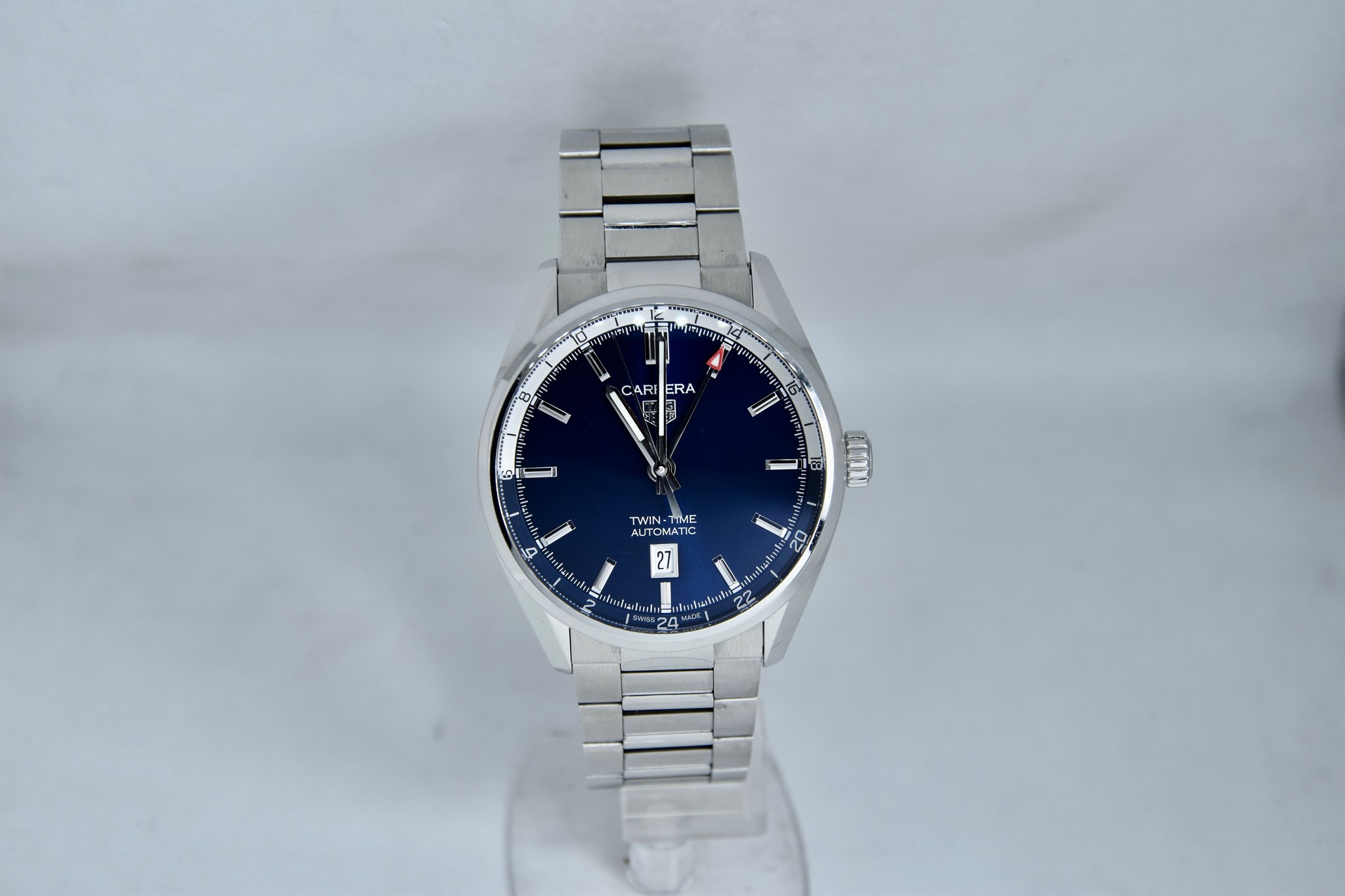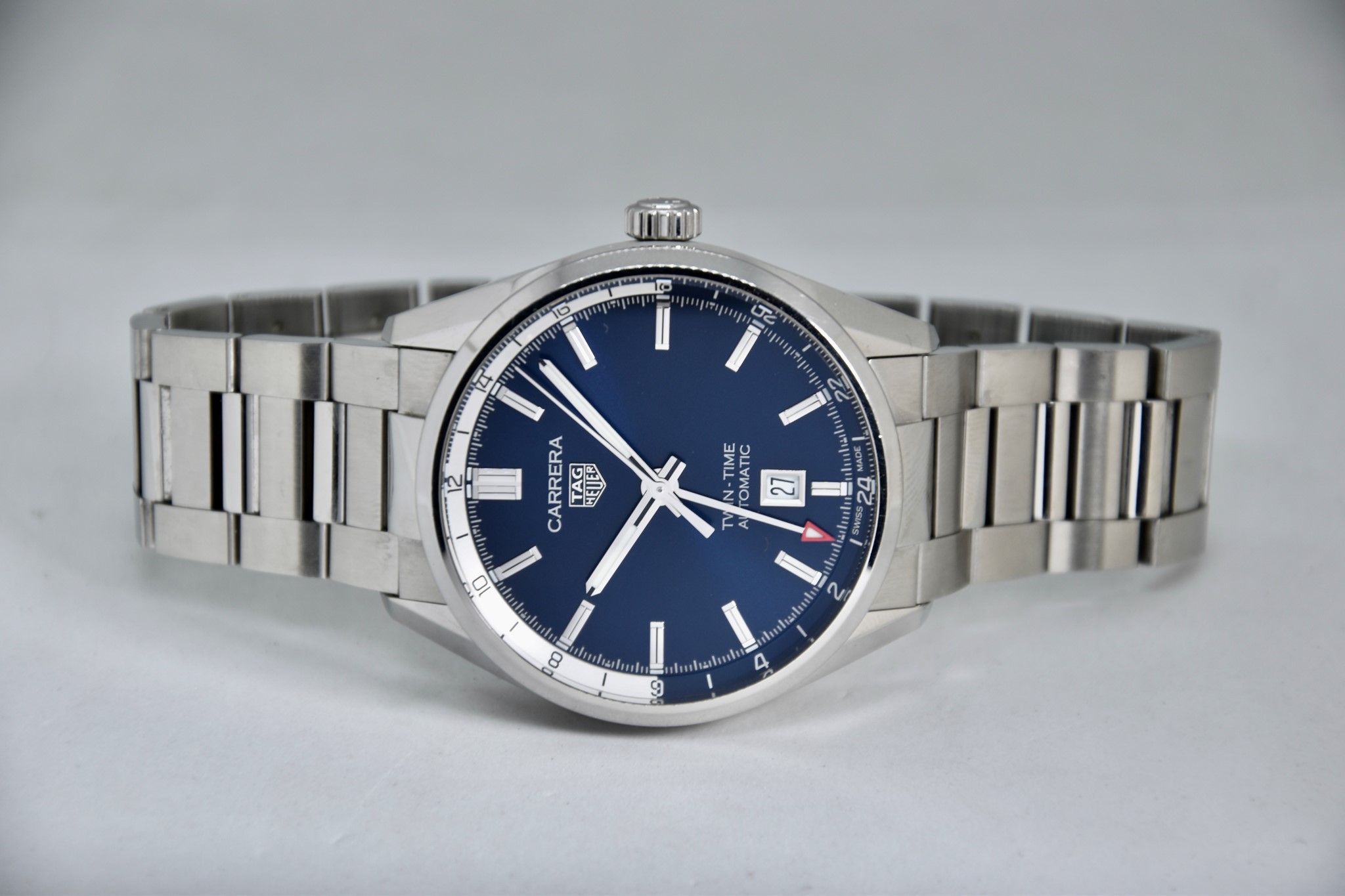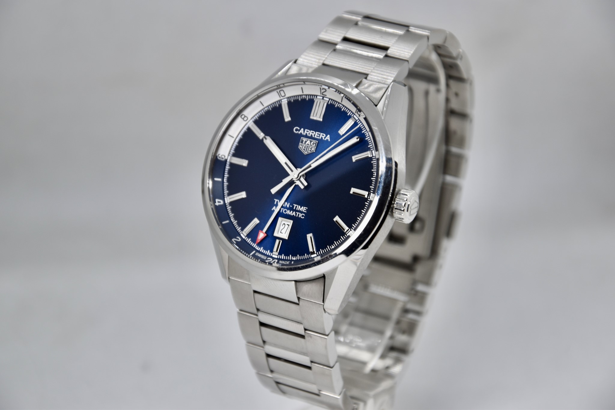TAG Heuer Carrera Twin-Time ref. WBN201A del 2024. Orologio in acciaio in buone condizioni. Quadrante lucido blu con Lunetta interna Bitono grigio-blu. Movimento a carica automatica. Diametro cassa 41mm. Vetro zaffiro. Indicatore del datario. Indicazione GMT. Corona a pressione originale. Indici e lancette luminova con ottima lettura notturna. Con scatola e garanzia originali.