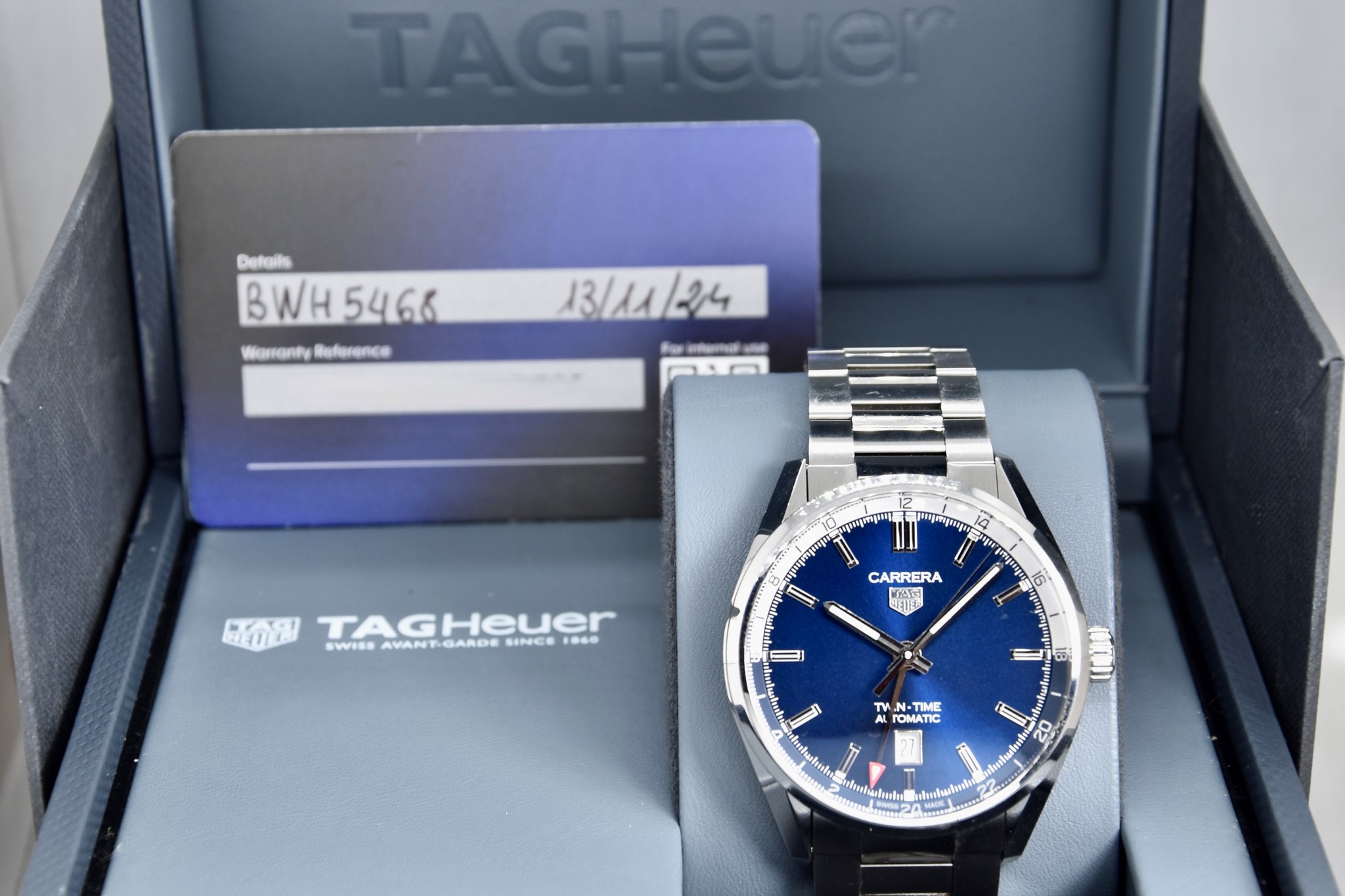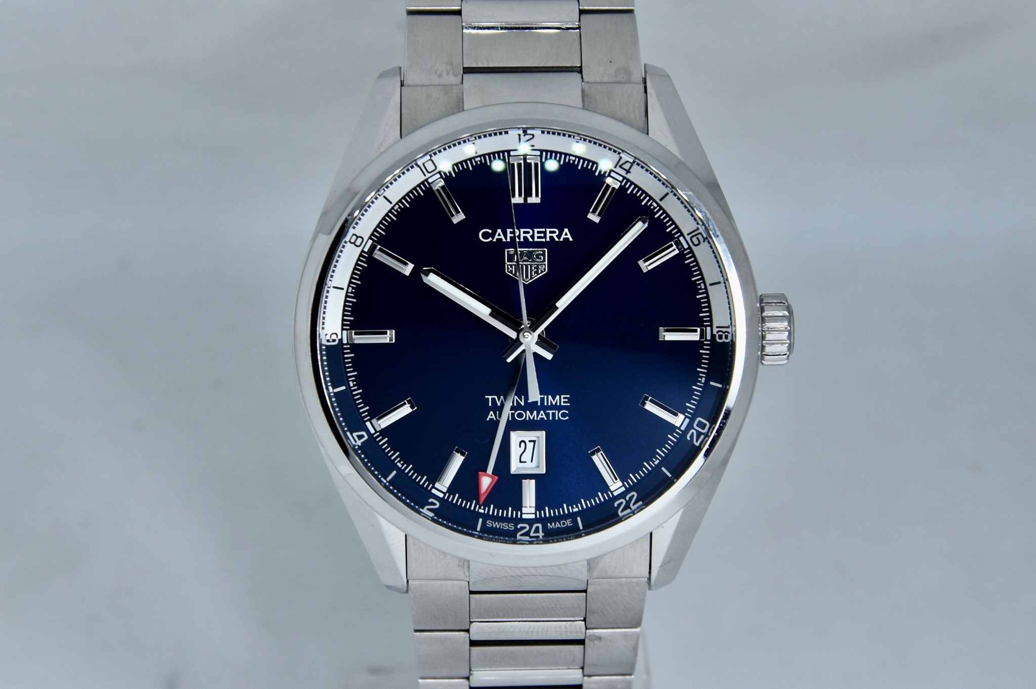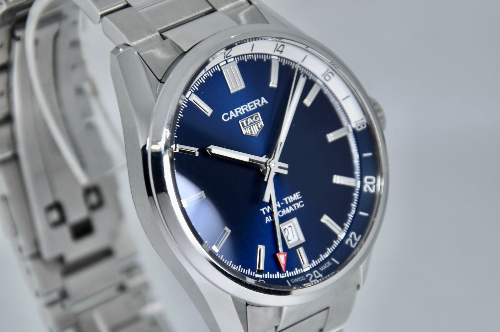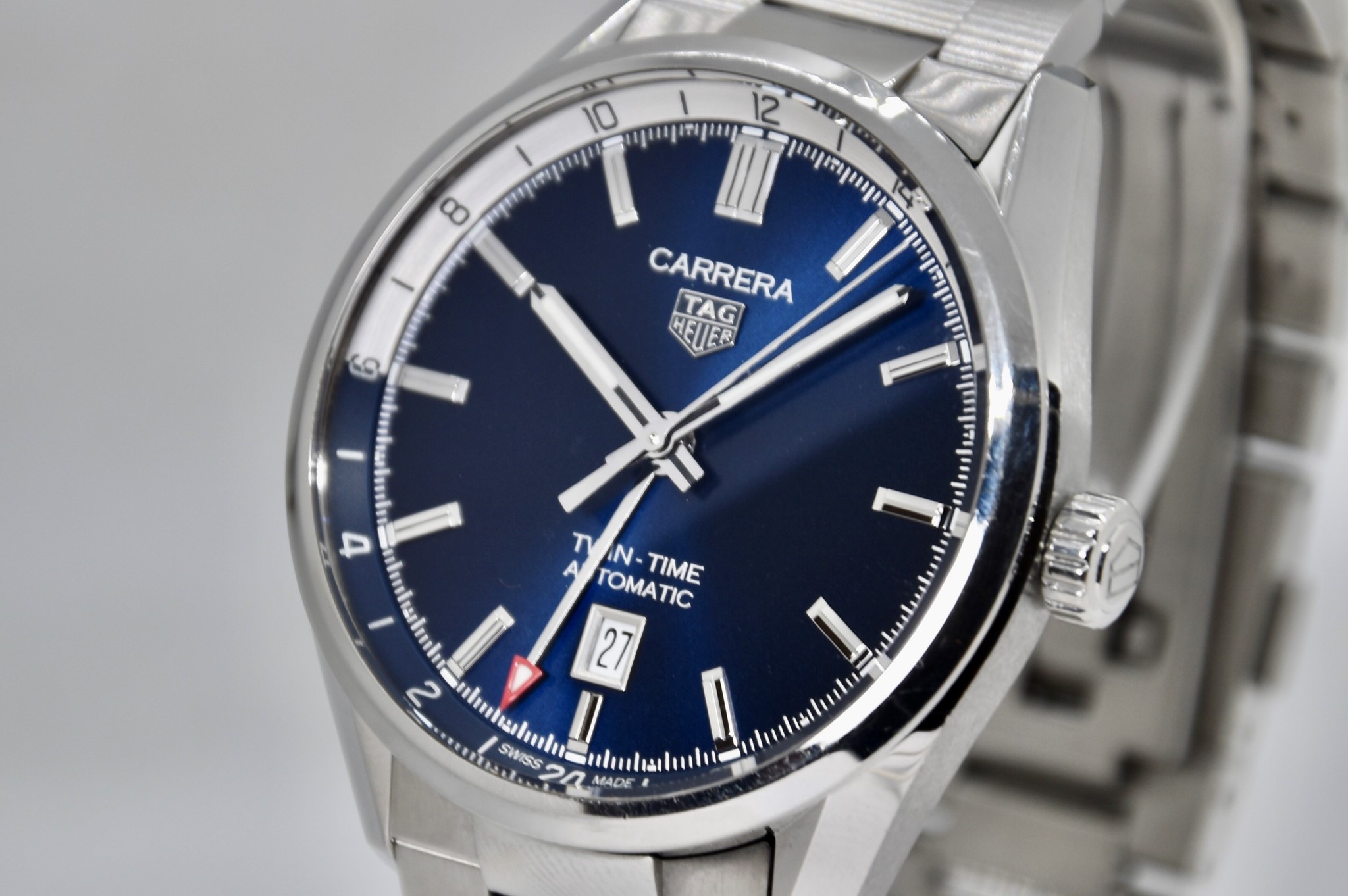 TAG Heuer Carrera Twin-Time ref. WBN201A del 2024. Orologio in acciaio in buone condizioni. Quadrante lucido blu con Lunetta interna Bitono grigio-blu. Movimento a carica automatica. Diametro cassa 41mm. Vetro zaffiro. Indicatore del datario. Indicazione GMT. Corona a pressione originale. Indici e lancette luminova con ottima lettura notturna. Con scatola e garanzia originali.